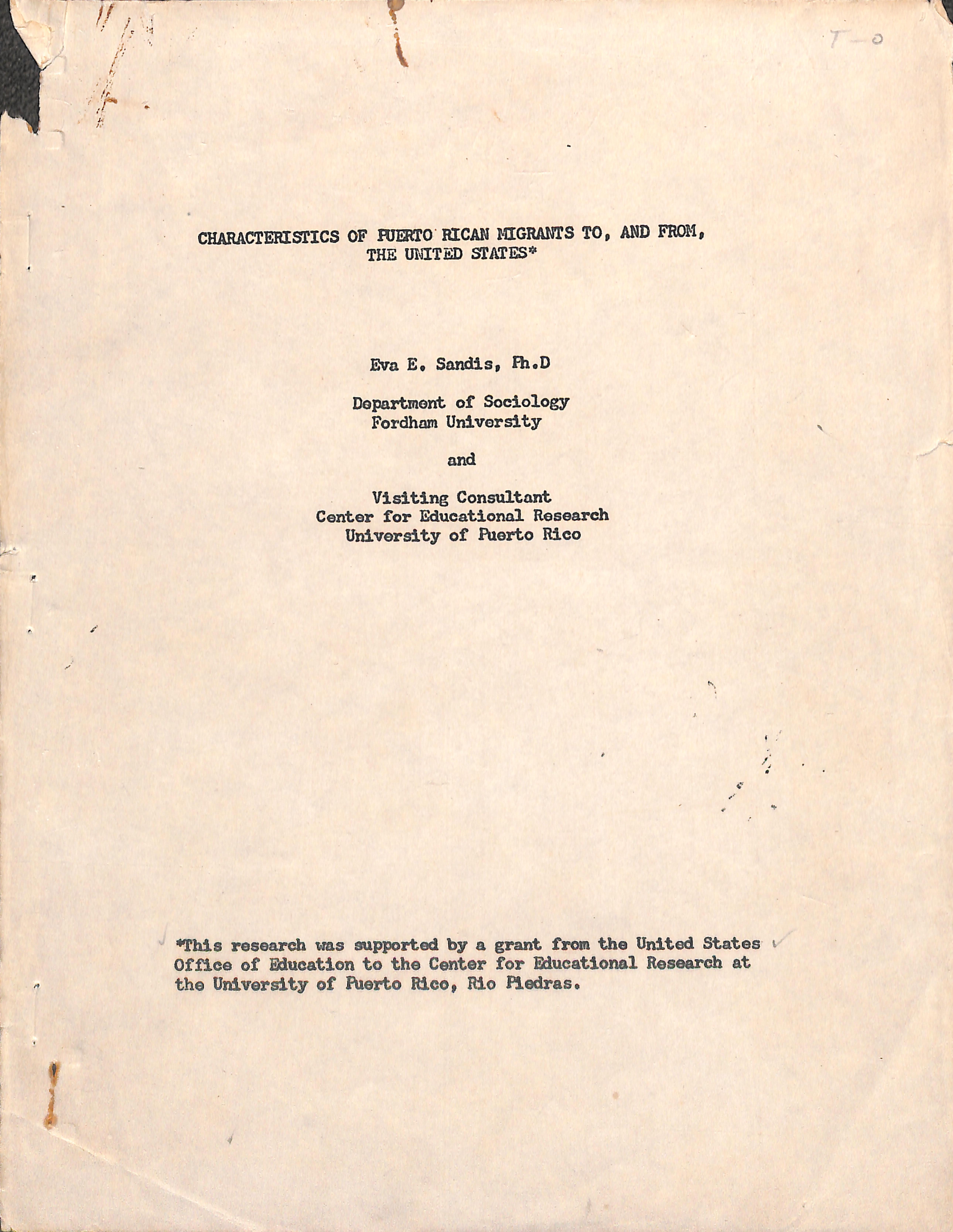I Tho objective of this paper is to assess the current state of our knowleige about the socio-ccomaaic and motivational characteristics of Puerto Rican rd-grants to, and from, the United States. Focussing on these characteristics of the migrants fiiakes it possible to detormino the significance of tho migration for Puerto Rico, by indicating tdiich population segments the Island is losing, and gaining. Ii- also enables one to see the significance of the move for tho migrants themselves.
