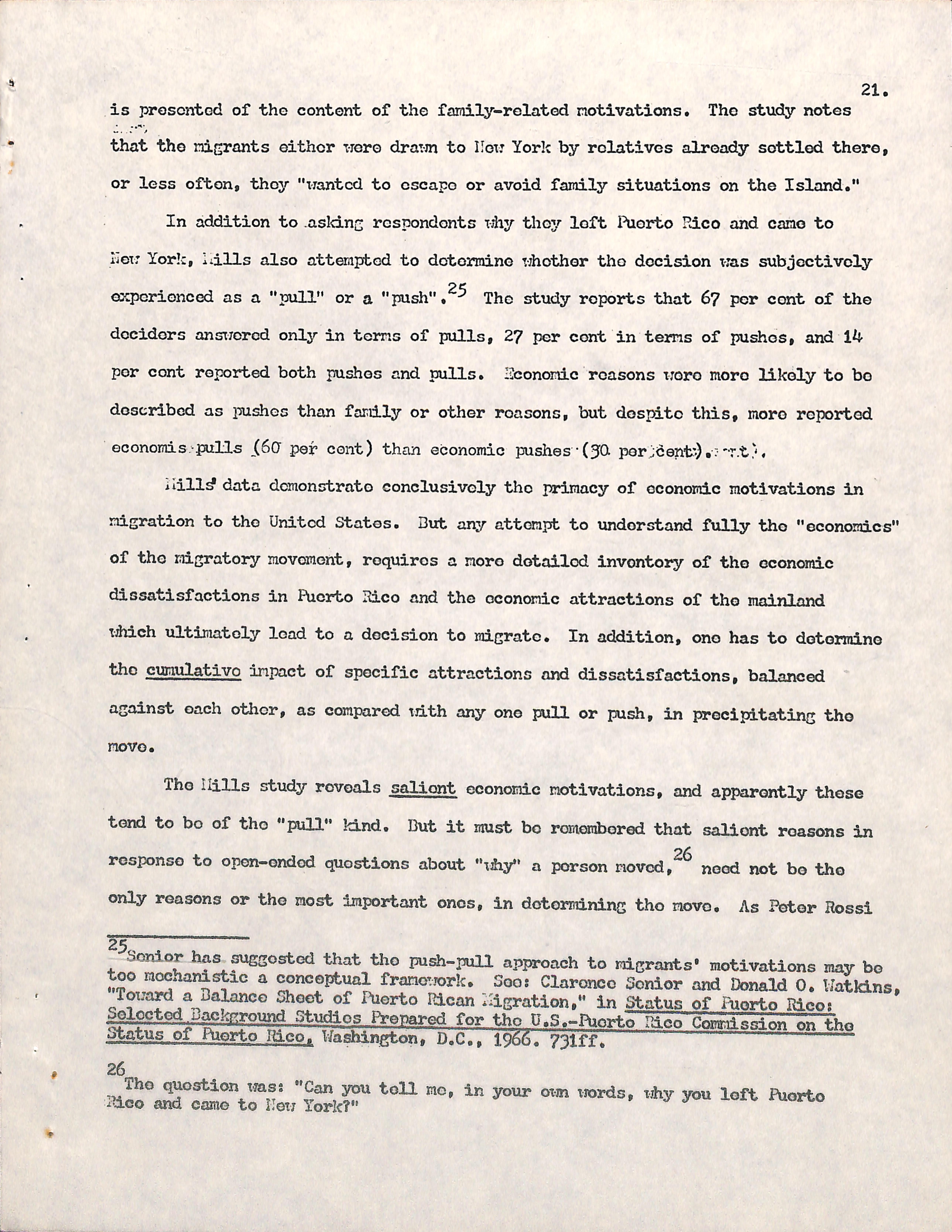 Tho Hills study reveals salient economic motivations, and apparently these tend to bo of tho "pull" kind. But it must bo romorabored that salient reasons in response to opon-ondod questions about 'hhy" a person moved, need not bo tho only reasons or tho most important ones, in determining tho move. As Peter Rossi 25,Senior has suggested that tho push-pull approach to migrants' motivations may bo too m^harustic a ^ncoptual framework. Soo; Clarence Senior and Donald 0. Uatkins, Toward a Balance Shoot of Puerto Rican Migration," in Status of Puerto Rico: Selected i^ackground Studios Prepared for the D.S.-Fuerto Rico Commission on the Status of Puerto Rico. Washington, B.C., I966. 731ff» ~