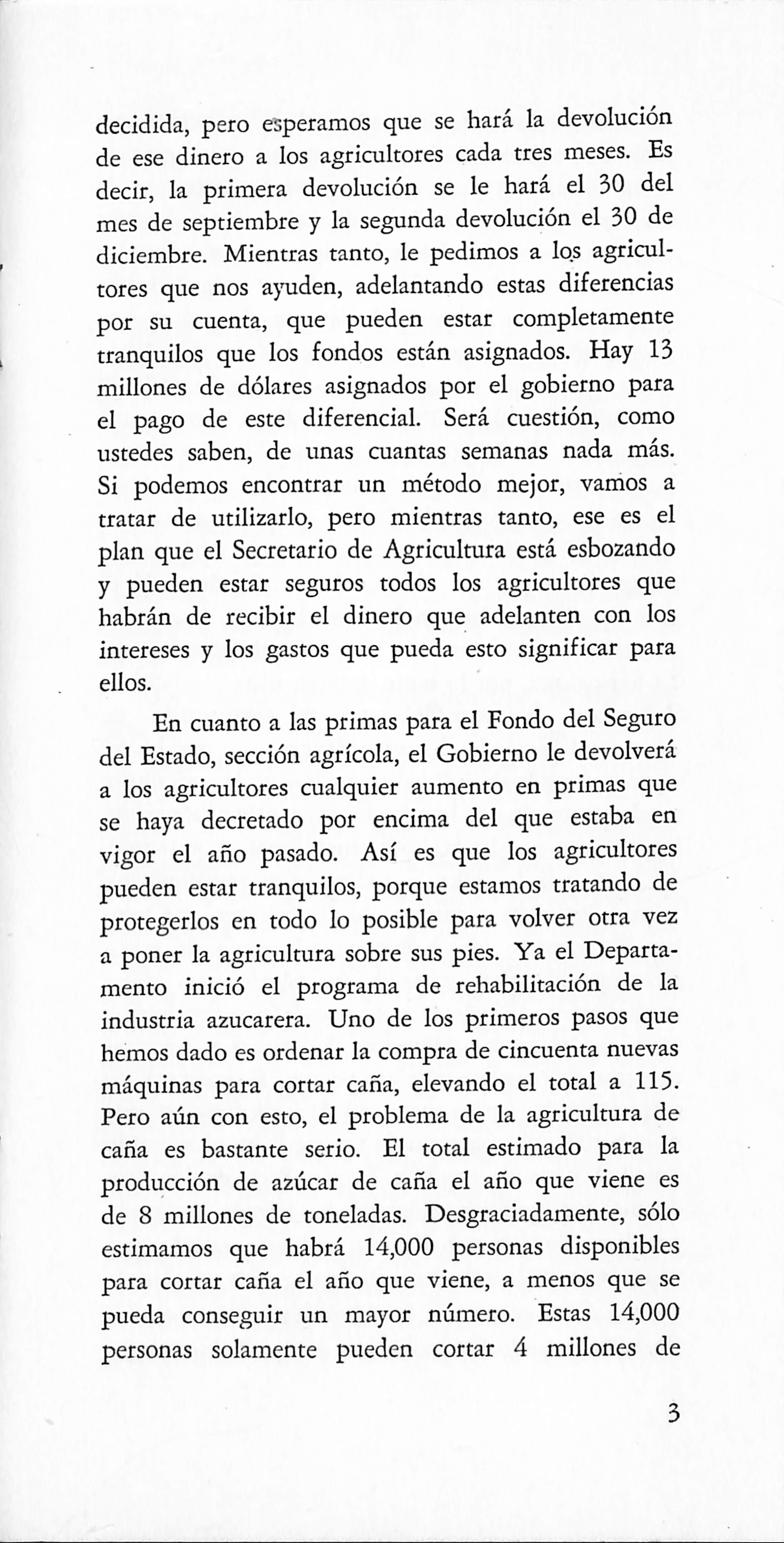En cuanto a las primas para el Fondo del Seguro del Estado, sección agrícola, el Gobierno le devolverá a los agricultores cualquier aumento en primas que se haya decretado por encima del que estaba en vigor el año pasado. Así es que los agricultores pueden estar tranquilos, porque estamos tratando de protegerlos en todo lo posible para volver otra vez a poner la agricultura sobre sus pies. Ya el Departa mento inició el programa de rehabilitación de la industria azucarera. Uno de los primeros pasos que hemos dado es ordenar la compra de cincuenta nuevas máquinas para cortar caña, elevando el total a 115. Pero aún con esto, el problema de la agricultura de caña es bastante serio. El total estimado para la producción de azúcar de caña el año que viene es de 8 millones de toneladas. Desgraciadamente, sólo estimamos que habrá 14,000 personas disponibles para cortar caña el año que viene, a menos que se pueda conseguir un mayor número. Estas 14,000 personas solamente pueden cortar 4 millones de