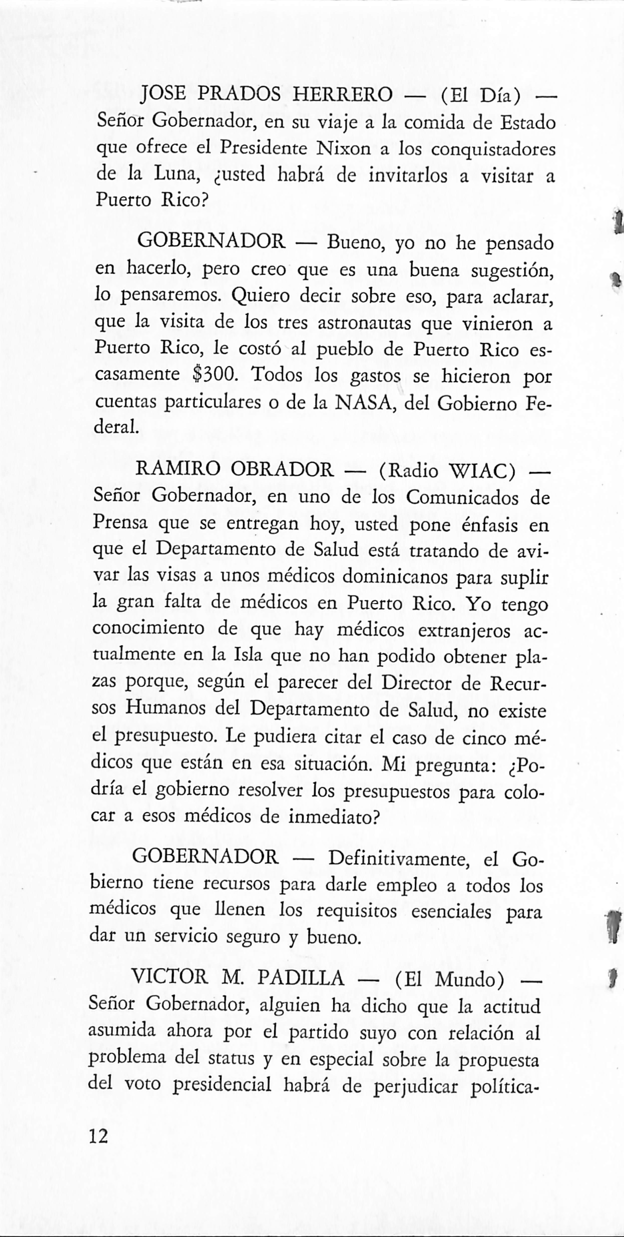 GOBERNADOR — Bueno, yo no he pensado en hacerlo, pero creo que es una buena sugestión, lo pensaremos. Quiero decir sobre eso, para aclarar, que la visita de los tres astronautas que vinieron a Puerto Rico, le costó al pueblo de Puerto Rico es casamente $300. Todos los gastos se hicieron por cuentas particulares o de la NASA, del Gobierno Fe deral.