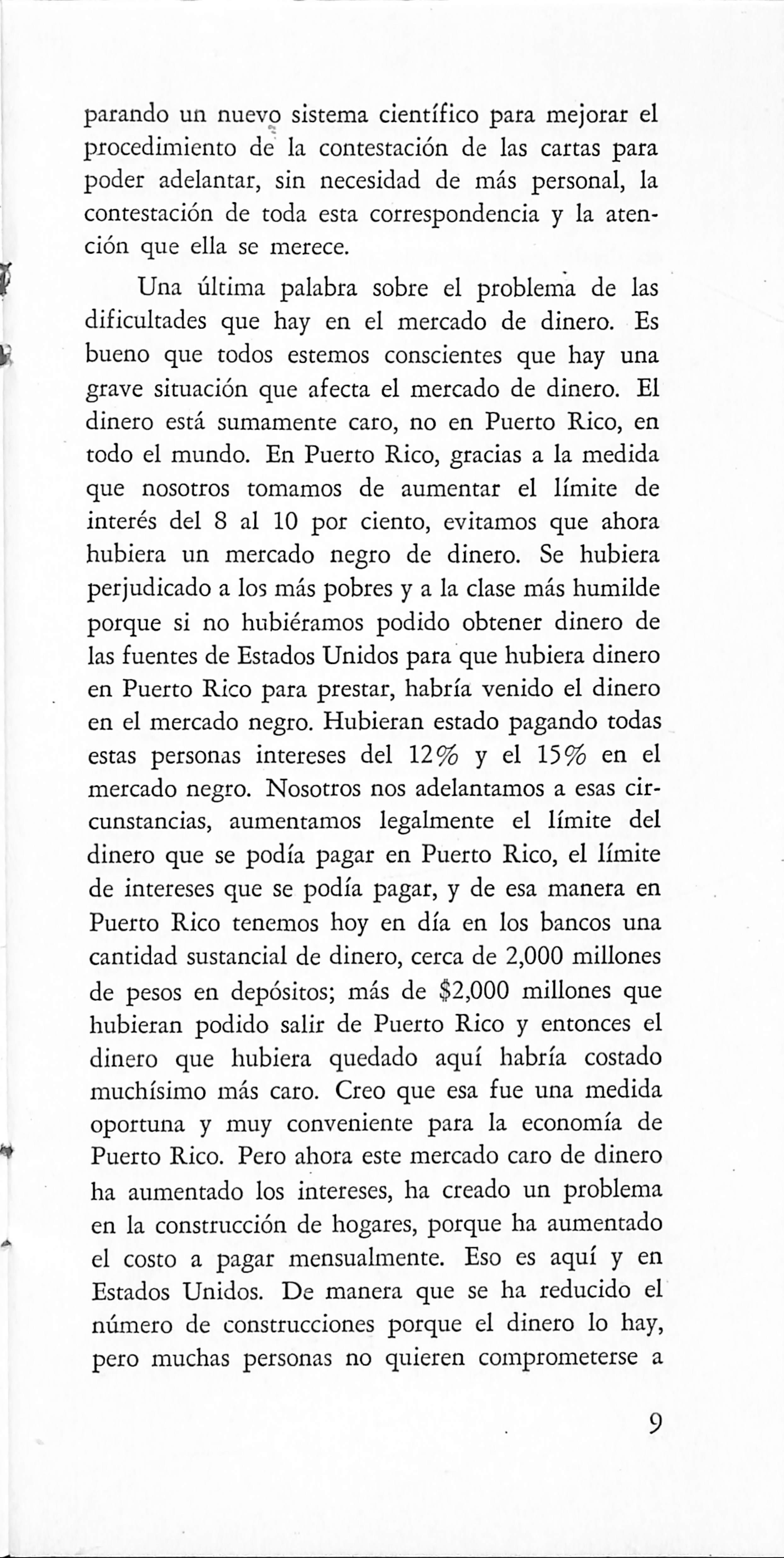 Una última palabra sobre el problema de las dificultades que hay en el mercado de dinero. Es bueno que todos estemos conscientes que hay una grave situación que afecta el mercado de dinero. El dinero está sumamente caro, no en Puerto Rico, en todo el mundo. En Puerto Rico, gracias a la medida que nosotros tomamos de aumentar el límite de interés del 8 al 10 por ciento, evitamos que ahora hubiera un mercado negro de dinero. Se hubiera perjudicado a los más pobres y a la clase más humilde porque si no hubiéramos podido obtener dinero de las fuentes de Estados Unidos para que hubiera dinero en Puerto Rico para prestar, habría venido el dinero en el mercado negro. Hubieran estado pagando todas estas personas intereses del 12% y el 15% en el mercado negro. Nosotros nos adelantamos a esas cir cunstancias, aumentamos legalmente el límite del dinero que se podía pagar en Puerto Rico, el límite de intereses que se podía pagar, y de esa manera en Puerto Rico tenemos hoy en día en los bancos una cantidad sustancial de dinero, cerca de 2,000 millones de pesos en depósitos; más de §2,000 millones que hubieran podido salir de Puerto Rico y entonces el dinero que hubiera quedado aquí habría costado muchísimo más caro. Creo que esa fue una medida oportuna y muy conveniente para la economía de Puerto Rico. Pero ahora este mercado caro de dinero ha aumentado los intereses, ha creado un problema en la construcción de hogares, porque ha aumentado el costo a pagar mensualmente. Eso es aquí y en Estados Unidos. De manera que se ha reducido el número de construcciones porque el dinero lo hay, pero muchas personas no quieren comprometerse a
