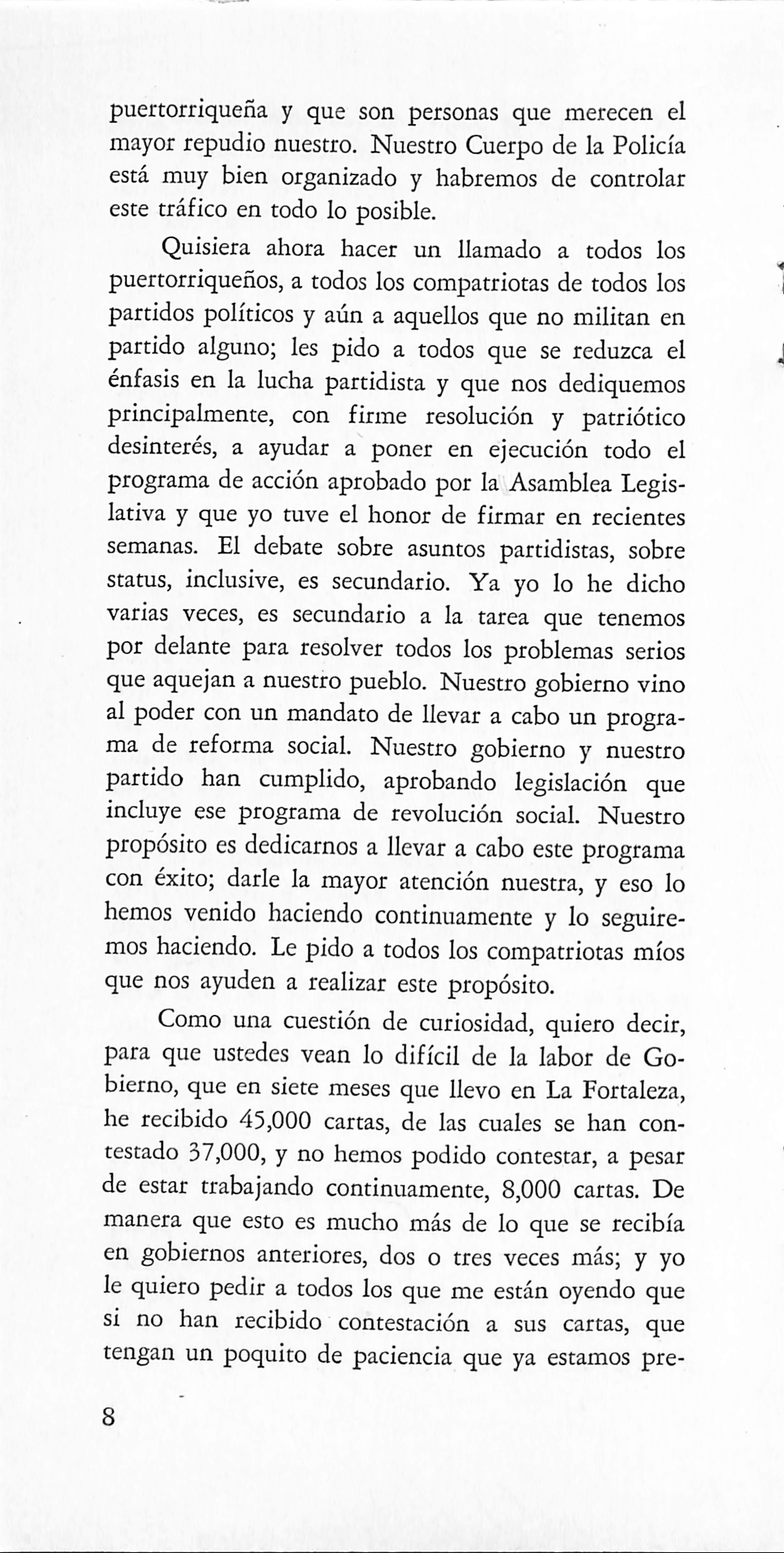 Quisiera ahora hacer un llamado a todos los puertorriqueños, a todos los compatriotas de todos los partidos políticos y aún a aquellos que no militan en partido alguno; les pido a todos que se reduzca el énfasis en la lucha partidista y que nos dediquemos principalmente, con firme resolución y patriótico desinterés, a ayudar a poner en ejecución todo el programa de acción aprobado por la Asamblea Legis lativa y que yo tuve el honor de firmar en recientes semanas. El debate sobre asuntos partidistas, sobre status, inclusive, es secundario. Ya yo lo he dicho varias veces, es secundario a la tarea que tenemos por delante para resolver todos los problemas serios que aquejan a nuestro pueblo. Nuestro gobierno vino al poder con un mandato de llevar a cabo un progra ma de reforma social. Nuestro gobierno y nuestro partido han cumplido, aprobando legislación que incluye ese programa de revolución social. Nuestro propósito es dedicarnos a llevar a cabo este programa con éxito; darle la mayor atención nuestra, y eso lo hemos venido haciendo continuamente y lo seguire mos haciendo. Le pido a todos los compatriotas míos que nos ayuden a realizar este propósito. Como una cuestión de curiosidad, quiero decir, para que ustedes vean lo difícil de la labor de Go bierno, que en siete meses que llevo en La Fortaleza, he recibido 45,000 cartas, de las cuales se han con testado 37,000, y no hemos podido contestar, a pesar de estar trabajando continuamente, 8,000 cartas. De manera que esto es mucho más de lo que se recibía en gobiernos anteriores, dos o tres veces más; y yo le quiero pedir a todos los que me están oyendo que si no han recibido contestación a sus cartas, que tengan un poquito de paciencia que ya estamos pre-