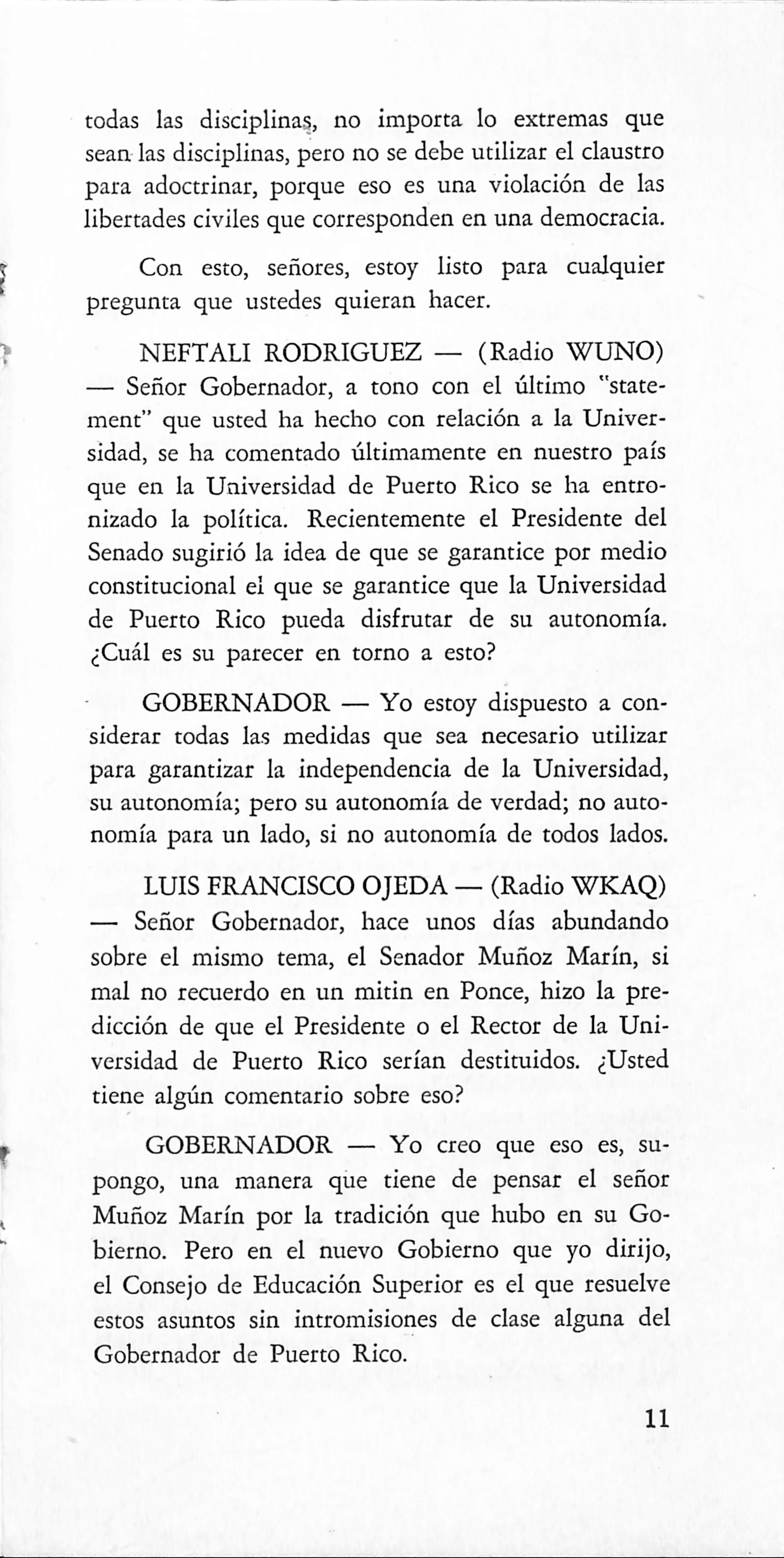 — Señor Gobernador, a tono con el último "statement" que usted ha hecho con relación a la Univer sidad, se ha comentado últimamente en nuestro país que en la Universidad de Puerto Rico se ha entro nizado la política. Recientemente el Presidente del Senado sugirió la idea de que se garantice por medio constitucional el que se garantice que la Universidad de Puerto Rico pueda disfrutar de su autonomía. ¿Cuál es su parecer en torno a esto?