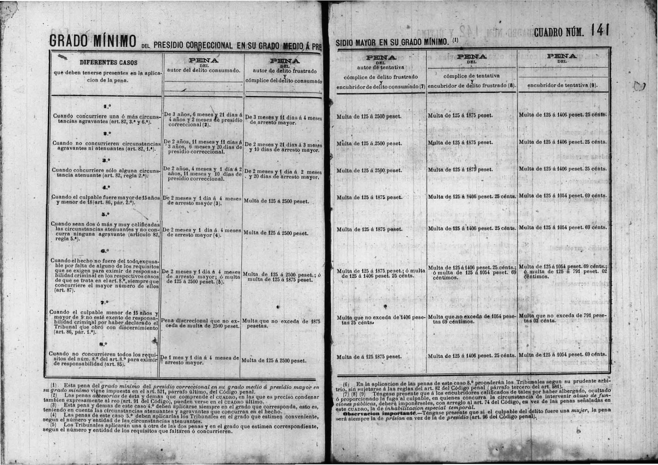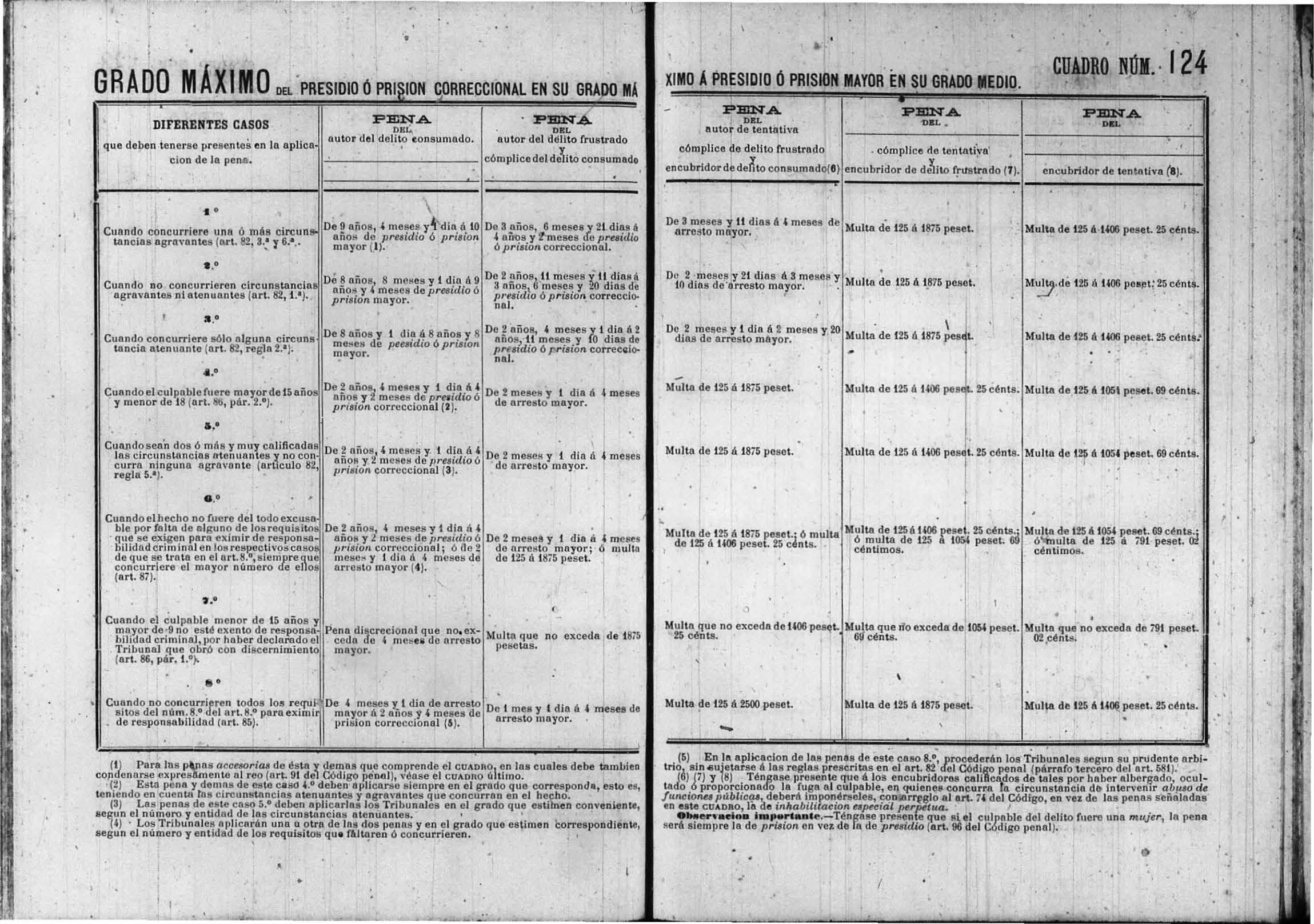 GRADO MÁXIMOºª PR SIDID ó CORRECCIONAL EN su CRAOO ME DI FERE!ITES CASOS en te nerse presenr "e en la aplica del ci elito do nsumado auto r de de lito frustrado c 1on de lo p1.?,1ca. , có mphce d el delato consumado .. Cuando co ncurriere uno ó més c ircuns· De.z a ños , 4 mulla YJpdio 8 De 1año,8 meses Y2t dlefs.f1 ! tan elas ograwrntes (nr t .82. a. • Y 6.• J. 6 r laio11 • .. , 66 ¿ •.. t5aii os 2 6 ú 2·mcsos de • 1 • • • cor recc 1o nol (1 ). •• .. • .. Cuando el hecho no ru ere de l t odo excuso ble por fn lt o de algun o de loa requisitos Oc Gmese s y t din t\ 2 nños J 4 que se exigen poro eximir d e respon iso · me ses de 6 pri&ton De 1 mC.il y 1 dio li 2 meaca de tii lidodcrl1Rina l e n los r esJ!ectl ,·osc1u10A co r reccional; (J de 1 me i:.1 y 1 orre.;;to mayor; 6 mul t o def4t1eses de orrcilto t.25 á 1875 pcse t (art. 87). . .. Cuando e l c ulpnbie- menor de t 5 aiíog y • Multa q(ie no exceda de 18i$ 1 Tribuna l que obró con dlscernimient4 mayor. peset a•. (ort 86, pAr. t .•¡ · fl.• . Cunndo no concurrier en tod os los De 4 mesc!J y _1 dio de arres to De f mes y 1 d·a t\ 4 m sea de p(lracxiuii de orreato e (1) Los peno s (lcctaorfot de óst a los que 011 prec iso co nd e nlr t.nmbi e n exprosomc "1c ni reo (ort. 91 Ultim o. 1i ¡ Esta pena y demo s de es que corres po nd o, est o 4 teniendo en cuento: lo.s clreu ns t cias en en e l hecho (SJ L • de odo qoe 88tlmen conve ni ente, "f.} et y e n e l grado que estimen cq rre s pond len te, segu n e t n J o.d de los requisito s que fo.Iteren ó co nc urrieren. 1 DIO Á PRESIDIO ÓPRISION MAYOR EN SU GRADO lútlMO. · CUADRO NÚ!. 122 autor de t e nl.ativo PBINA .... cómplice de de li I fr uatrado cómpllco de tentativo. e n cu,,b rid<?r de dliito frustrado (7Í. encubridor do tentativa (1) 1 Do t me s y , 1 di aa á 2 me ses do Multa de 125 • 1875 º'""'ºmoyo•.1 1 • • pes.• : Multa de 125 1\00 peODt. !5 cénts. Do l m es y 11 t mes y!OM 1 dios,. do o. rr m yor; , u. ta de 125 6 187., peset. Multa de 125 .r 1400 peseL 25 cénts • Oe 1 mes y1 dia d t mes y 10 dia11 M Ita d 125 6 1g75 \ de1 arresto mayor. 1• u e pese Mul ta do 125 A U06 pesct. 25 cé nts. 1 · , . . Mul1n de 125 r1875 peset. i Multa de 125 t\ UOO pese\. 25 cén t s Multo. doJ25 ó. 1054 G9 MG!ta 'de 125 'á 1875 1 ; Mult a de 125 6 1406 pe set. 25 cénts. 125 i\ 105' pose t . 69 c énts. 1 de 12s1. t8i5 o multa Mu_ Jta de 125 á UOO peset. 2S cén · do l !U t OM pc!'e t 69 cé n detl!.·j f!5 (L U QG pese t . 25 cén\B. tlfllOBi., Ó JllUl t O de 125 á Jl)M pO · Ó nHJlta de 125 Ó. 191 peset. UZ aetas t>9 cénlS. d ntl moa. ¡ • . 1 . 1 . . Multo que no exced!Jde l 406 peqL no exceda pe s et. Multo <¡u e no exceda deW t peset. 25 cénts. l 69 cén . °' <¡<! •"· • 1 1 Multo.\.de 125 á 2500 pe set · Multa de 125 4 peset. Multa de t 25 6 14:06 peaeL. 25 cénts. 1