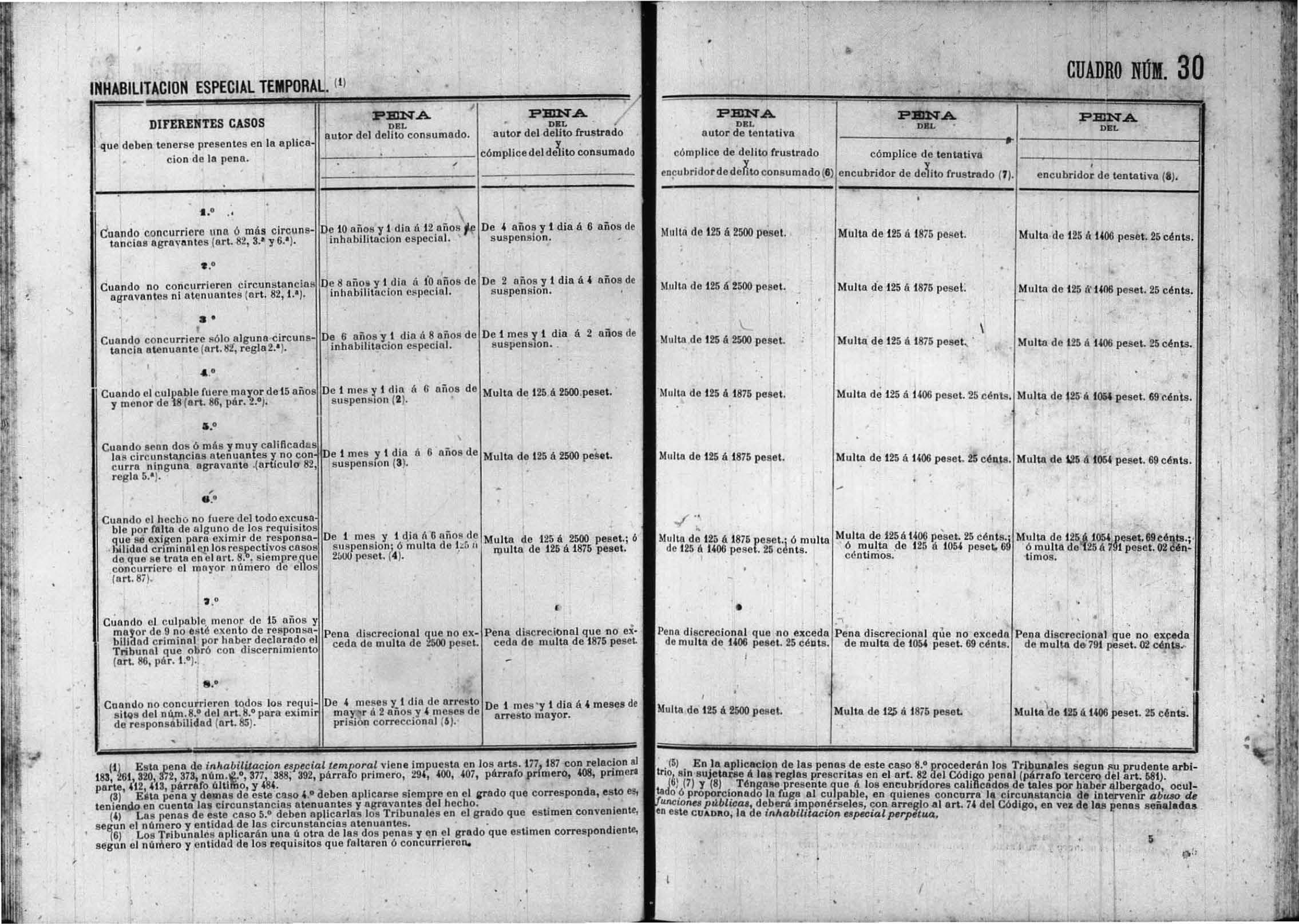 I 1 f INHABILiJACION ESPECIAL TEMPORAL EN SU GRADO MiNIMO . u1 J DIFEllEll TES CASOS / au to r del delito consuinado. nutor de delito fruatrodo que deben In oplica \\--------- cómp lice de l J • •·º . n e 7 años 4 meses f din\ ' i.;oand o con c11rr1ere 11na ó más c1rcun• andoe, meH!i f I die t\ 6 tan e las ng ro, on t e s (ort. 82, S.• y6.1 ) cio l. a nos e su•pen11f" · • .. Cuando no ogrnvan 1c1:1 m otenuontes (nrt. 81! , l. ) ta clon espeeinl. sio n . • .. concurriere só lo a lguna c lrcun s- l 8! De 4 a ños Y f din 6 4 años Y8 atenua nte (nr t res ln 2.1 ) ¡ieclol. meses de su gpcniuon. .. . Cuando Sean dos ó"mt\s y muy co ll la s c ircu ns tnncin s ntcnua ntcs c urra ninguna ng r a,·aotc (a rt regla5.• ). .. • .. e 4 nños y 1 din á 6 años de De 2 años y 1 dio á 4·años de su11pen11ion (I }. s u11 pen11lo n. ' Pena disc r ecio na l no ex- Pe n o diacreclonol que no exblll<lad cri mina l por habe r decla r a d o e l cedo de 4 anos de suspc n- cedo. de 2 nños de susptm· Tribunal qu e obró con dlscemlmien lo sion. s lon . (a rt. 86, pár. t.11) • .. i. ' meses de de r eapon.abllidnd (art. pri s lon co rreccio nal (5 ). · CUADRO IfOI. 29 '1"SNA P:BIN.A O B L a ut.or de t e nta ti va OBL có mpJice de delito fr ustra do cómp li ce de tentativa enc uridordedefit.oco naumodo (8) e ncub r idor de dliit.o fr u strado (7J. encubñdo r de tentativa (I J. , .1 De 3 oños', 4 f!I hes y t dia 6i 4 niioa Do t año, 4 meses y t dla á ! años >I 11 d 1 1 25 , d2500 "s us pe na1o n do sua penslo n u a o 11 posot. De 2 nños, 8 m eses y l dio á 3 años De 8 me ses y 1 dioá 1 nño y 4 fue 11,I 11 d :t2500 ' meses de su8pe naion. • sea de auape nsi o n. u a e pe ae i . t din á 2 años de 8 US· Multa d e 125 á 2500 po se t. A-futta de 125 á t 875 peae t l din á 2 nñ os da sus Multo. de 125 6 2500 pese t . Mu lta do t 25 t\ 1875 pése t . ("" De t y t din •t\ 2 años do 8 \I S · • \ Y pension·· ó multa do 125 á 2500 Mu lta de 125 i 2500 peaet.; ó mu lta Mulla de 125 6i t 875 pese t .i d mul ta pese t u: de 125 ¡\ 1815 peae1. • de t 25 'uoe pese l 25 ceo.la. . Pe na dlscr ecio nal qu e n o exceda P e na dls e r ecio n nl ;,uo no excl da Pena dlsC r ei:,lona l que no ucedft 1le multa de 2500 pe9et de mu ltn de 1875 peae t. de mu l ts de 1'06 peae t. 25 ct! n'\s , Multa do t t5 2MlO petet. Mu lta de 125 t\ 1875 peae t Mu lta de. 125 i 1406 peae t . !5 cf! n \8. ./ I • .. 1 1 i ' .l ' 1 ¡1;. .. .,, l ' .' •• " J i'· i ' .:IJ h b
