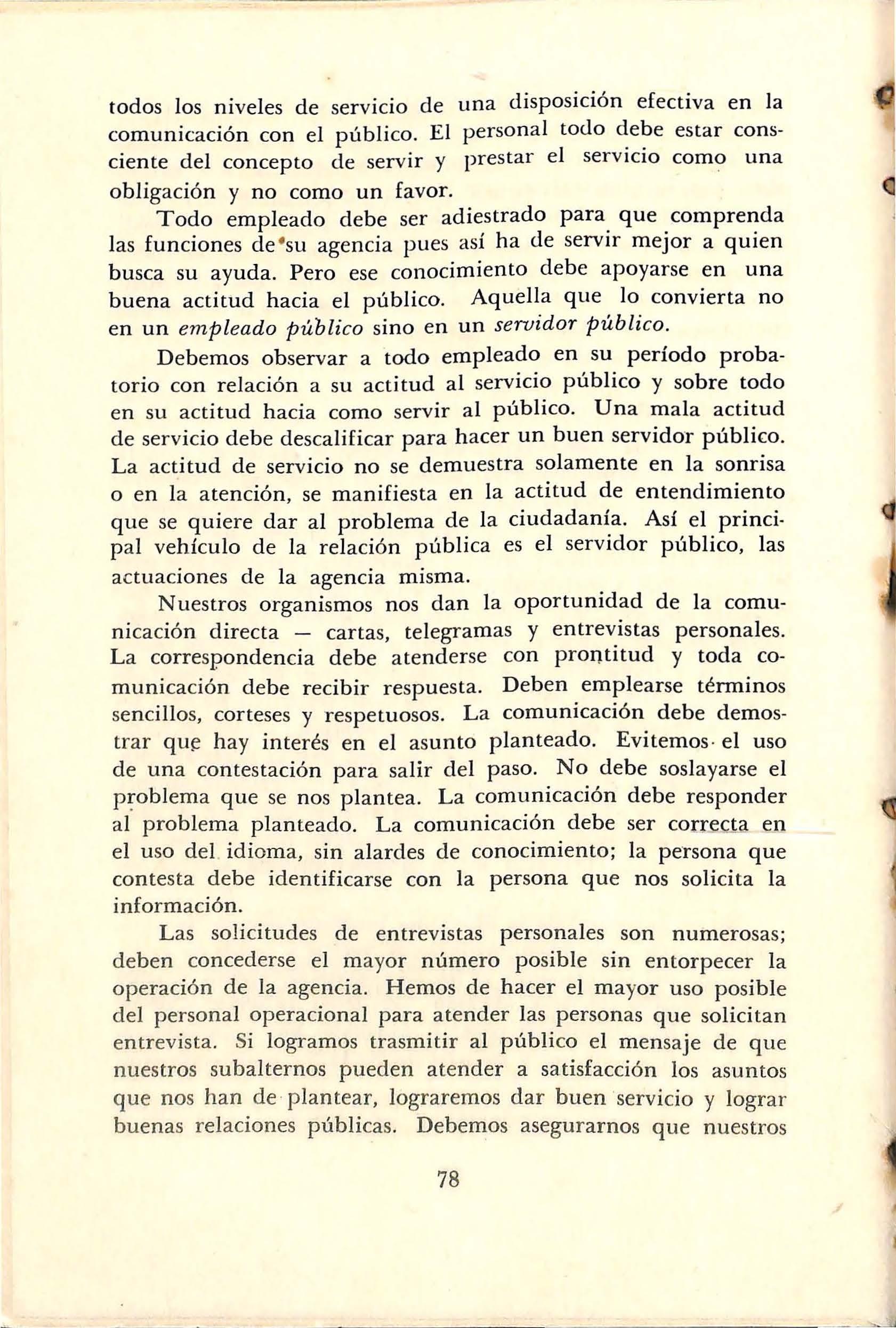 La comunicaci ó n con el público es producto mayormente del di a rio servicio que se presta al ciudadano. Más vale un ser vicio bien d a do con corte sía y entendimi.ento del problema del ciud a dano que muchos artículos y muchos <lis.cur sos . Así como el servicio público no se fundamenta en el criterio de correligionario s políti cos, ni se h a ce una obra en beneficio de determinado p a rtido político, a sí tampoco las r e lacione s p ú o lica s se fundamentan en servir a correligion a rio s o divulgarles ex cl us i va mente a és to s las obra s de gobierno. Se fundament a en e l serv i c io a to d o c iu da d a no. E l ser vicio por igu a l a todo s es una d e n ues t ras me j ores re l ac ione s públi cas y un a se p ar a ción del servic io y l a propaganda.