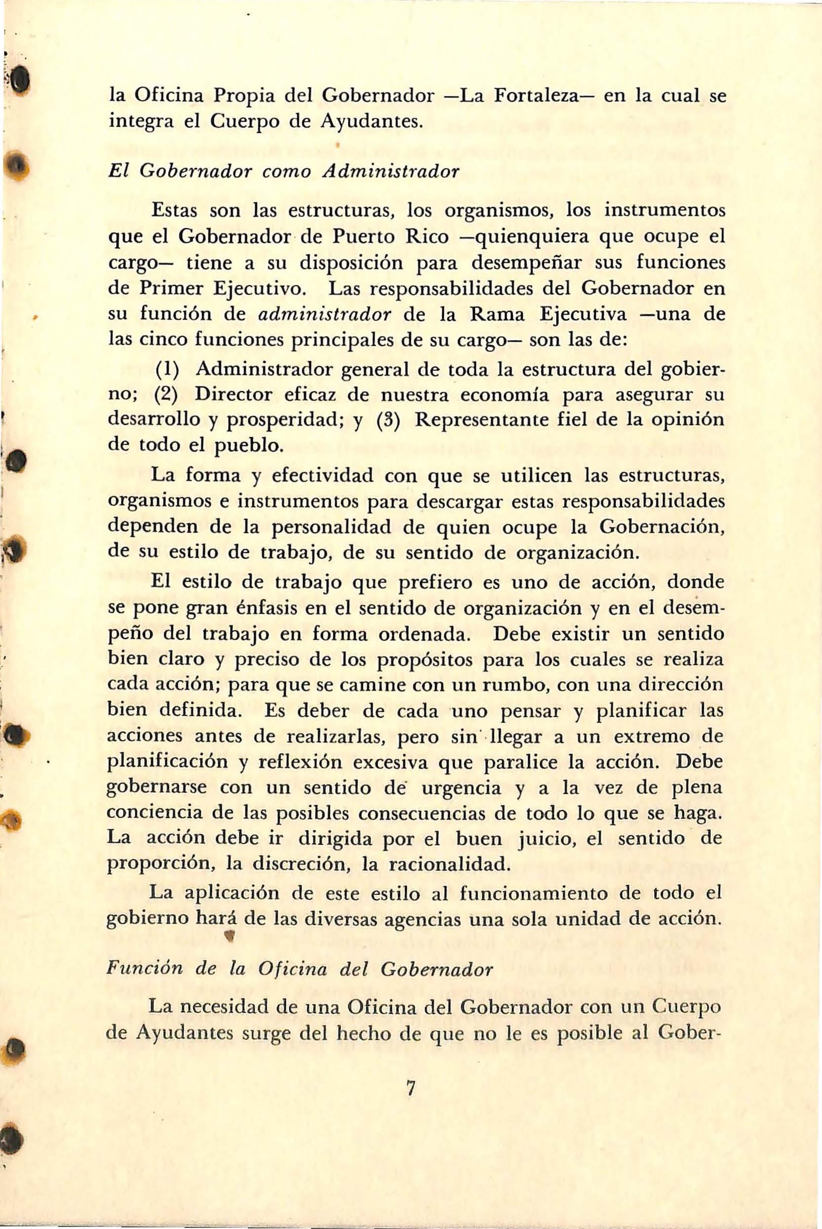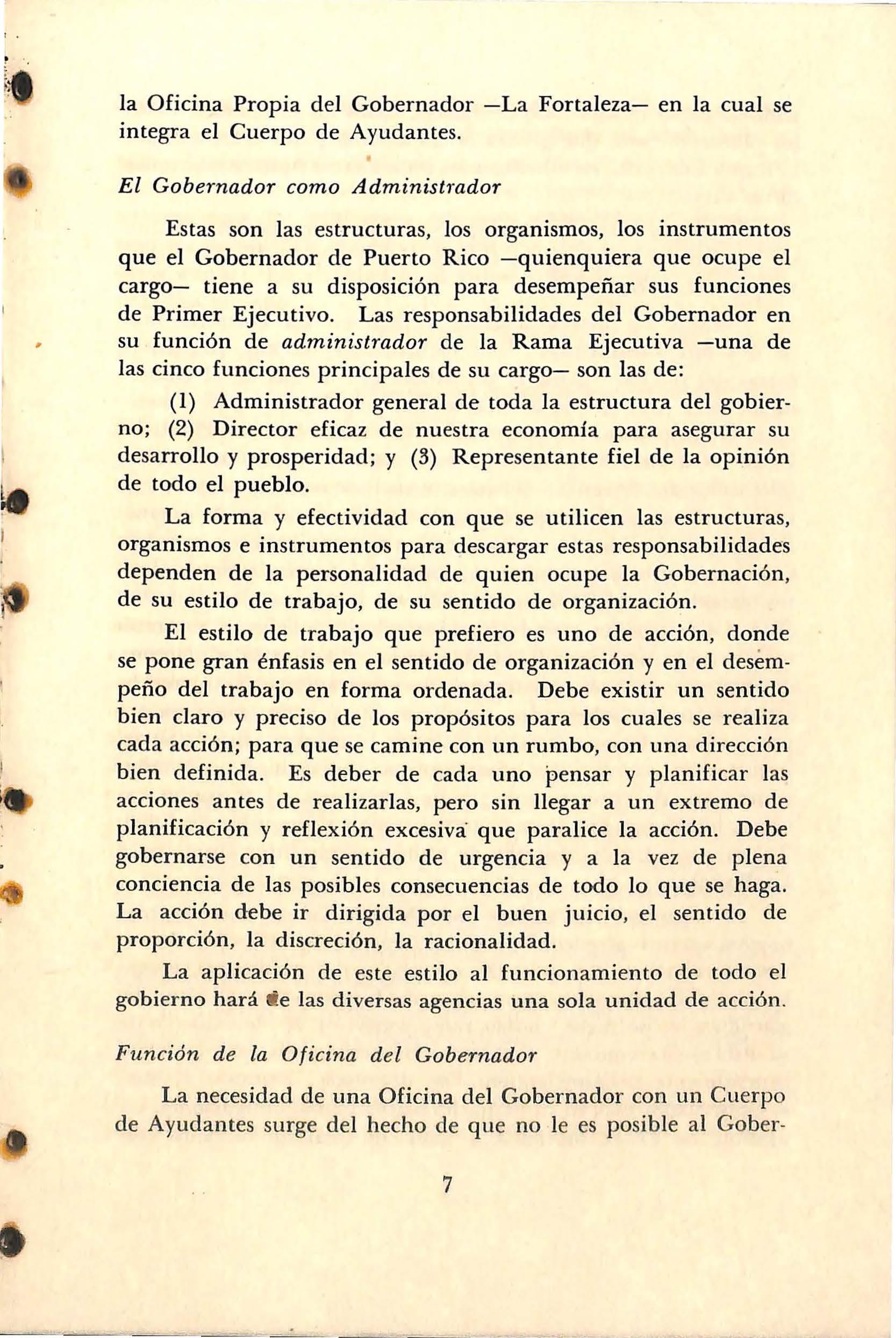 He esbozado aquí algunas cuestiones fundamentales referentes al funcionamiento de la Rama Ejecutiva y a los servicios que de ella requiere el pueblo. .Las . he dividido, para propósitos de claridad y organización, en siete temas principales, elaborados alrededor de dos preocupaciones fundamentales: el funcionamiento interno qe la Rama Ejecutiva y sus relaciones en la acción con el resto de nuestro gobierno y del país . Los temas que he de tratar son: La Oficina del Gobernador, Las Oficinas de Asesoramiento, El Grupo de Trabajo, El Poder de Nombrar, Relaciones con la Asamblea Legislativa, Relaciones con los Municipios, y Relaciones con el Público.