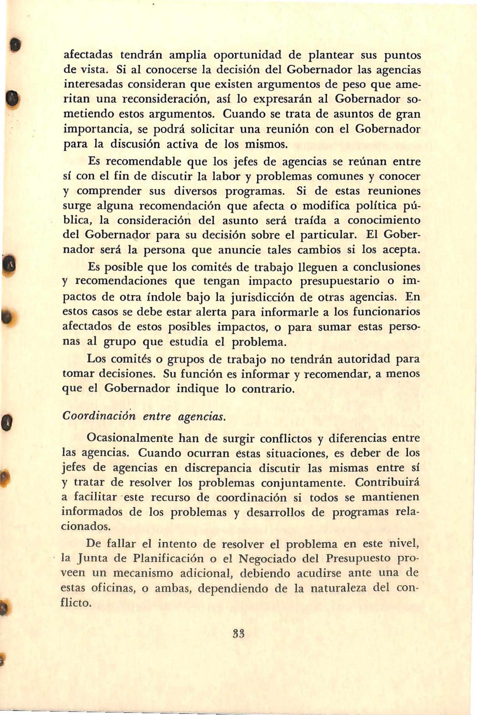 No debe recurrirse al Gobernador a plantearle problemas o a buscar respaldo para planes sin antes haber consultado, en lo necesario, a las agencias de asesoramiento. El Gobernador ha de hacer las mejores decisiones sobre un programa, y para ello requiere la mejor información posible.