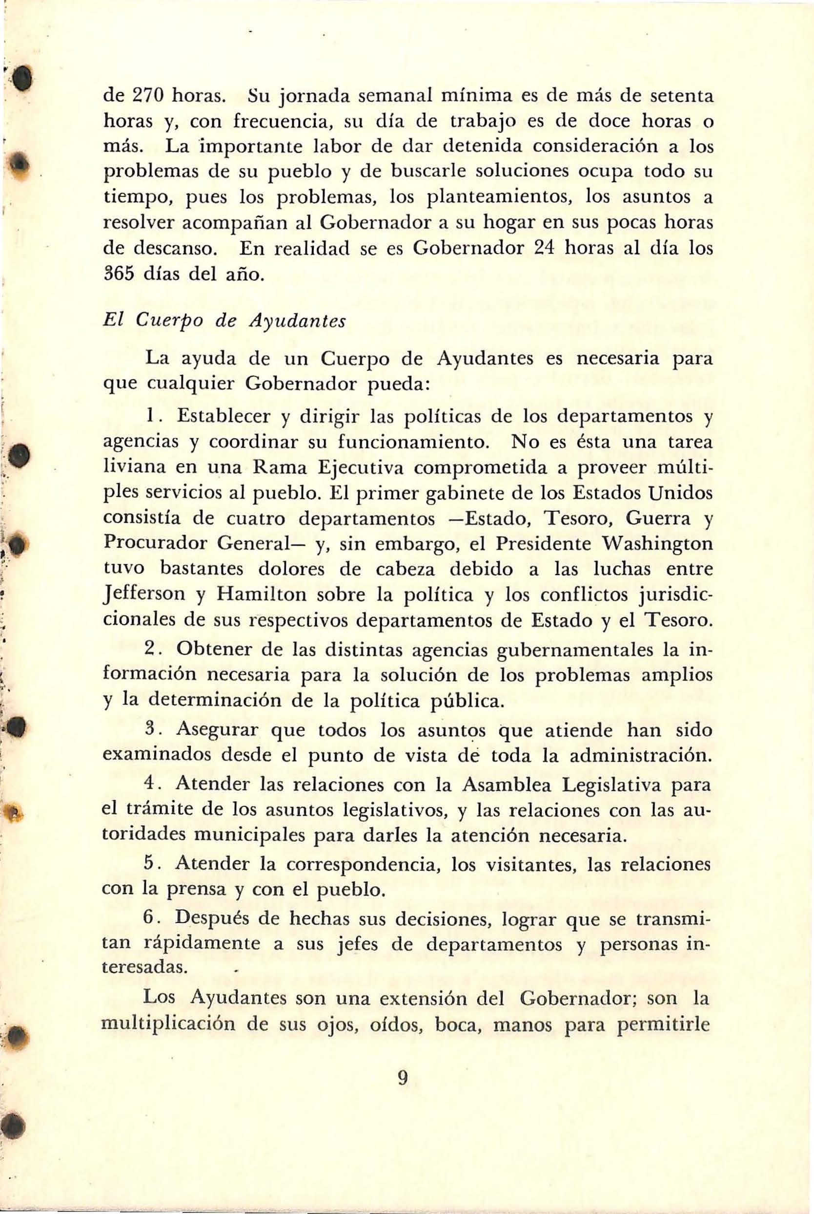 La encomienda del Gobernador es . una de tarea completa, no en el sentido de horas diaria s de trabajo. Es tarea presente n o importa el sitio o la hora donde se encuentre. Se es Goberna dor l as 24 hor as del día . En el cur so de ese horario inflexible y agobiante se ve obligado a ha:er que afectan, no sólo el curso de acción de las a genoas smo lo que es más importante, afe ctan a la vida toda de Puerto Rico: su economía, sus recursos humanos, su polític a, su cultura, sus valores, en fin todo lo que sos tie ne, define e impulsa a un país .