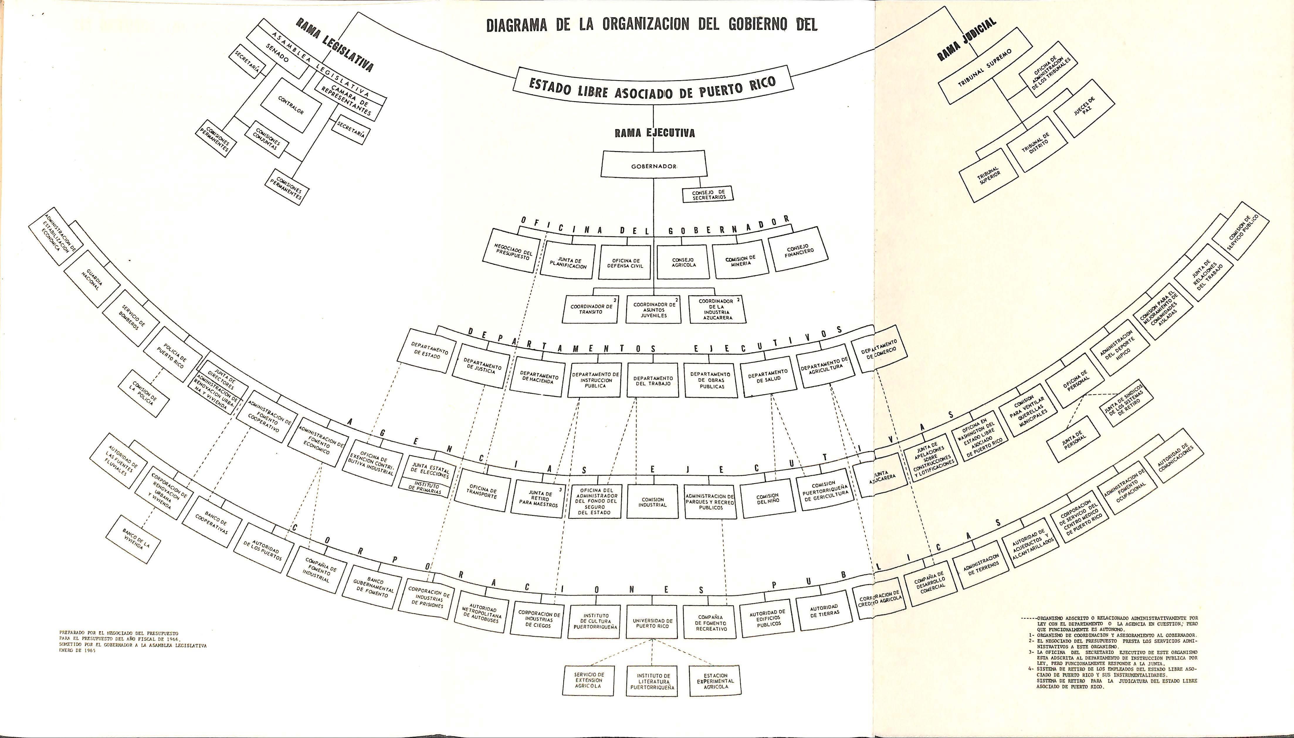 (1) Nueve departamentos constitucionales o ejecutivos Estado, Justicia, Hacienda, Instrucción Pública, Agricultura, Obras Públicas, Salud, Trabajo y Comercio; (2) treinta y una agencias ejecutivas y comisiones; (3) veintiuna corporaciones públicas; y (4) la Oficina Ejecutiva del Gobernador, la cual incluye los tres organismos de asesoramiento institucional - el Negociado del Presupuesto, l a Junta de Planificación y la Oficina de Persona l - más la Oficina Propia del Gobernador.