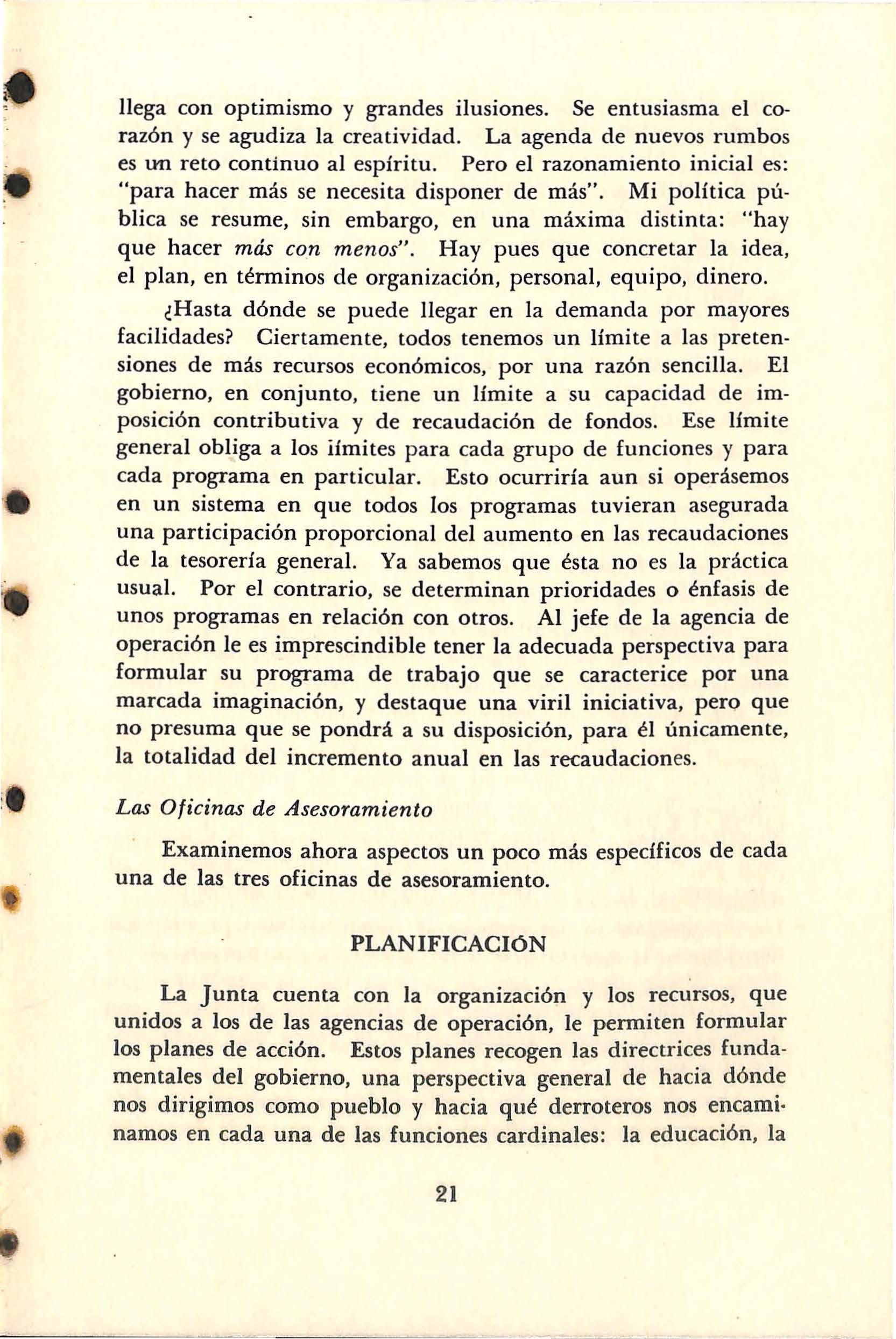 Existen en nuestro Gobierno tres ayudantfas zadas: la Oficina de Personal, la Junta de Planificación, y el Negociado del Presupuesto. Analicemos la encomienda que debe tener cada una de ellas, y las tres en conjunto, en la tarea común de gobernar a nuestro pueblo.