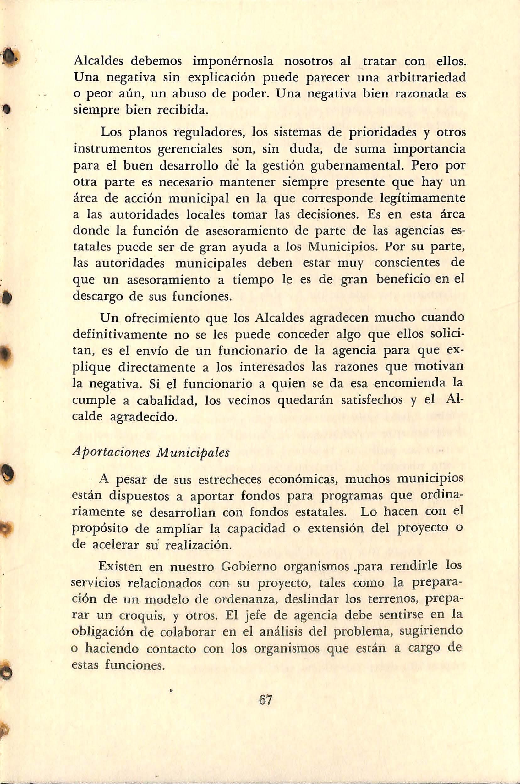 Los funcionarios municipales representan en su esfera de acción al pueblo que al elegirlos les encomendó su defensa y protección. Tienen que gestionar pór obligación cuantos proyectos llenen necesidades genuinas de ese pueblo. Al nivel local se hace. todavía difícil distinguir la diferencia fundamental que existe entre el partido político en el poder y el Gobierno. Por esta razón las autoridades locales insisten a veces en que se les complazca cuando rto puede hacerse. En esos casos la negativa debe ser firme pero correcta, cortés y sobre todo bien razonada