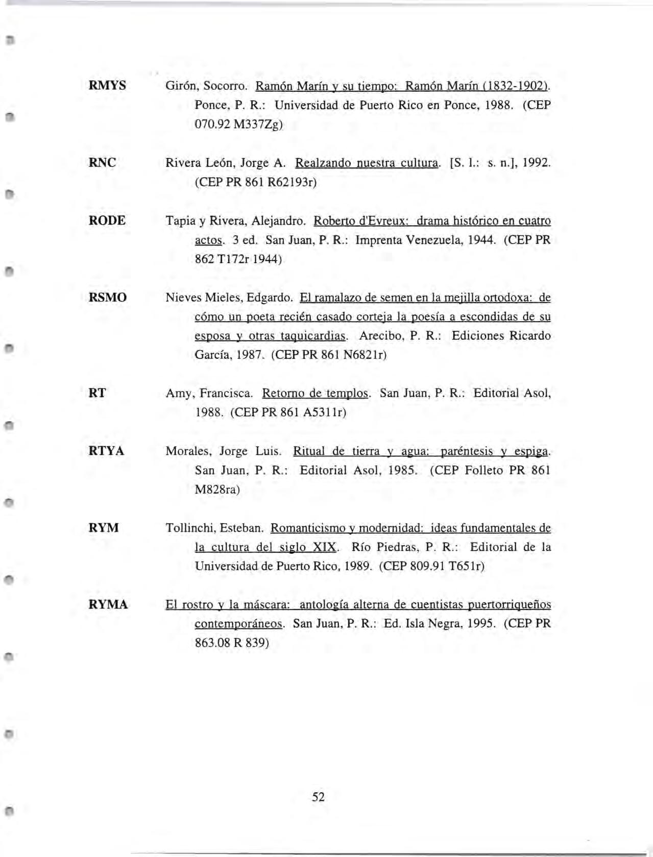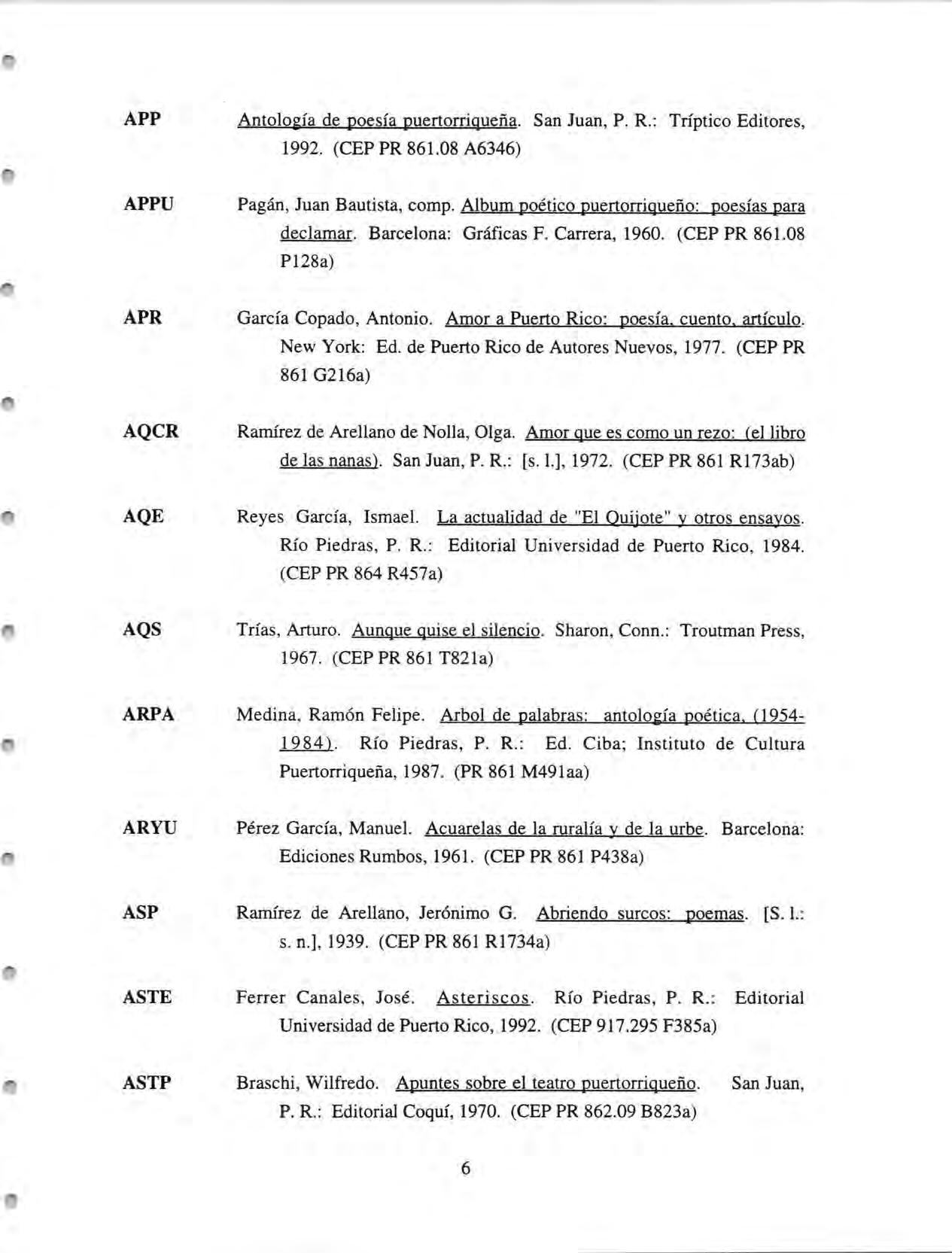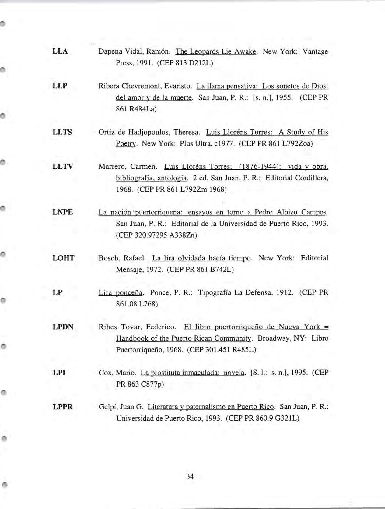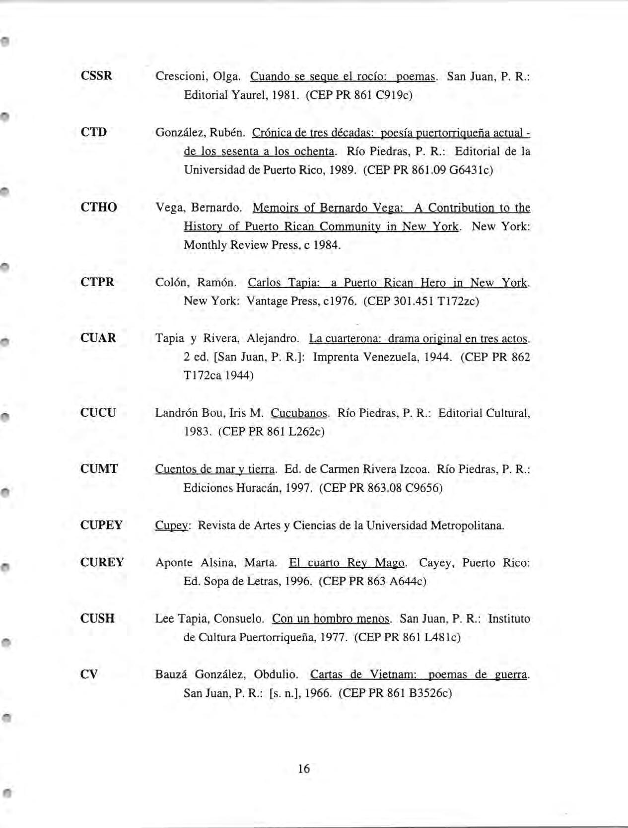 Para localizar el tftulo completo de la fuente se referira a la primera secci6n "Siglas", donde a continuaci6n de las abreviaturas de las fuentes utilizadas se encuentra la referencia completa del recurso. Hemos inclufdo la signatura librfstica del recurso en la colecci6n de la Biblioteca de la Universidad de Puerto Rico en Ponce para agilizar la busqueda a nuestros usuarios. Ejemplo: