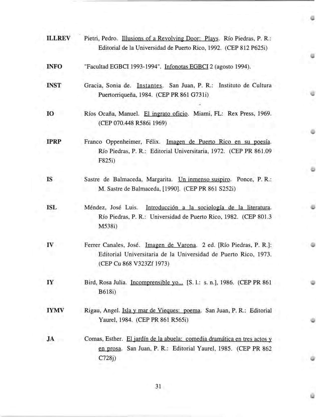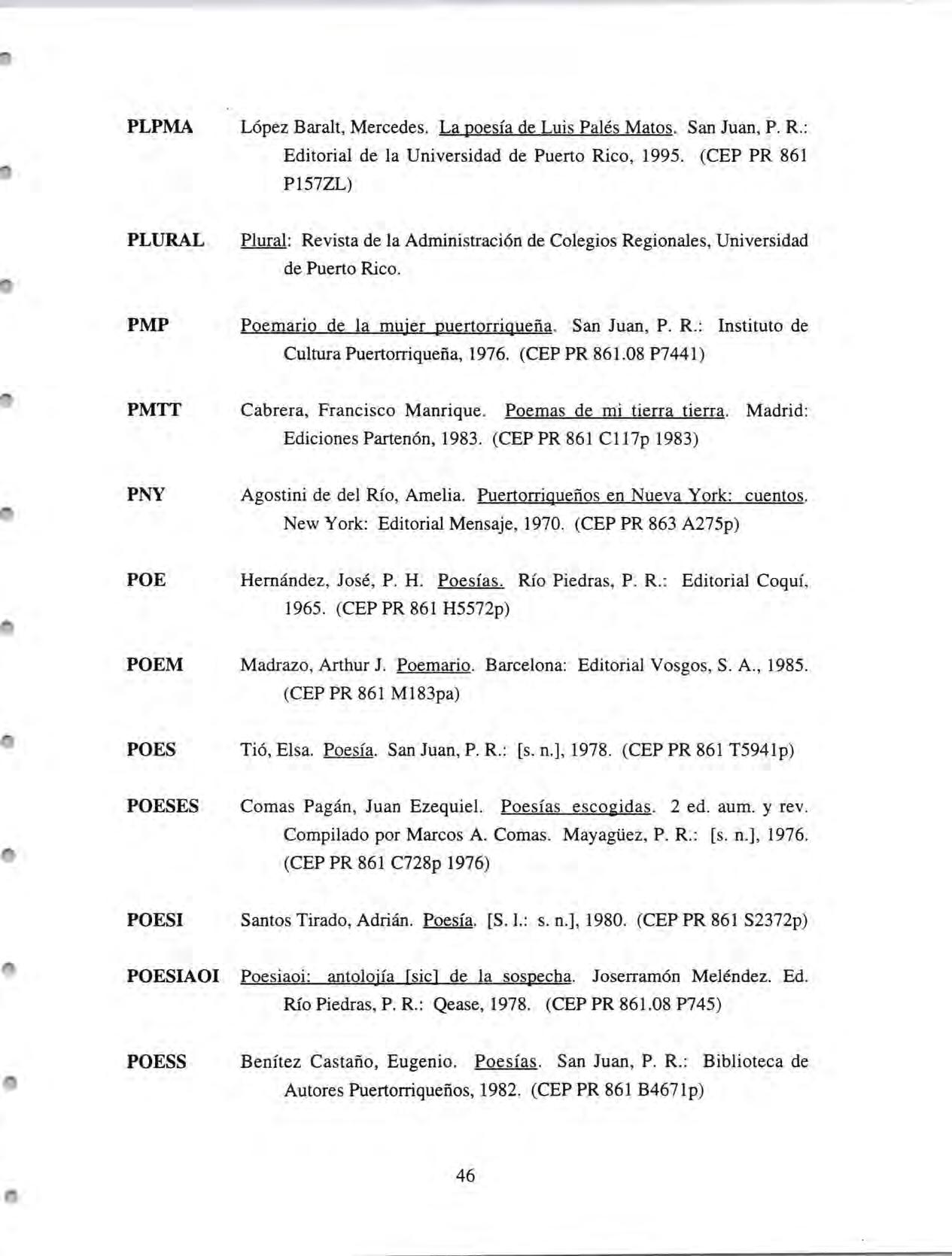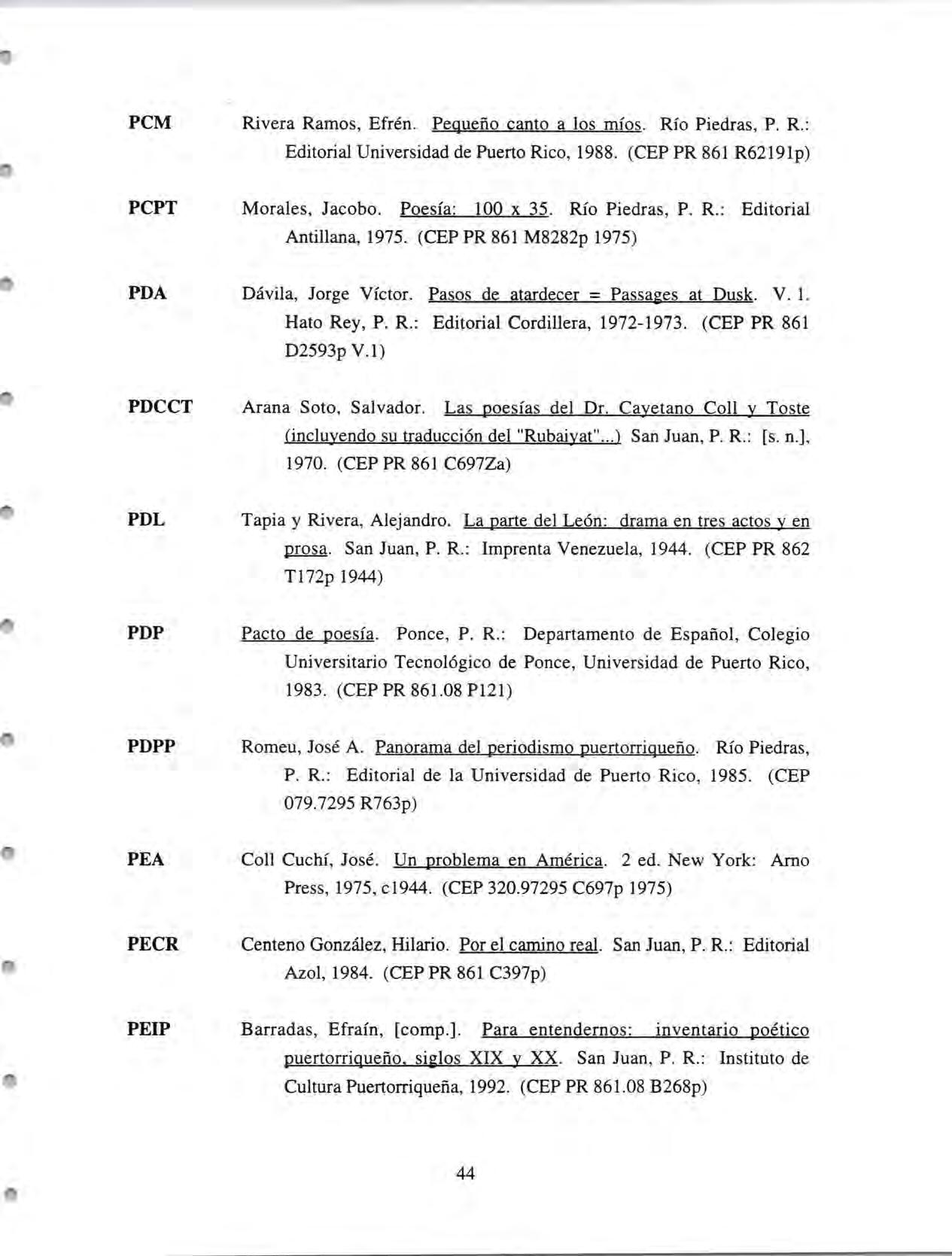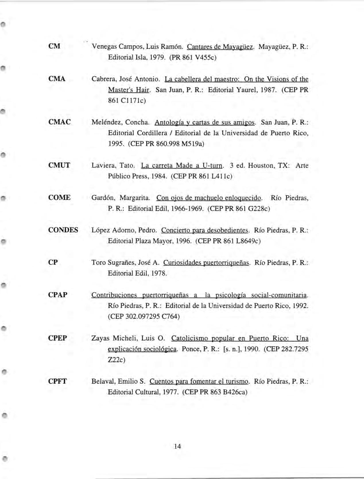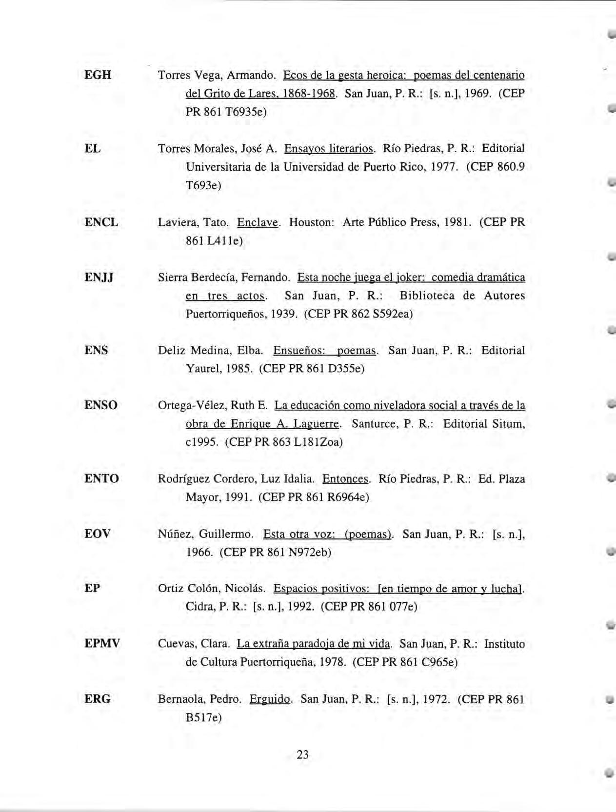Para localizar el tftulo completo de la fuente se referira a la primera secci6n "Siglas", donde a continuaci6n de las abreviaturas de las fuentes utilizadas se encuentra la referencia completa del recurso. Hemos inclufdo la signatura librfstica del recurso en la colecci6n de la Biblioteca de la Universidad de Puerto Rico en Ponce para agilizar la busqueda a nuestros usuarios. Ejemplo: