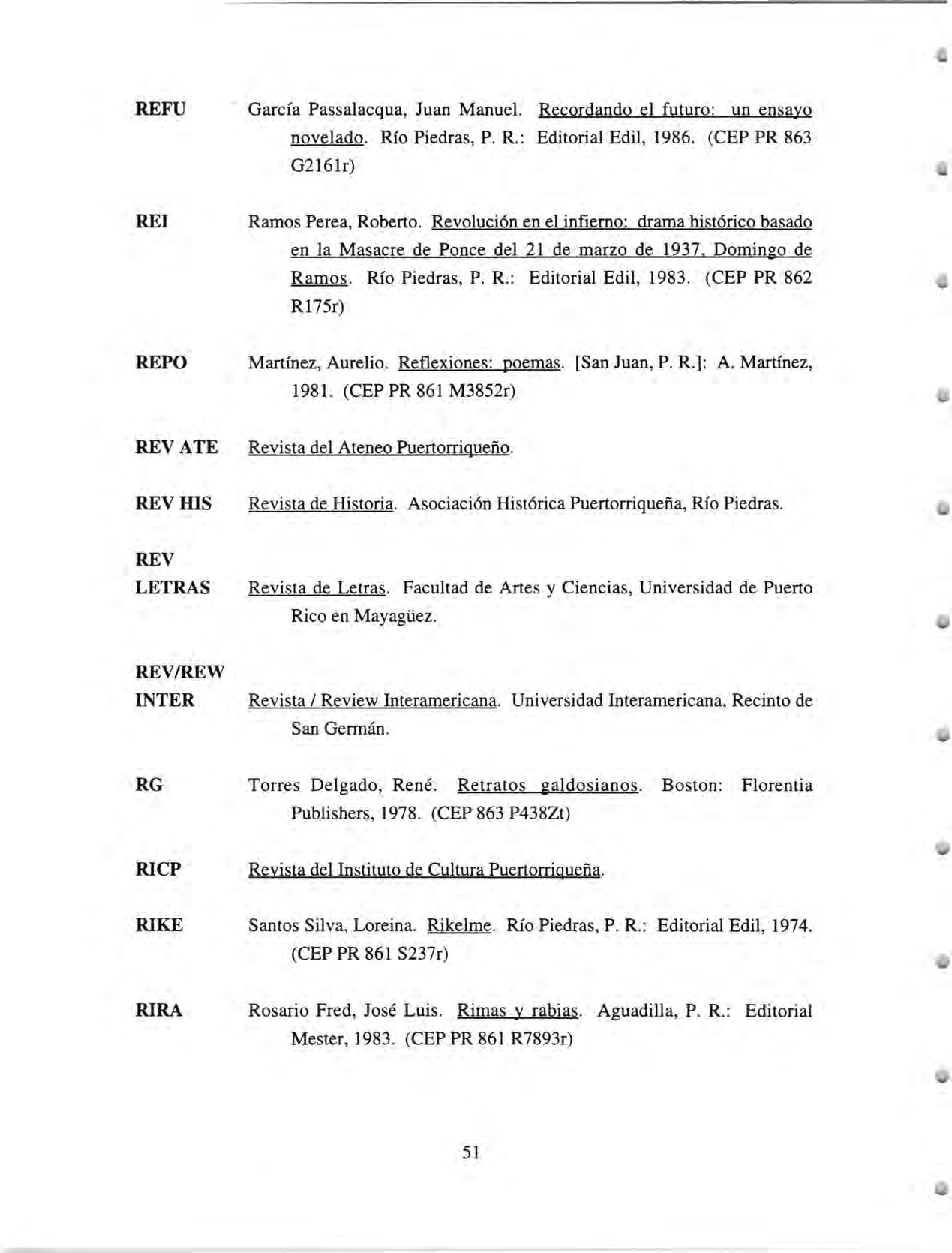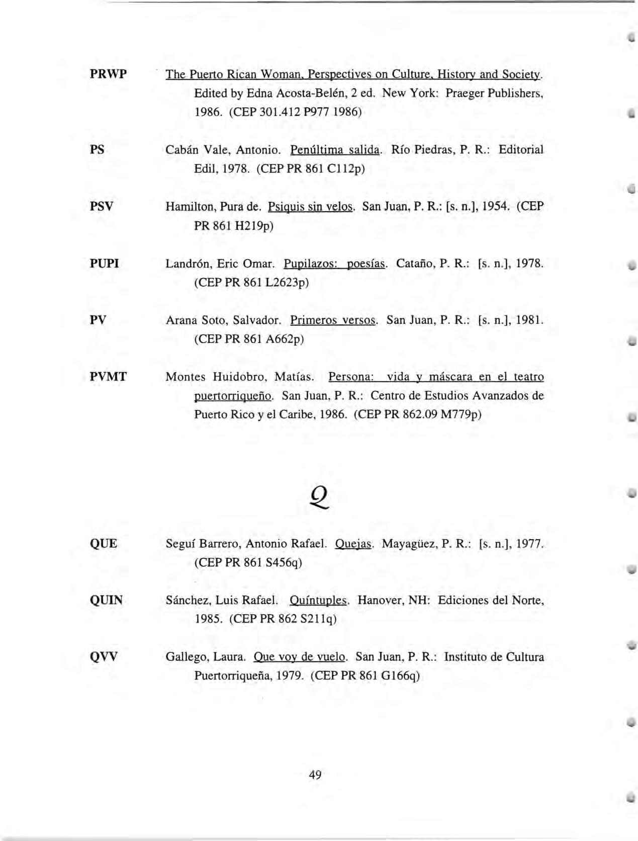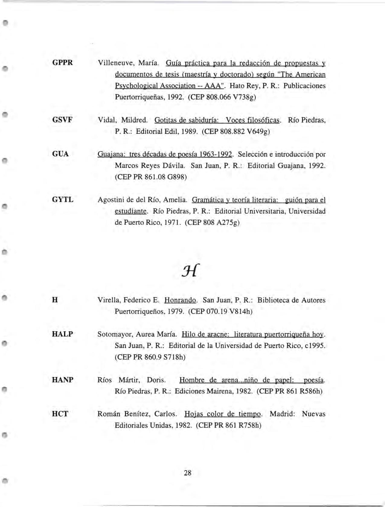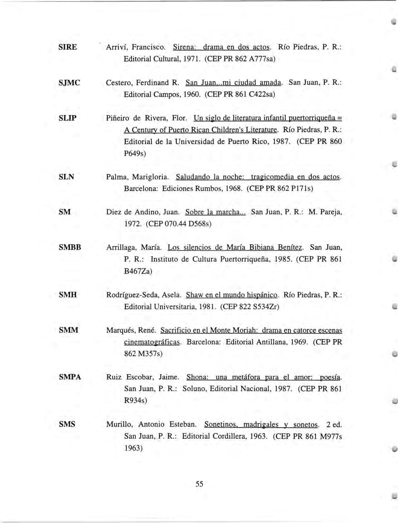 Para localizar el tftulo completo de la fuente se referira a la primera secci6n "Siglas", donde a continuaci6n de las abreviaturas de las fuentes utilizadas se encuentra la referencia completa del recurso. Hemos inclufdo la signatura librfstica del recurso en la colecci6n de la Biblioteca de la Universidad de Puerto Rico en Ponce para agilizar la busqueda a nuestros usuarios. Ejemplo: