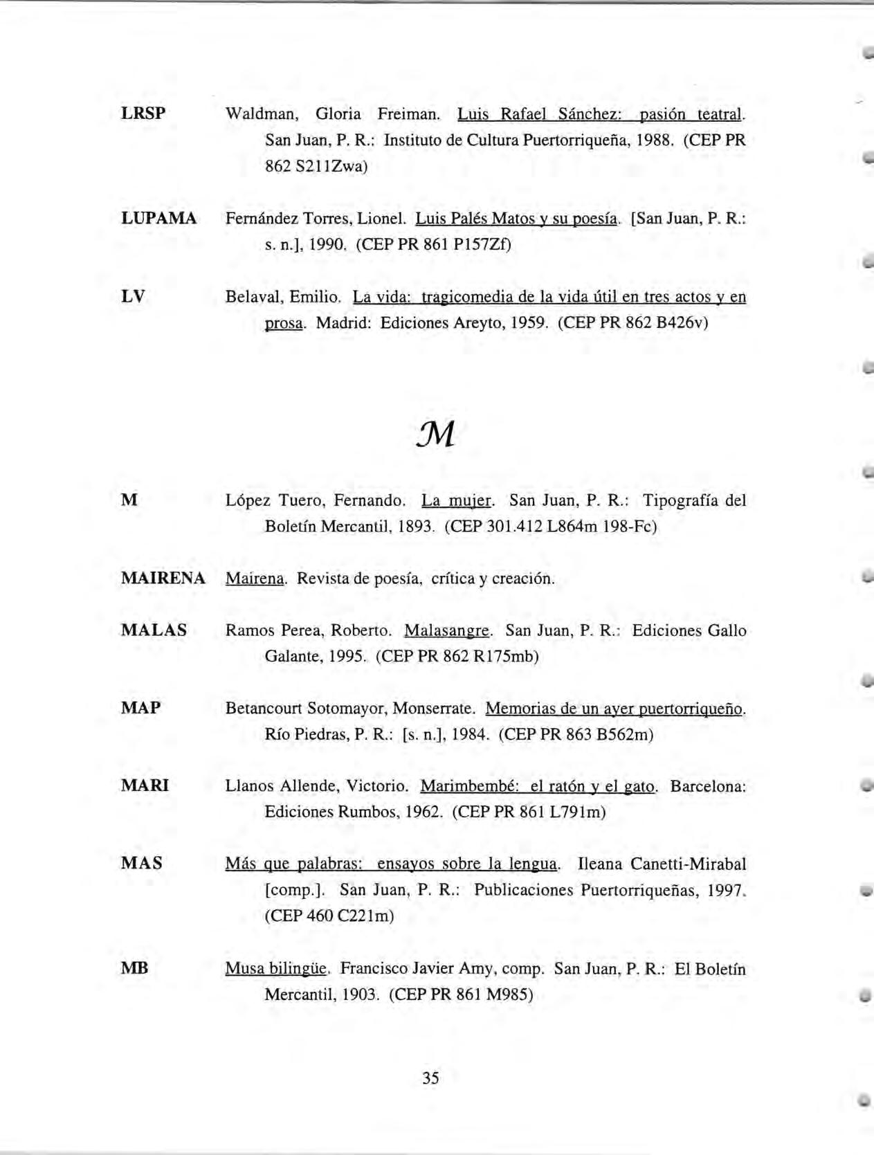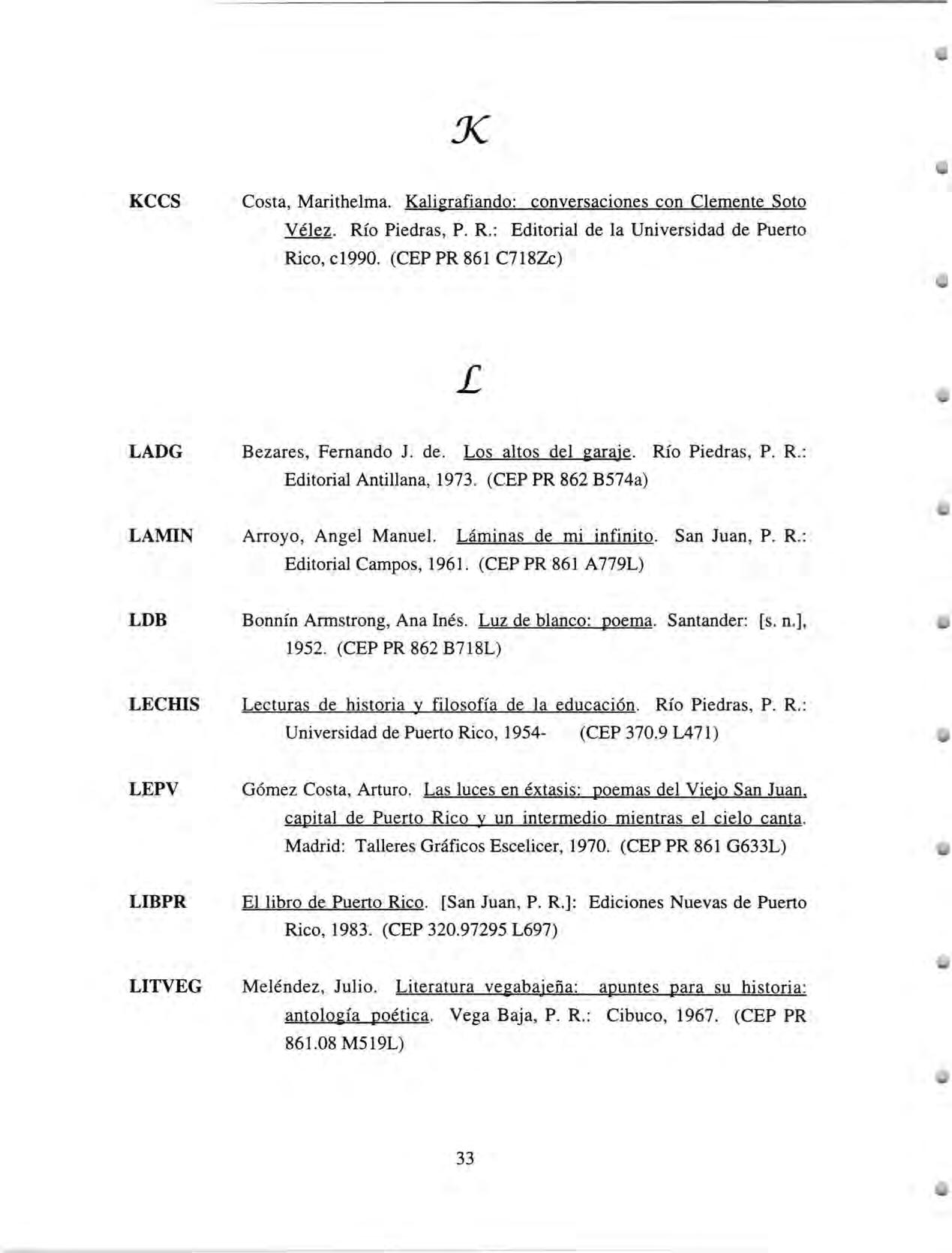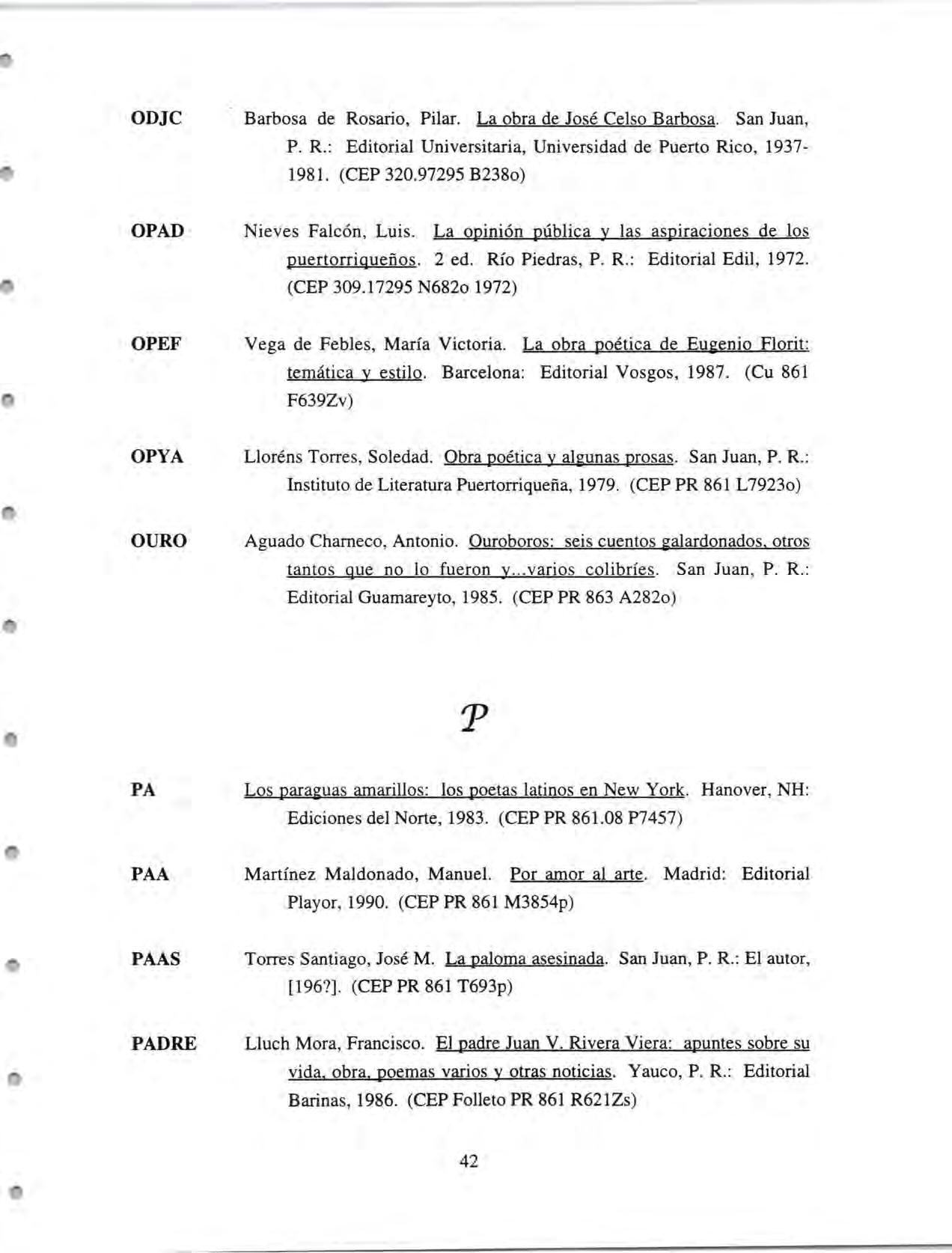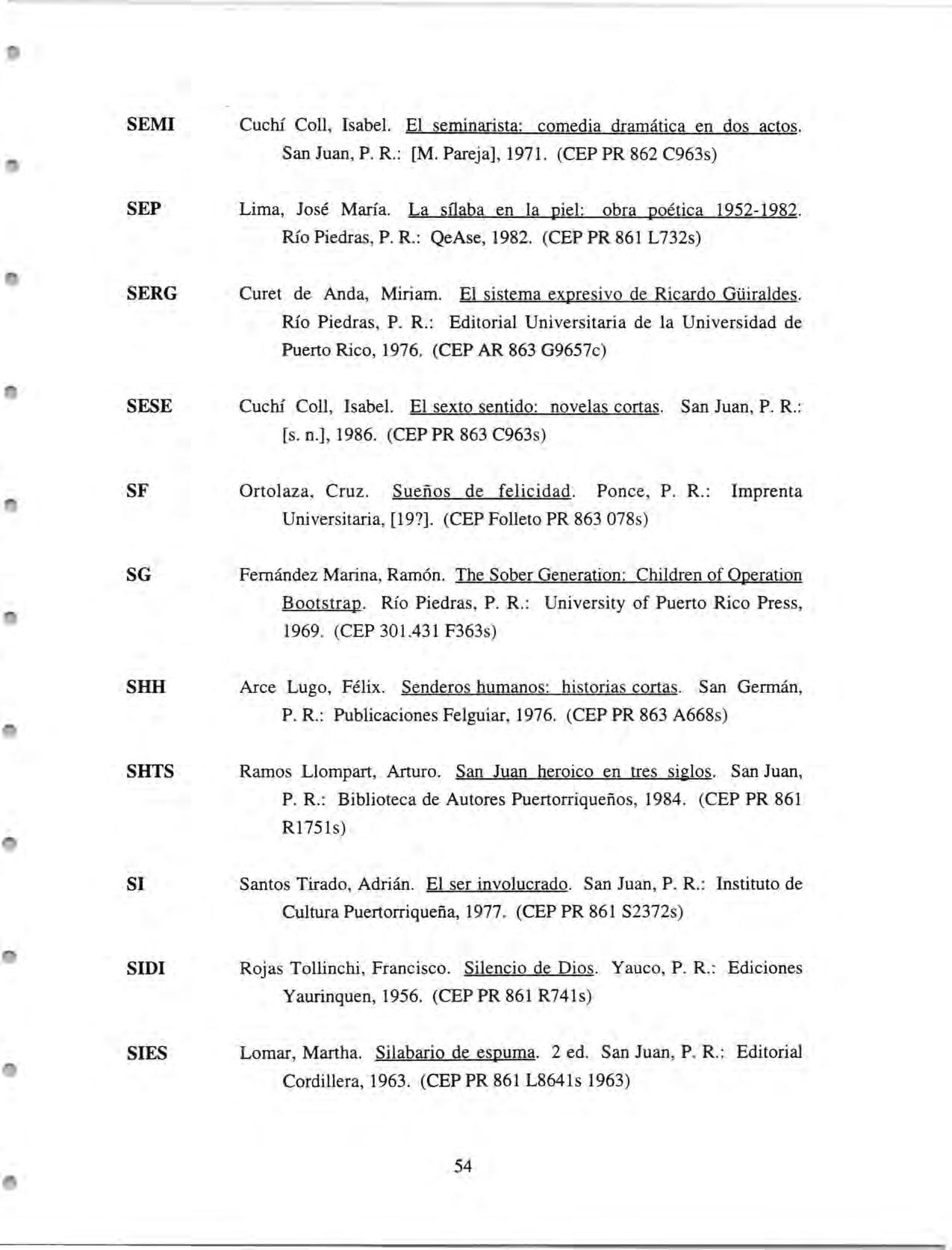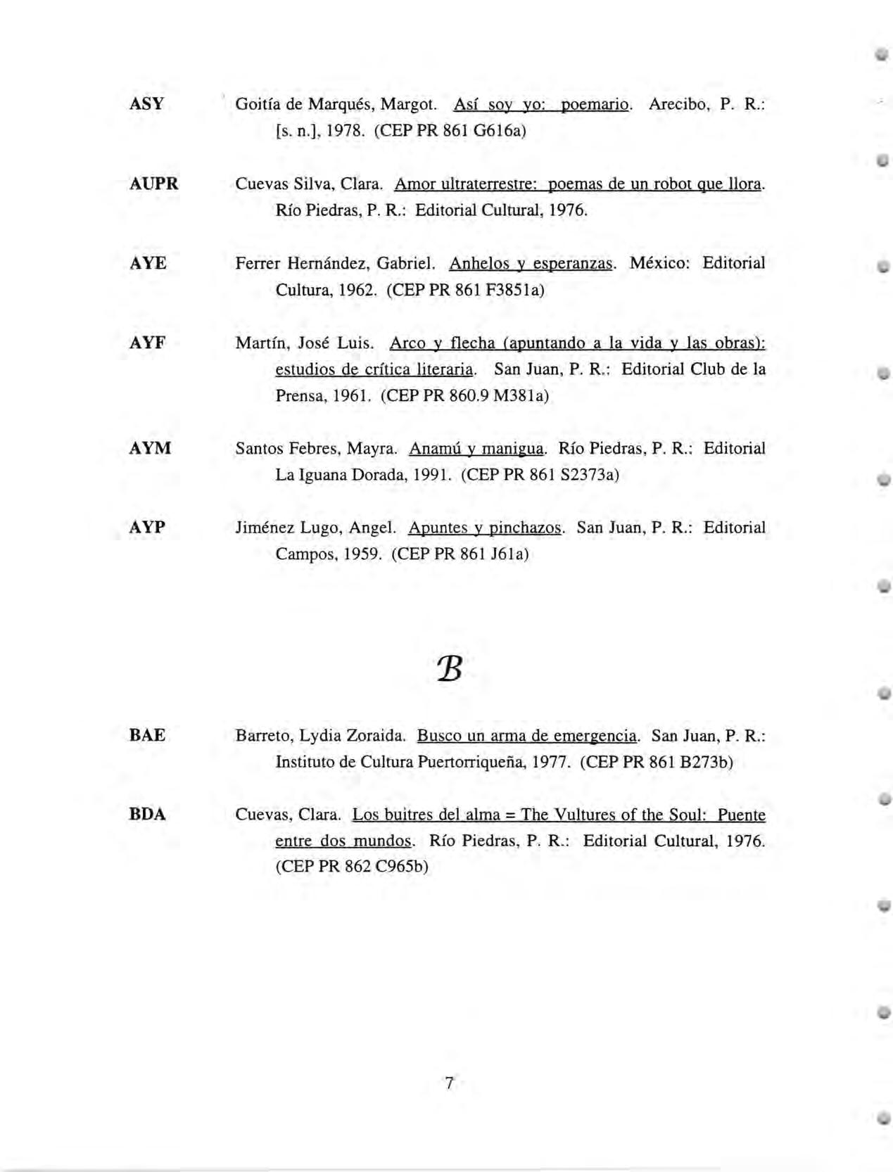 Para localizar el tftulo completo de la fuente se referira a la primera secci6n "Siglas", donde a continuaci6n de las abreviaturas de las fuentes utilizadas se encuentra la referencia completa del recurso. Hemos inclufdo la signatura librfstica del recurso en la colecci6n de la Biblioteca de la Universidad de Puerto Rico en Ponce para agilizar la busqueda a nuestros usuarios. Ejemplo: