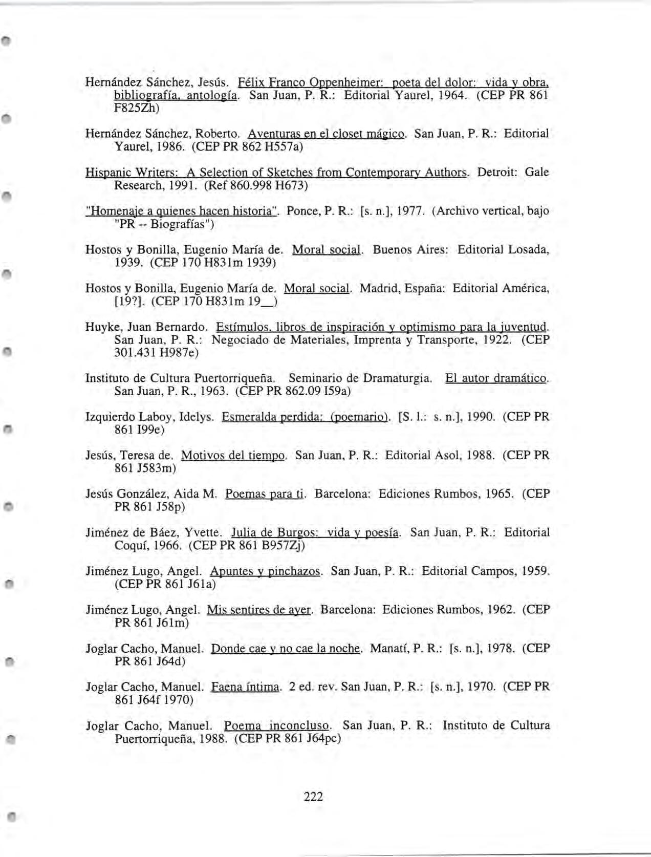 Franco Oppenheimer, Felix . Antologfa poetica 1950-1972 . San Juan , P R.: Instituto de Cultura Puertorriquefia, 1976 (PR 861 F825ab)