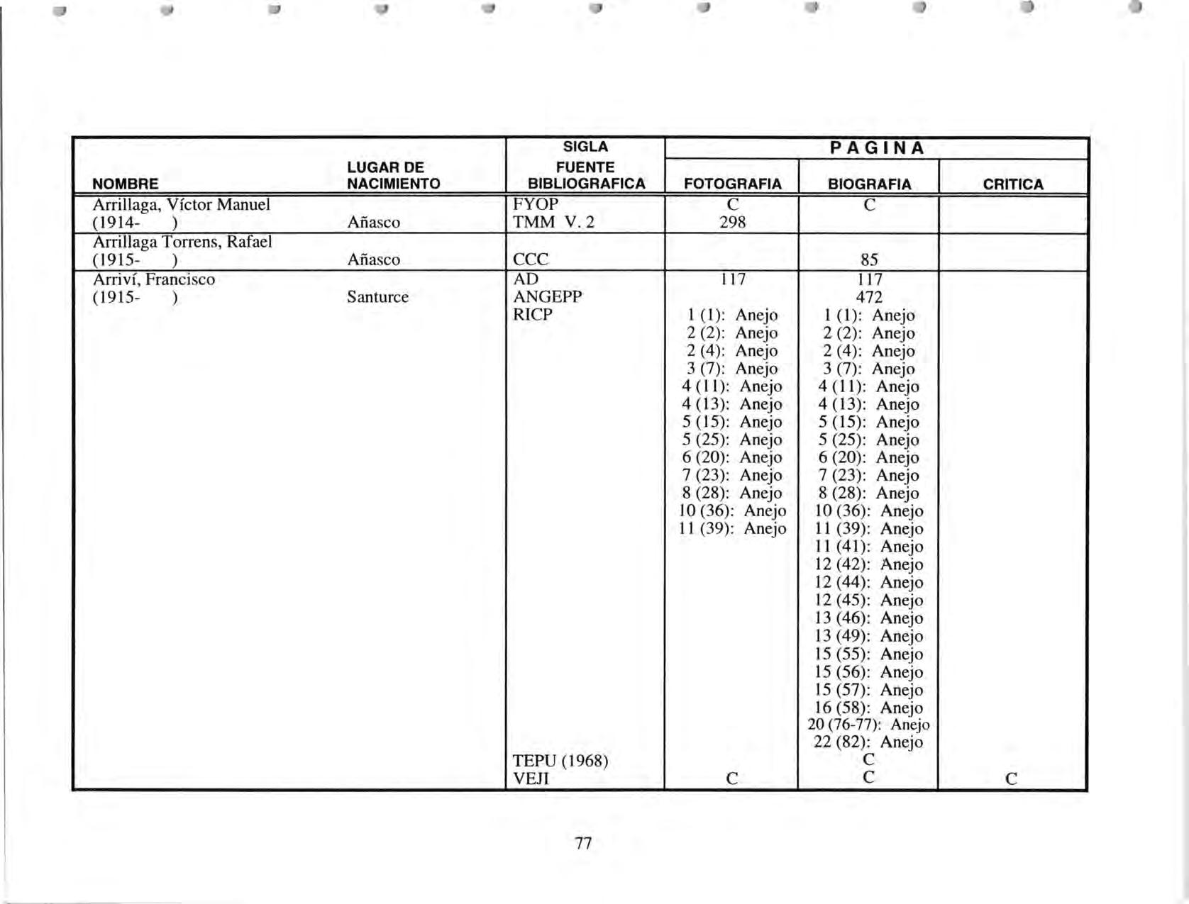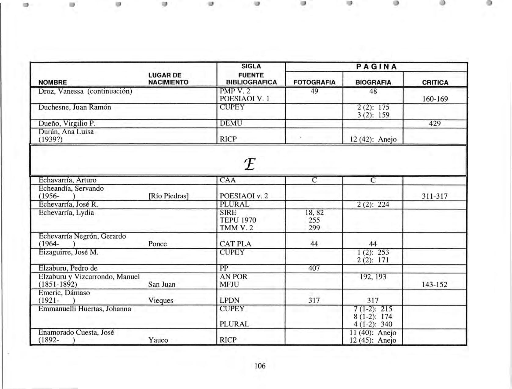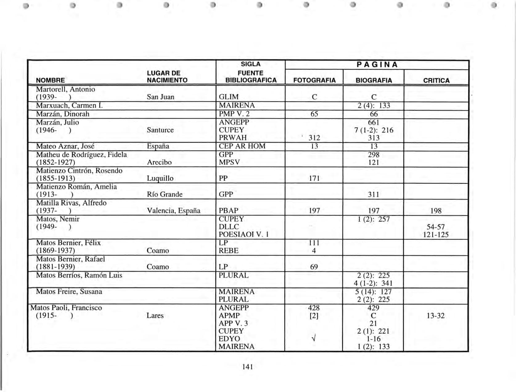 Los recursos utilizados no son fuentes convencionales en la busqueda de informaci6n biografica. Se han utilizado listas de colaboradores en revistas, informaci6n crftica y biografica en contraportadas de libros, antologfas y otros recursos.