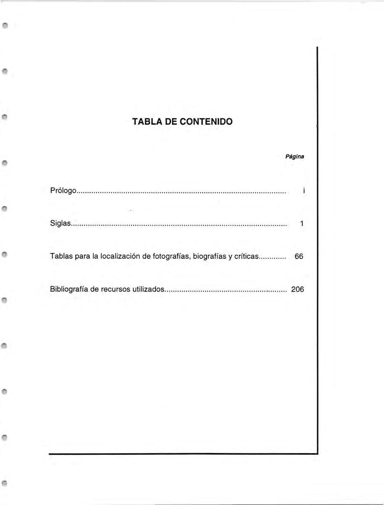 TABLA DE CONTENIDO Psgina Pr61ogo Siglas..................................................... 1 Tablas para la localizaci6n de fotograffas, biograffas y crfticas............. 66 Bibliograffa de recursos utilizados.. .. ......... ............. .............. .. ...... •. ........ 206