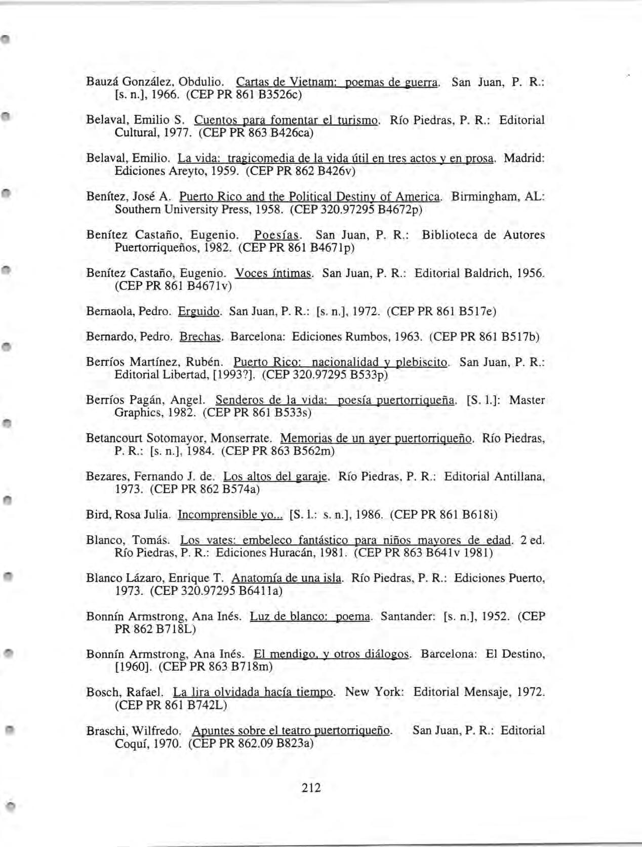 Arrillaga, Francisco. El ayer. el ahora y el despues: poemas. San Juan, P. R.: Biblioteca de Autores Puertorriquefios, 1980. (CEP PR 861 A7762a)