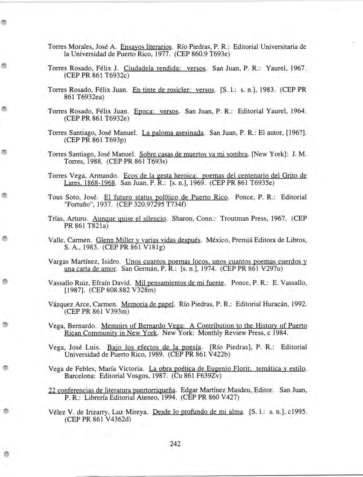 Torres Santiago, Jose Manuel. Sobre casas de muertos va mi sombra. [New York]: J.M. Torres, 1988 . (CEP PR 861 T693s)