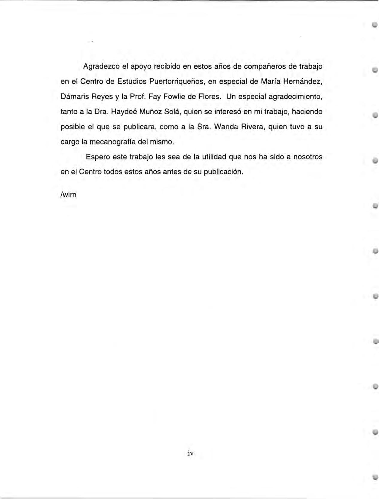 Agradezco el apoyo recibido en estos aiios de compaiieros de trabajo en el Centro de Estudios Puertorriqueiios, en especial de Marra Hernandez, Damaris Reyes y la Prof. Fay Fowlie de Flores. Un especial agradecimiento, tanto a la Ora. Haydee Munoz Sola, quien se interes6 en mi trabajo, haciendo posible el que se publicara, como a la Sra. Wanda Rivera, quien tuvo a su cargo la mecanograffa del mismo. Espero este trabajo les sea de la utilidad que nos ha sido a nosotros en el Centro todos estos aiios antes de su publicaci6n.