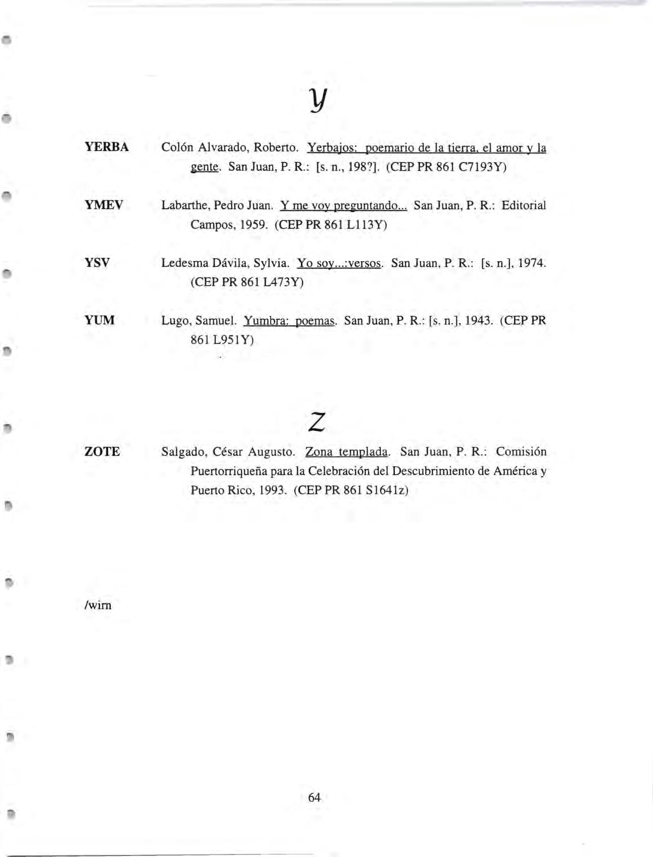 Salgado, Cesar Augusto. Zona templada San Juan, P.R.: Comision Puertorriquefia para la Celebracion del Descubrimiento de America y Puerto Rico, 1993. (CEP PR 861 S164lz)