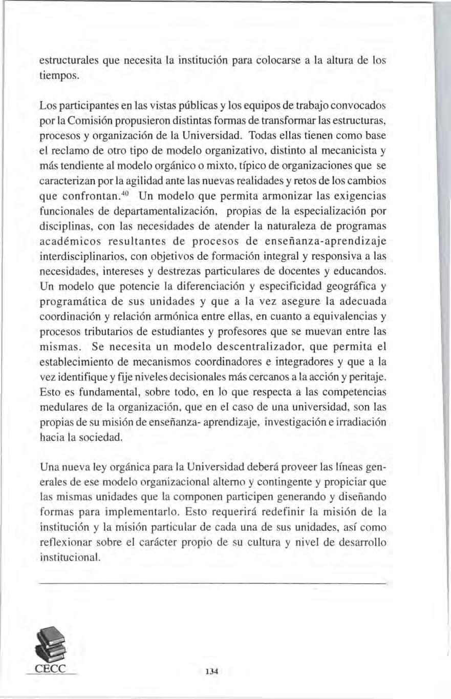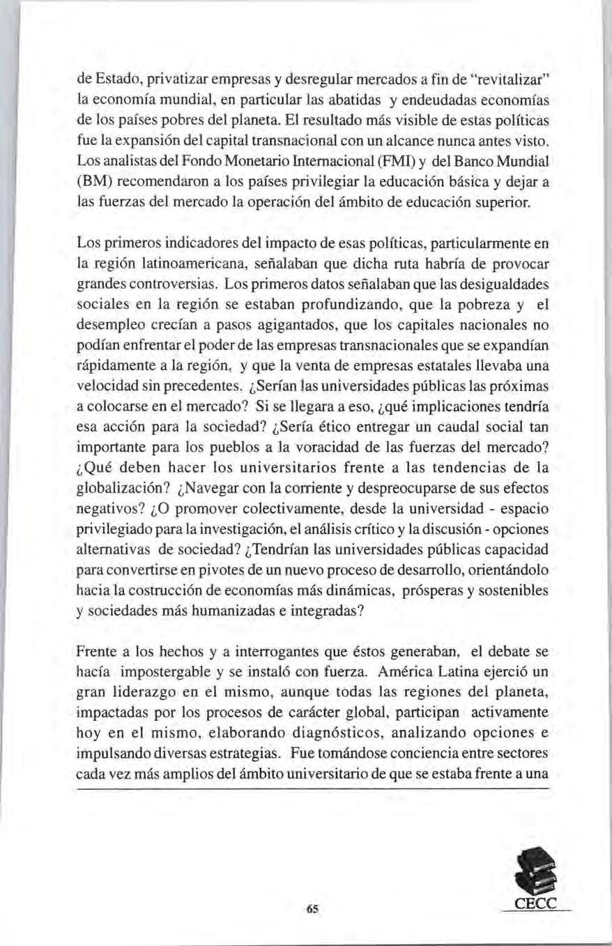 a) En un mundo en rapido carnbio, se percibe la necesidad de una nueva visi6n y un nuevo modelo de enseiianza superior, que deberia estar centrado en el estudiante, lo cual exige, en la mayor parte de los paises, reformas en profundidad y una politica de ampliaci6n del acceso, para acoger a categorias de personas cada vez mas diversas, asi como una renovaci6n de los contenidos, metodos, practicas y medios de transmisi6n del saber, que han de basarse en nuevos tipos de vinculos y de colaboraci6n con la comunidad y con los mas amplios sectores de la sociedad.
