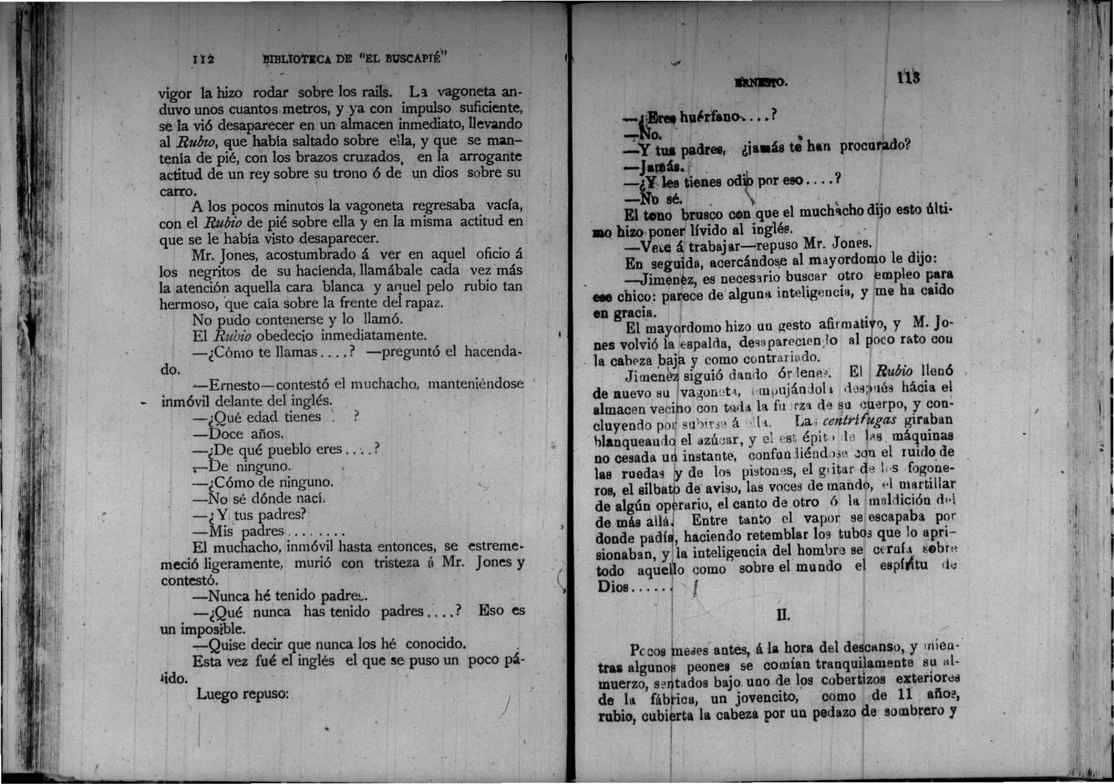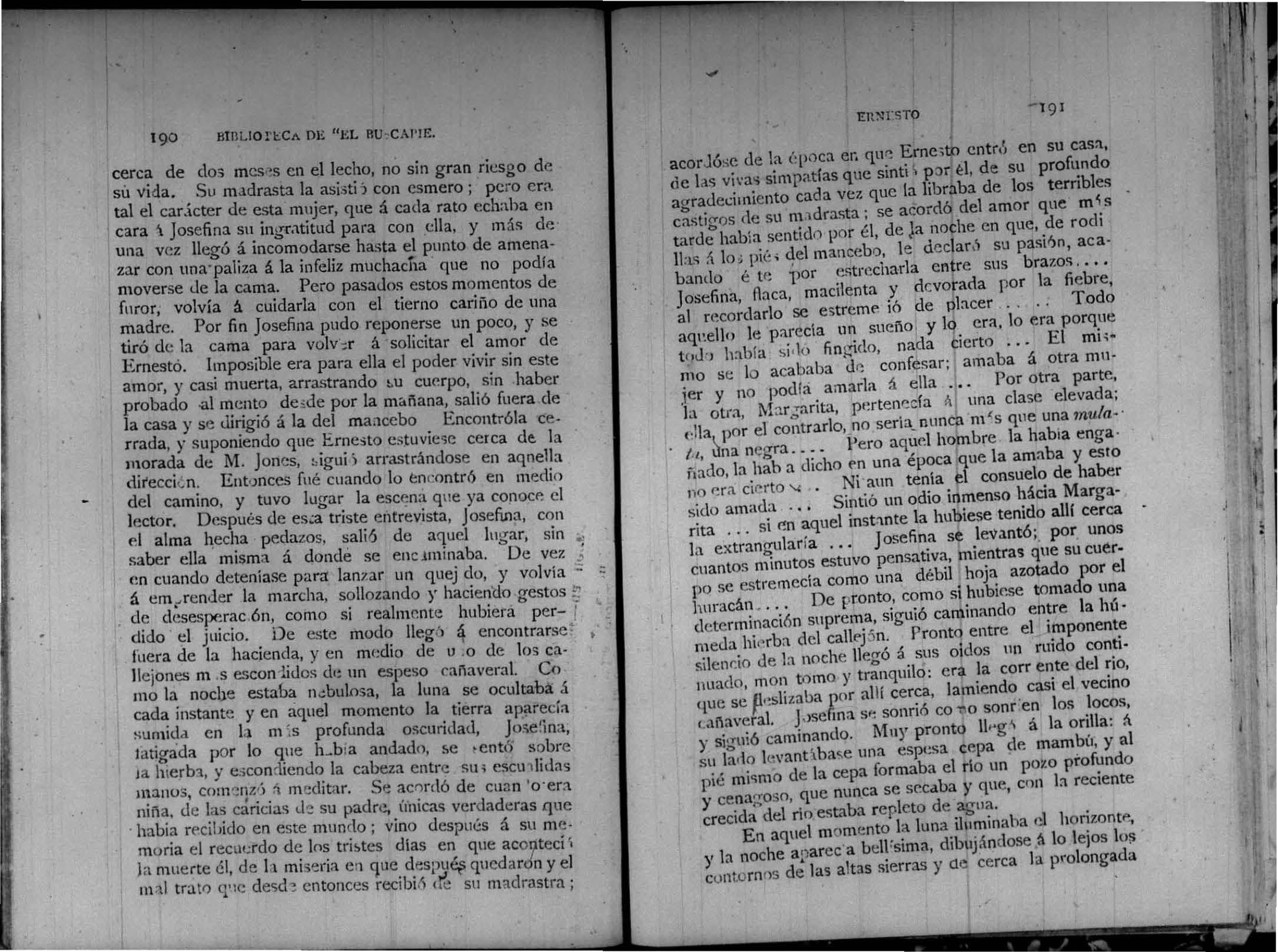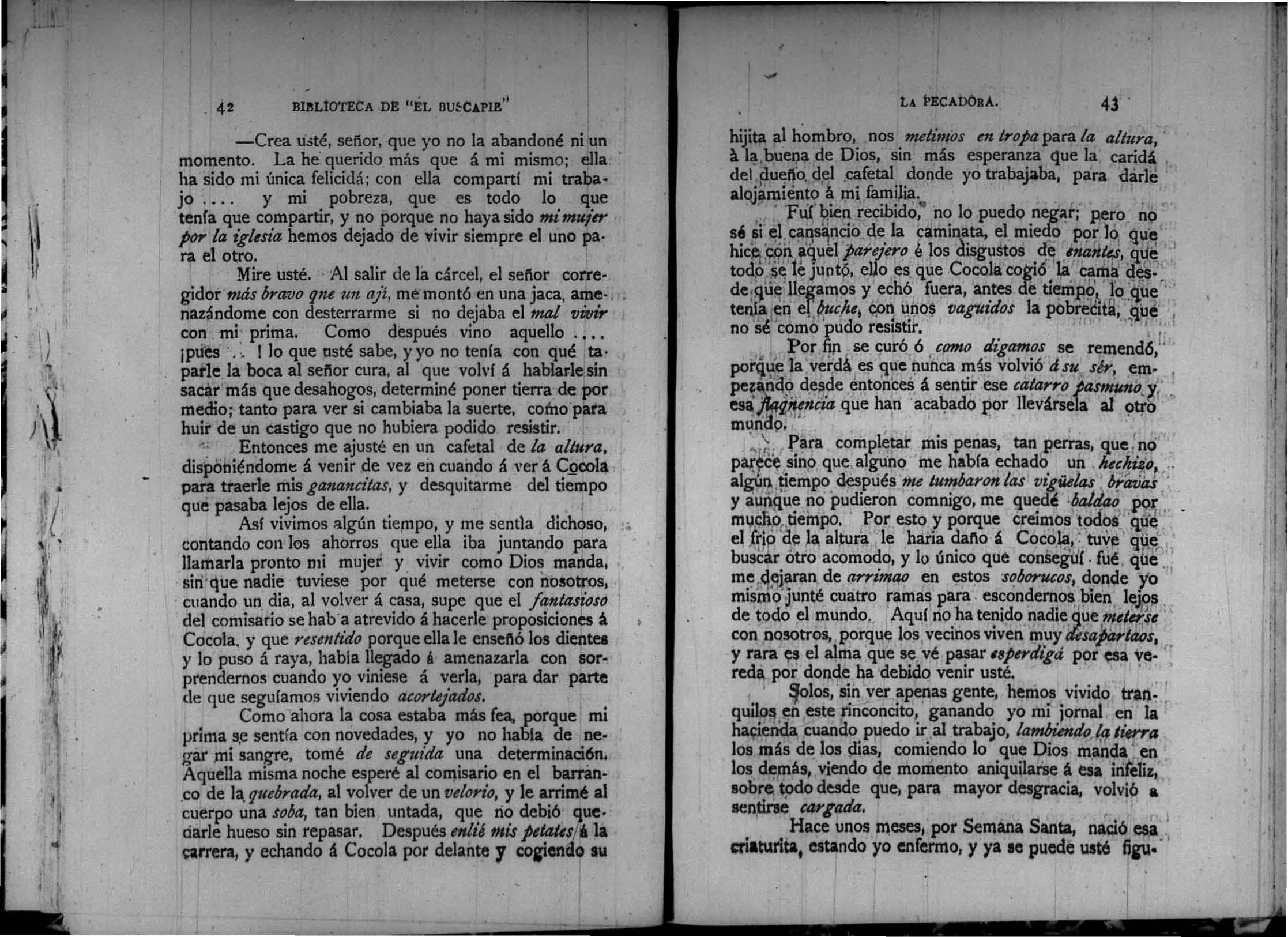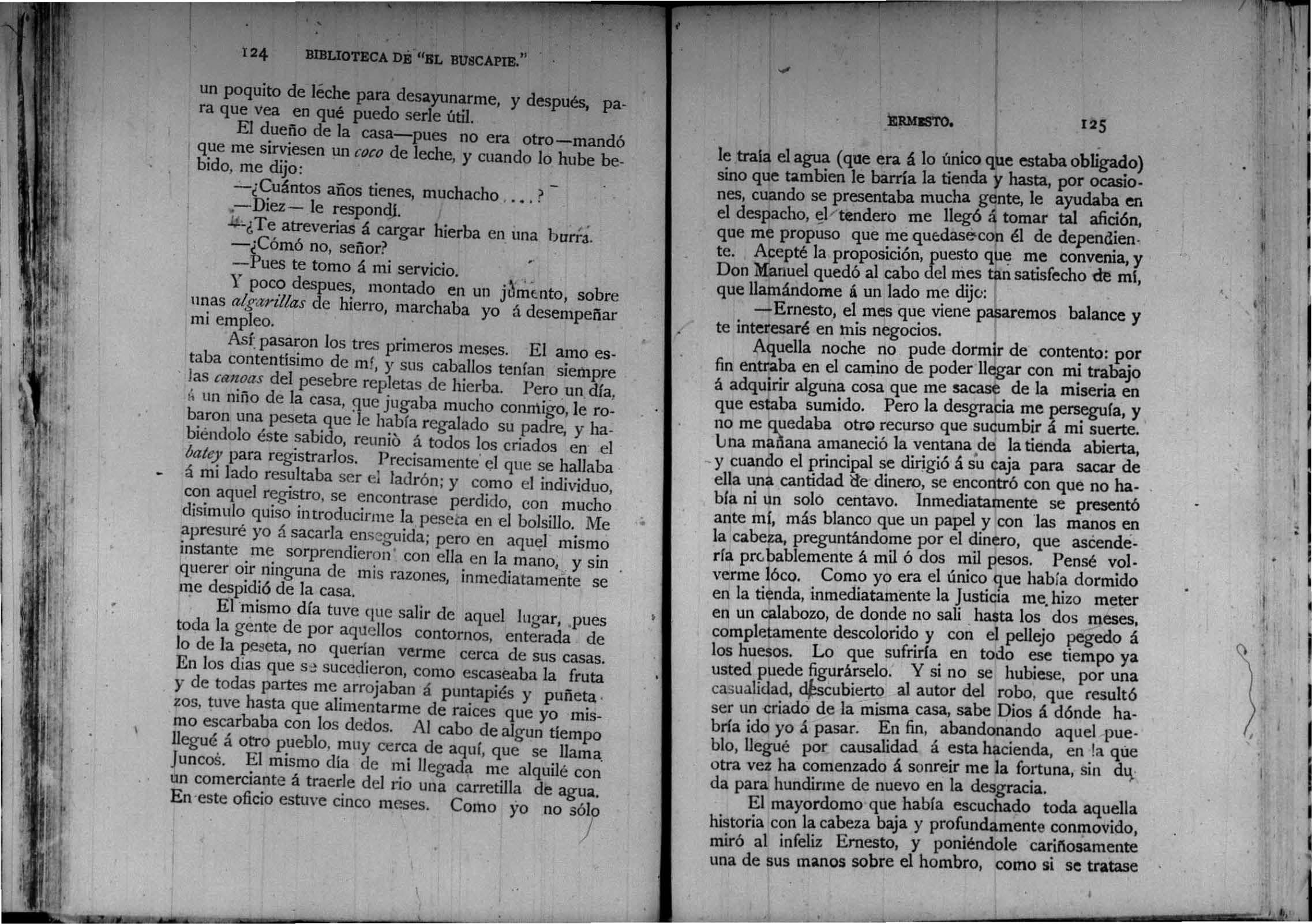 Siempre y por igual propicio á las riflas y á las fiestas, .lo mismo improvisa, un baile que lo acaba ó lo dl!;persa. Cantador á lo con asomos de poeta, nadie en el barrio le iguala cuando rima y argumenta; tiene acopio de cantares, glosa en un Jesús las décimas, y hace hablar entre sus manos la guitarra y la vihuela. Galanteador incansable, no hay vecina casadera á quién no haya declarado \ sus amorosas ternezas ; mas no se rinc.le á ninguna, porq\le es pájaro d e cuenta, y por lo sutil y arisco, que al cogerle salta y vuela, entre las mozas del barrio .?ene un apodo: Guinea, Por eso busca en la altura lo que en e l "ªlle no encuentra, muchachas desprevenidas, impresionables, íngé riuas, que le abran sus corazones. y le escuchen, y le crean. t Ll egó por fin á ura casa, lletC.vose en la meseta, miró en torno, tomó el tiple, acercóse á la e.;calera, escupió la mascadura, dejó expedita la le ngua, preludió una serenata