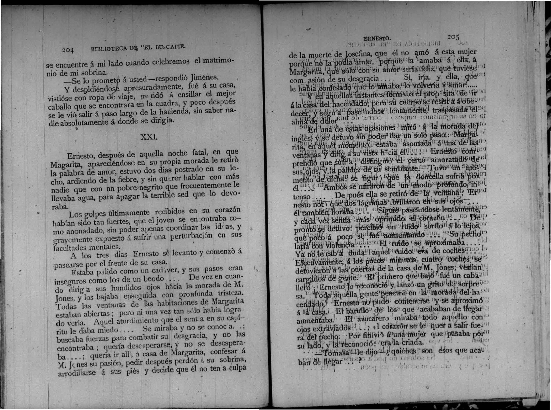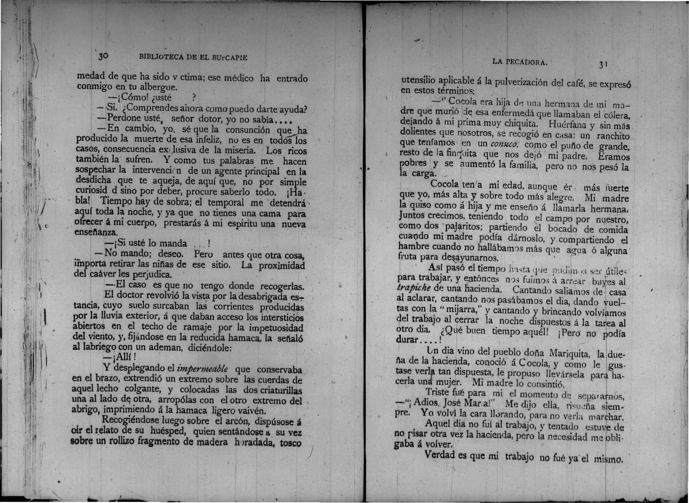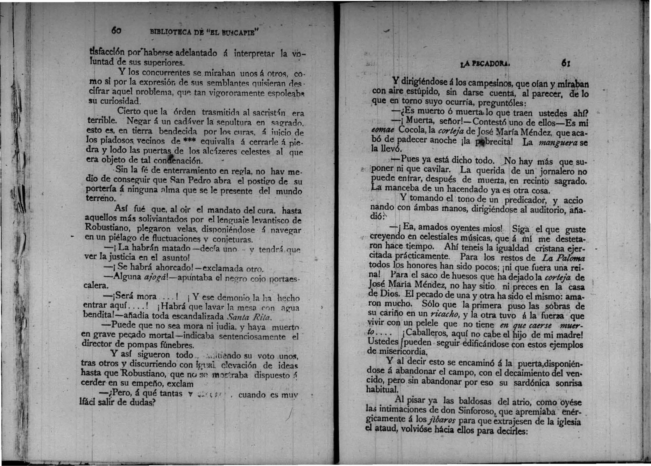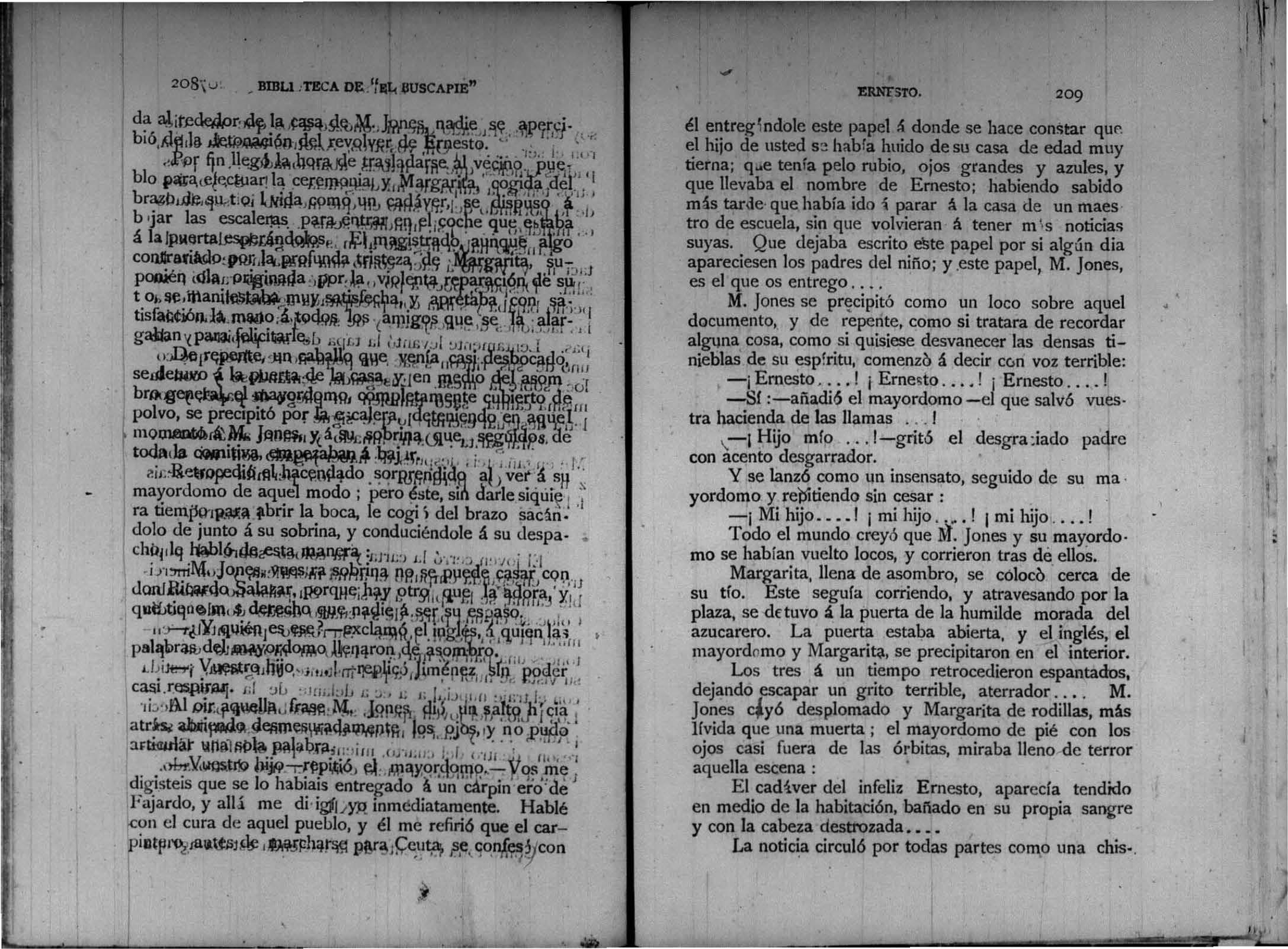 Una tarde del mes de Junio, el doctor Duena visitaba :\ Ja madre de Miguel, enferma, 11 la sazón. Aque\ dja estaba muy mejorada la enferma y el mi dico aprqvtj\1ran<k> las buenas d sposiciones de flnimo de Miguel, se entretuvo chfrlando un rato sobre cosas indife · rentes. El doct0r $ba de vena, y de u a en otra cosa la conver.Ía¡::ión req.yó en la noticia de la dram' ticamuerte;,itrº·-de la cual trajeron los periódicog no . ticias d .