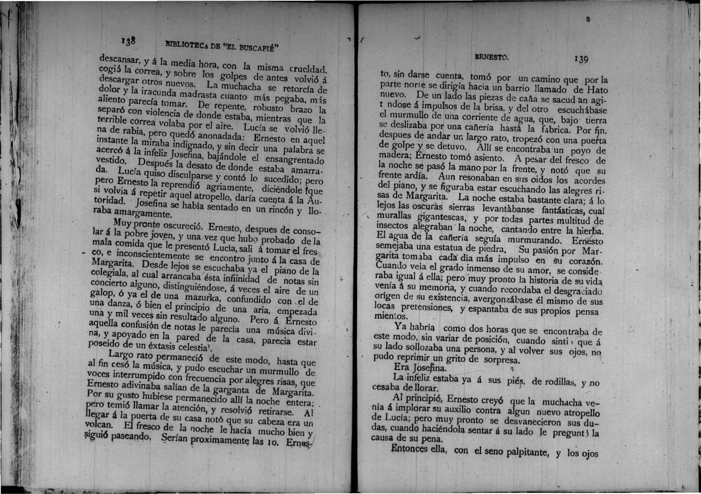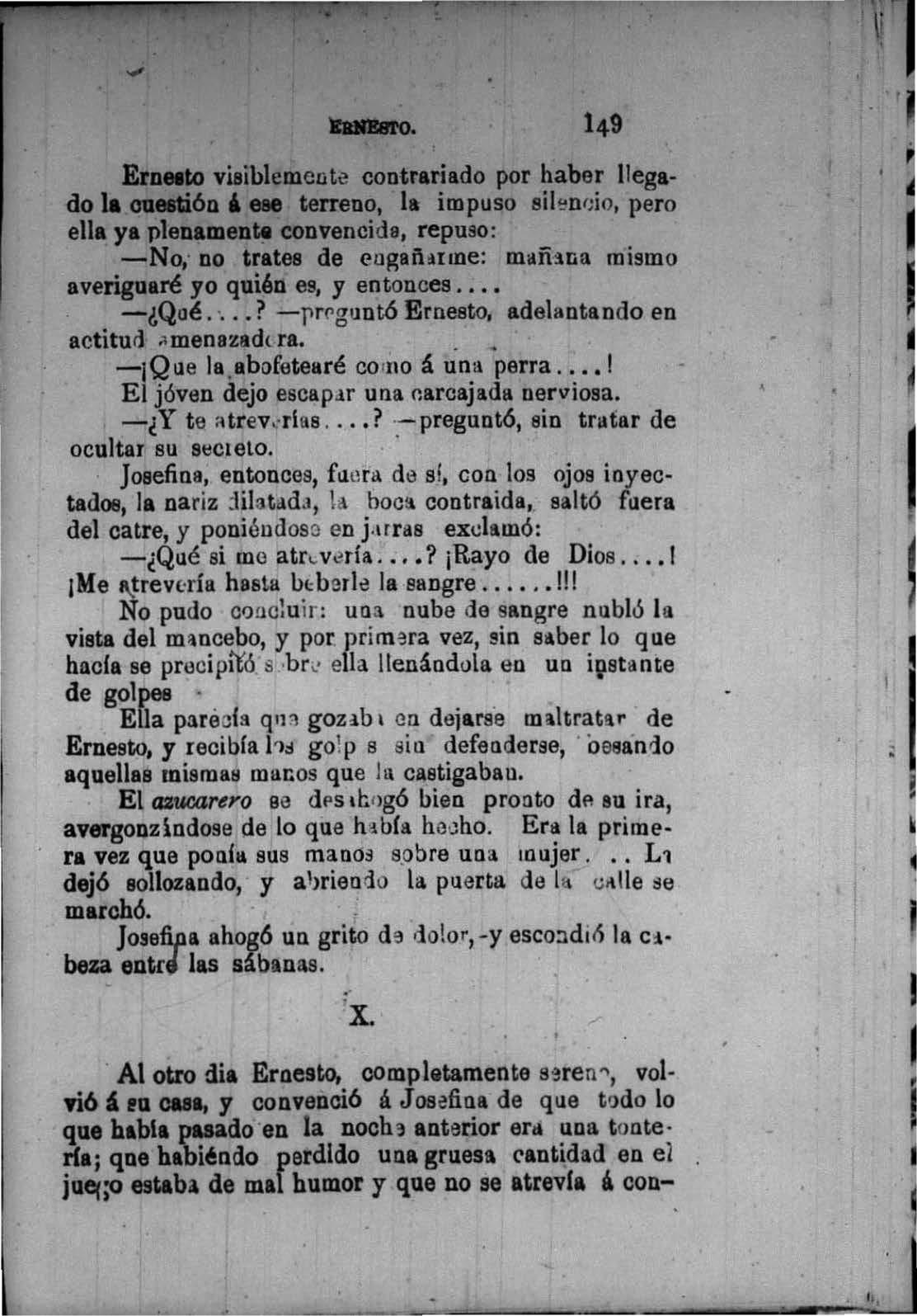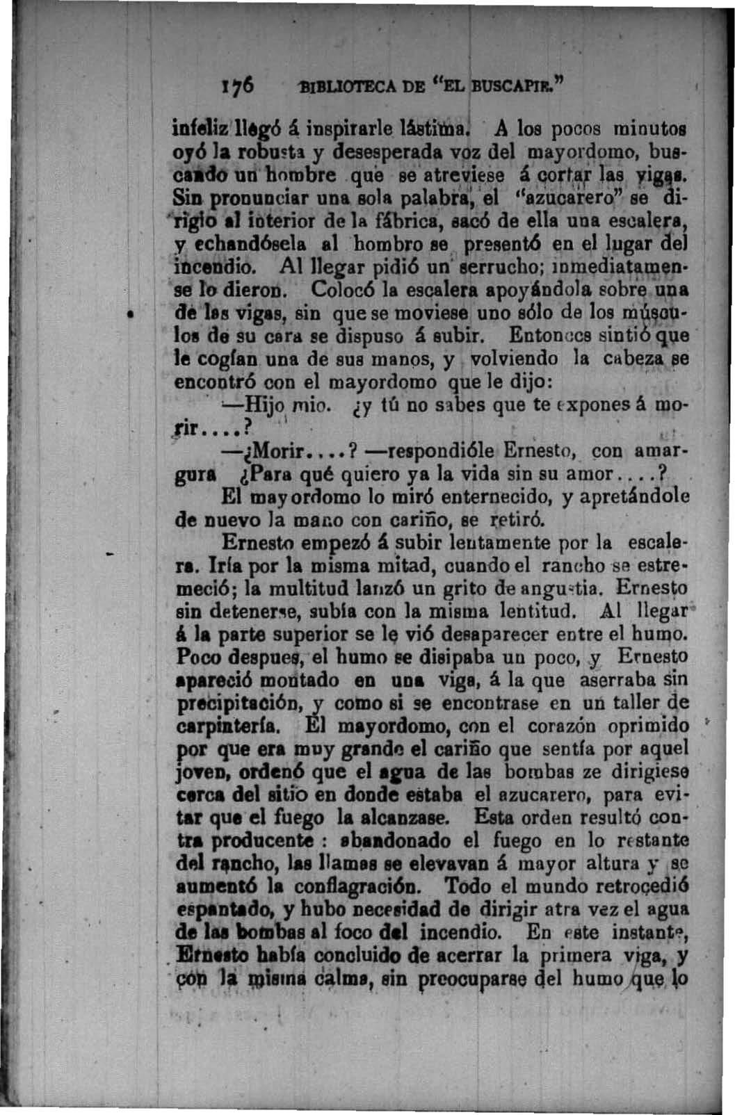 Eo;tremeclase al considerar el espect 'culo de su miseria ; y esforz ndose en penetrar con su esp ritu en el porvenir, se vi6 VP.Stida con telas burdas. habitando una cesucha cualquiera, sin vi<ita • , sin adoradores, sin bailes, sin teatros, sin nada de todos aquellos tesoros de que habla d'sfrutado entonces, y empe ':o • apoderarse de ella el desaliento ; pero no se dejó vencer. LiJs seductores lazos del placer la ligaban \ sus falaces inclinaciones de una vida espléndida. Vivir la vida doméstica y sosegada del que carece de medins dt: fortuna . .. _ ¡uf. qué existencia ta 1 fatidiosa ! Ella . habla nacido para el tumulto, no . para la quietud .. .. Tuvo un movimiento de impadencia y PStrujó entre manos el pañuelo . . . . Se acordo dé Ignacio, le inculp6 dr: la pérdida de sn fortuna , y la imagen conde R ... ocnpó por completo aquella exaltada fan tas!a. . ·