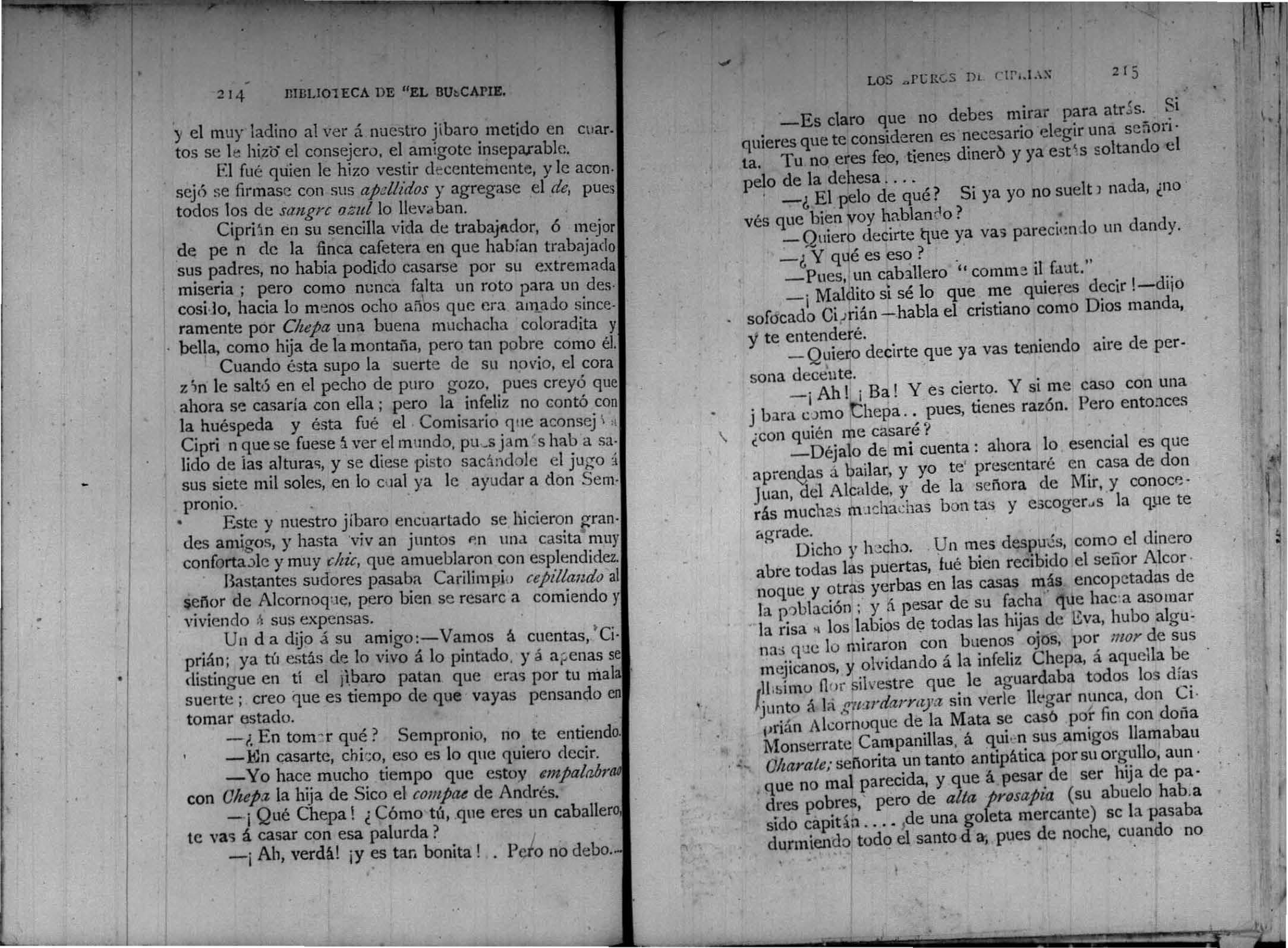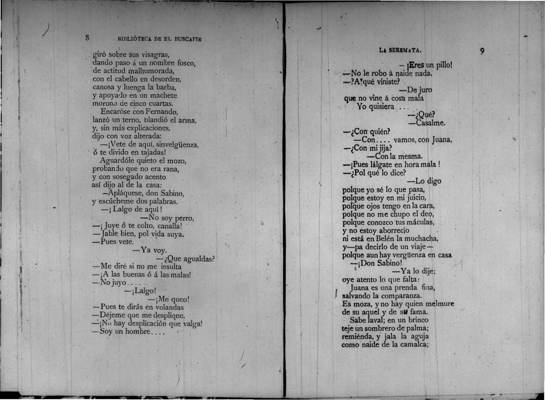 -No soy perro, - ¡ Juye 6 te coito, canalla! Jable bien, poi v\da suya. -Pues vete . -Ya voy. . - ¿Que agualdas? -Me diré si no me insulta -¡A la s buenas 6 á la s ma las! -N ojuyo .•. -¡Lalgo! -¡Me quco! -Pues te dirás en volandas --;- D éje me que meclesp liqn e. -¡Nu hay desplicación que valga' ·Soy un hombre ....