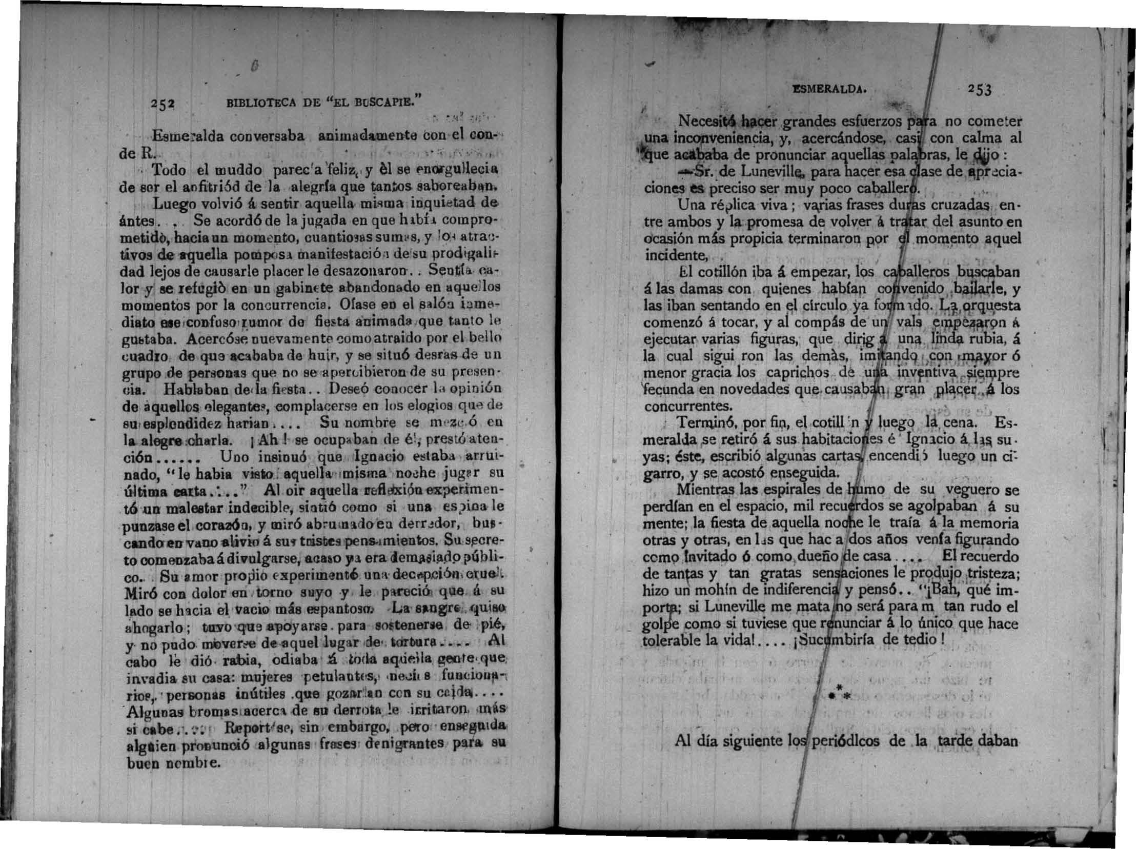 La buena rnrella de Ignacio le &'uit\n una vez m'9 ; decididamente la suerte le favorecla·1iempre con opert11Didad; 4 cada ganan• i 1, IU audacia creci1, ere · ola, bu&a imponene • los otros jngadore1. . • • Su roetro 1e aclaró por completo ; lai elegant.ee fia}¡aa dfl marfil coo que se dilfruaban el oro 1 la1 billetes de buco 18 amontonaban fl su lado ; d1j6fa99 que 1traian el cliaero de lot demú con fuerza irresistible ; y él ICIUeia.... Huta lu ligeras nieblu que empaliaban la de 1u veutur1, al em¡>Cz.r la vdlada, se dtlbiaierou •••••&re tanto ee bailaba en el alón. &meralda, apoyada en .el braso del conde de R .. p.u6 ju\ltG i un grupo, de doe oaballel'O:I oondecorados, que la dljeroo una galantérfa al paaar. Cuando ee hubo alejado, uno de el!OI dojo : -No cabe dada que Htol americaDOI deban de ser may ricos ; 1U1 fiesta siempre e.>n eapléndid11.