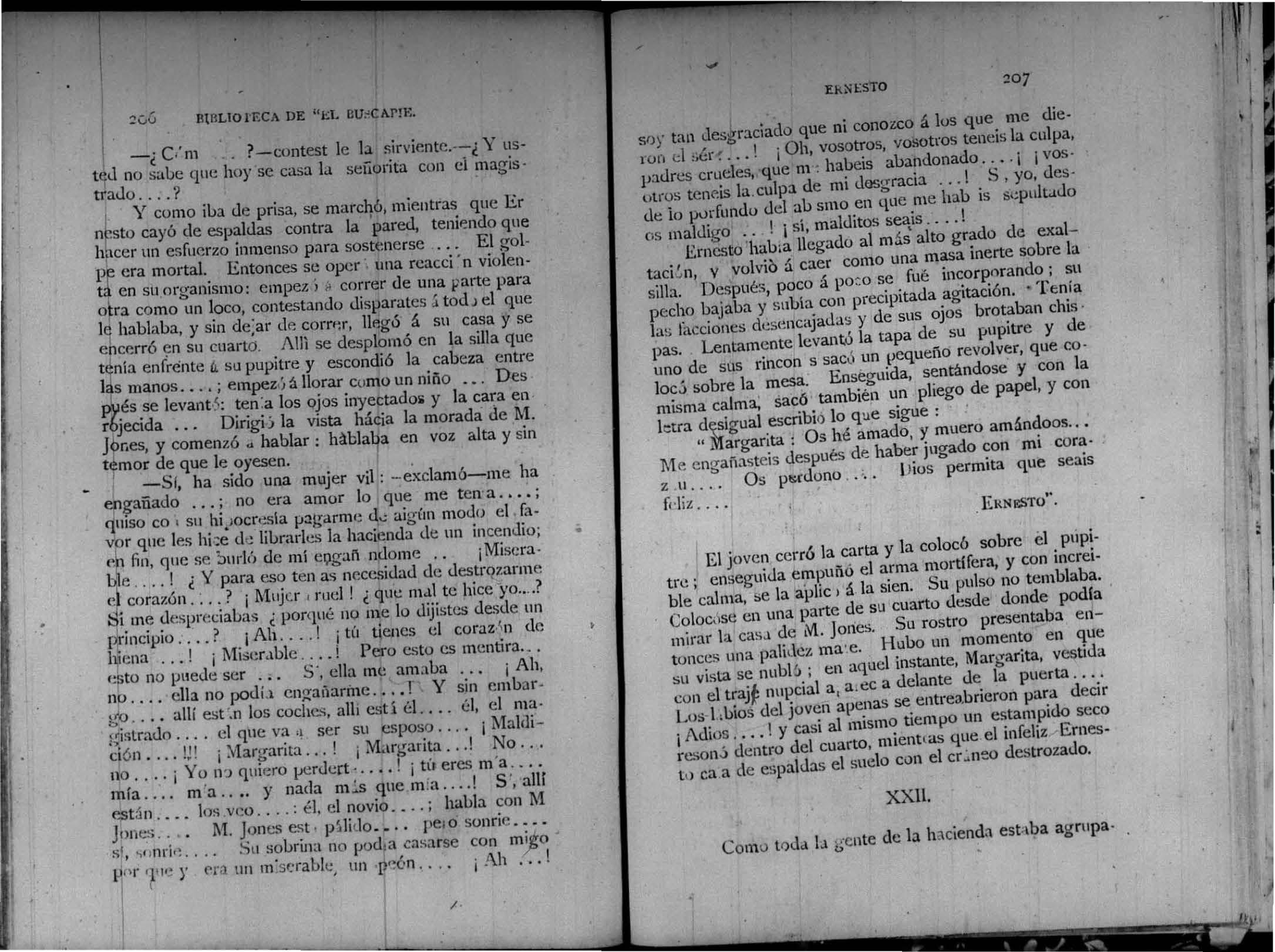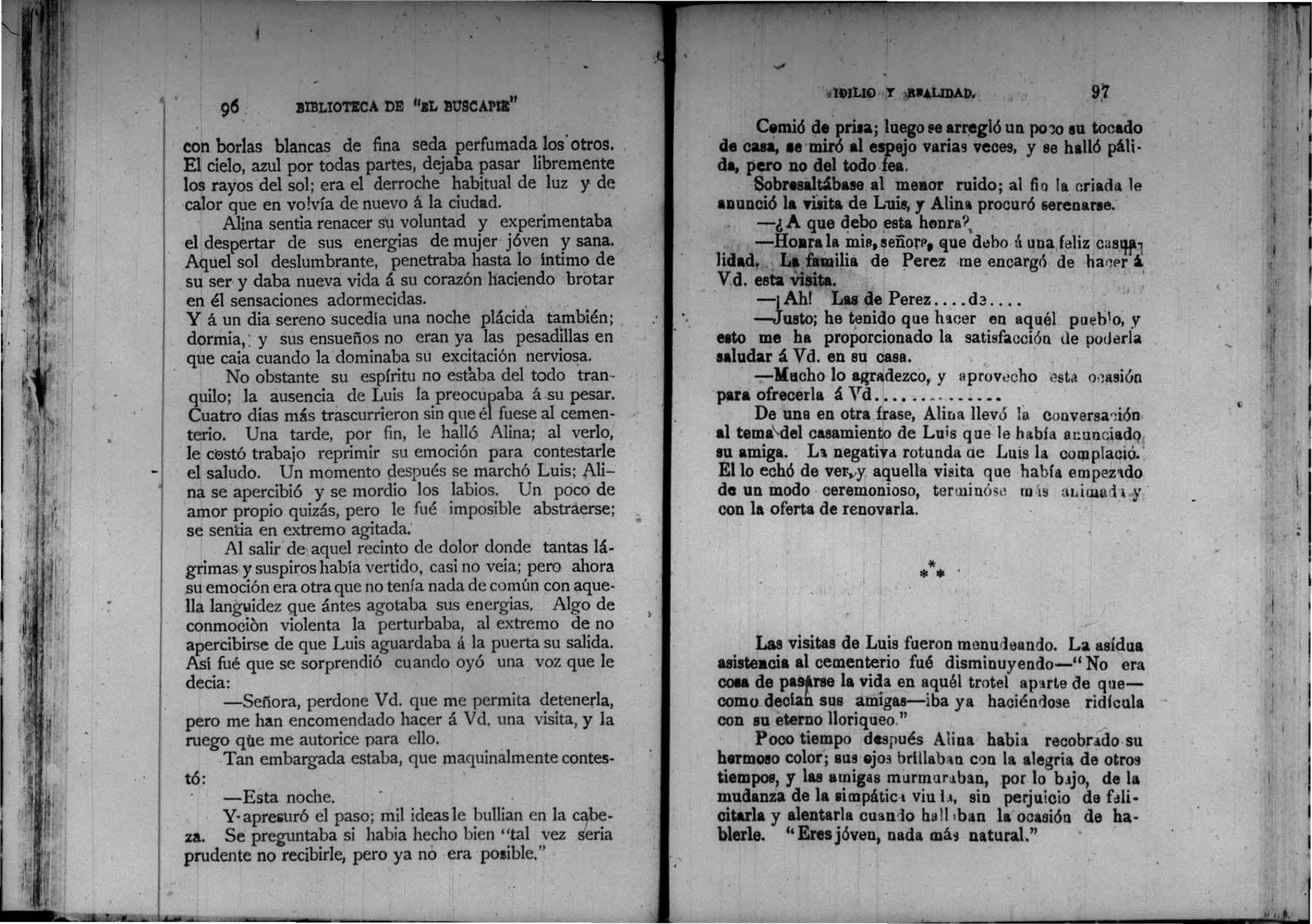 Esme:alda coD1111rsaba animaduneote coD el ooode R. . , . .. ,. · , . Todo el muddo parec ' a 'feliz. . y bl se !'nOJg ullecia de sor el anfüri6d de la alegrfa que saborellban. Luego volvió á sentir aquella· mi•ma iD¡:¡uie tad de ántes . • Se acordó de la jugada en qu e hibÍ! comprometido, hacia un cuantio!&S sum • s, y lo <atra e· tivos de aquella pompos.i maoilestació a de 'su prodigali > dad lejos de causarle placer le desazonarort . . <'.alor y ee 1efoglo en UD gabiotlle abaDdoDado en •qu ell os momeotOs por la con curre ncia. O!ase en el s • ló:i diato de auimade ,que tan to le gu&taba. Acercóse ou evam e ntE1 (!Omo atraido por el be llo cuadro de que llCllbaba de huir, y se situó d es ras d e un grupo de pel'llo111.s que DO se .i pe roibieron de s u pr cs r.n · Gia. Hablaban de •la fi esta .. D eseó con oc er la opi ni ón de aquello!! compla ce rse en los e logi os qu d de sm eaplondidez harian , • . • Su nombre •e m 1• z c. 6 c u la alegre .diaria. ¡Ah l se ocup aban d e é !¡ prestó a tención...... Uno insiDuó que lgn•cio 11• taba arru i nado, "le babia vis*'>i aqueJl., ·1 misma jug' r su última 18lt&.: •• " Al oir aquella 11&fttbtión B'Xperim en· t6 ·.uo: mal111tar indecible, sintió como si UD& es,>ioa le punzase el coruón, y miró abrumado en d.irr Jdor, but · candcieo:vaoo elivio á su• tiUtie1 pene.imieutos. to oomeozahaádi•nlgarse, ªªª'º'lera ilellljlofÍllP!'.>¡tlÍblico.. 811 am or propio e3perime ntl> dec..p.ción , Miró con dolor en . !.orno nyo y l e p!K'llCiÓI q11e á au lado se hacia el vacil> m's e!!pantoscn La BJUglr6'..tfUillU. IAD'o •qu e •'!JOyarae. para de- . píé, y · no pudo. !IWJverte de.aquel lugar ele .. wllara •• • Al cabo le dió · rabia, odiaba li l1J<la aqúr:lla, in\'Bdia. su casa : 01Djeres petulaoMl!I" •n e..:!. a fuo <: 1oul' "I rioe, · pereonas inútiles .que con su cd cl._ . . .. ·Al g unas de _ so dettola !e icritaron. .más sr cabe ... Rvpctrt' se, s m embargo, pero · enlll!81Uda. alga ieD proounoió algunas fr as ei • drni grl\Dtes pu'a. 811 buen nombre.