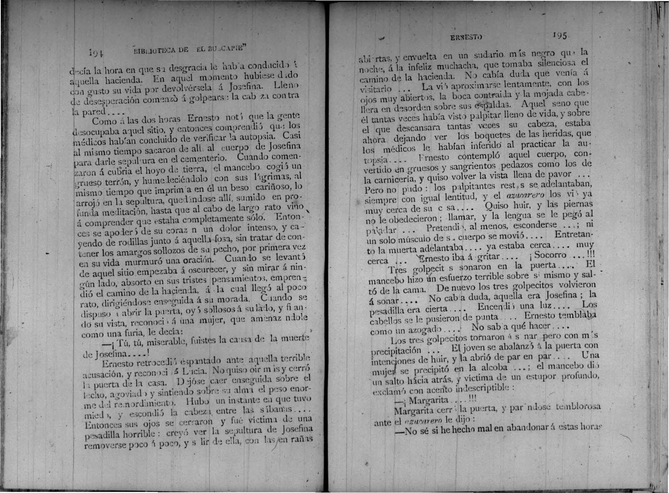 reflejos airaian, como un únan, las miradas de lj:&meralda. Asl pasó mucho rato, ellllimismada ; luelo volví'> 4 estar como antes . . . . recordó sus suel\os de virgen y por inYOluntaria abstracción la realidad, le pareció haber estado sallando al encadenar los sucesos de Ilos óltimos allos. Se acordü de sus padres, de su madre principalmente y entonces rezó •••• para hacerlo se lijó el Cristo acostado sobre el pecho de Ignacio ; clavapdo en él con fijeza la mirada. • • . ' De pronto l;llVo miedo .•• , El Cristo marfil le pareció qqe se ... fllOvia; en aquella el · flamear de los cirios. coo su luz amarillenta y daba cierta vague-ckd de contorno ;i todos los objectos ; las luces . ' ·multipl$:aban unas veces, •>tras se .reuni m : 11n un "•:Jr> !iOlo h4z• . Ct:rró lps ojos, pero al abrirlos de ,creyq también que el Cristo se movla . , Sus OJOS no le .no, el Cristo se estiraba, sus formas . ctee'aii llll&ta .confundirse con las .de Ignacio. de tal mod(i que la. de su era la del Crucificado. igual, el.color, iguales ugnosde sufrinuentos, la herida del costado dei;#lando ,sangre, con_la misma herida de su esposo . por se le hab'.a aquella vida, robusta horas aotes .. : Balbució sus oraciones. temblorosa, $11 saber lo que haca. El cuerto le daba vueltas, y el Cristo e-taba alli granc\e, resignado doliente aún. Hubo un momento en que creyó la imagen habría los ojos y \a 1t1irab;\ luego, se cerraban otra vez los pirpados, y ui¡a l'grima corria p<ilr el rostro amariile¡ito de aquel Cristo grande que la anonadaba. No pudo y cayo desmayada.