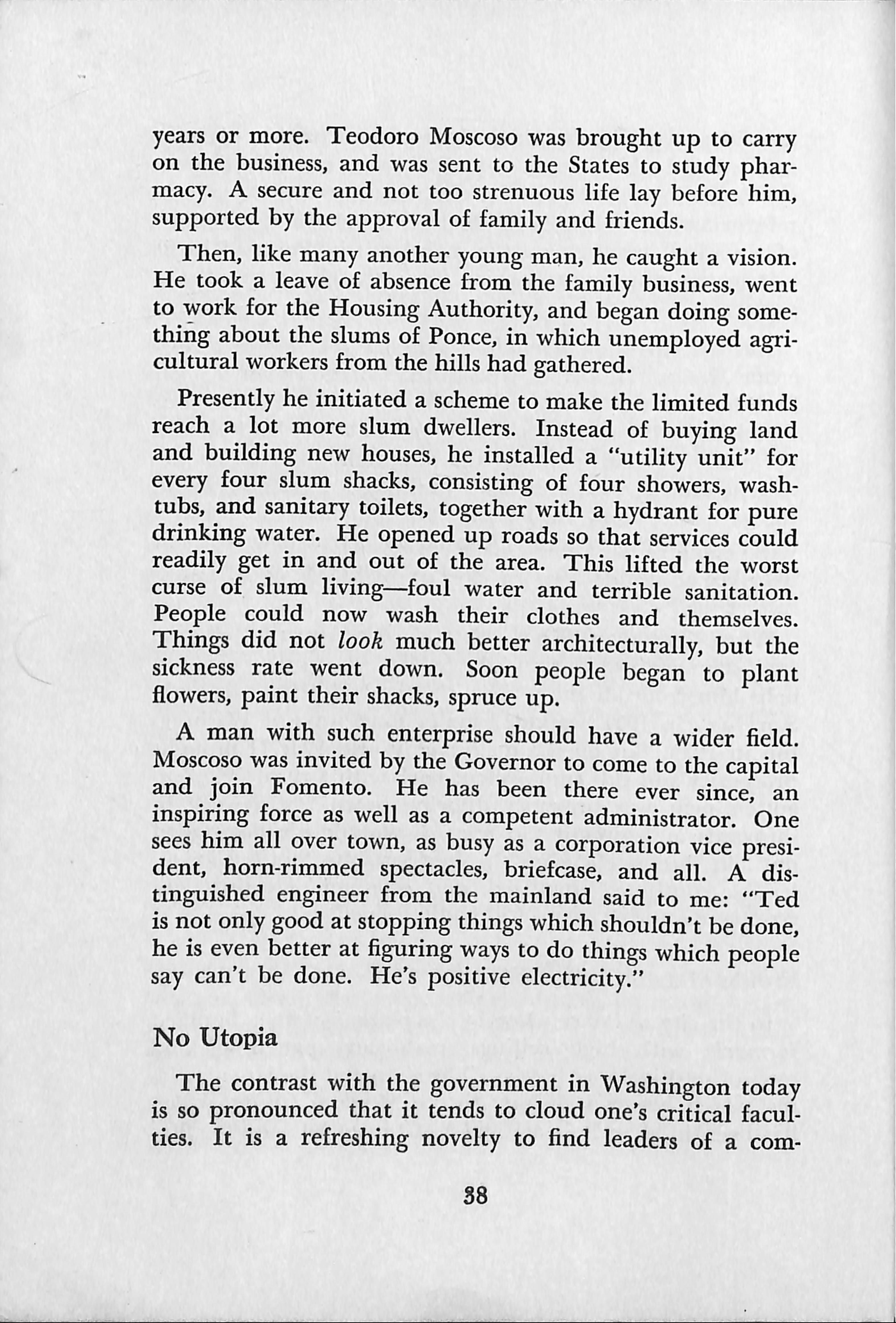 How different in Puerto Ricol Everywhere one goes, even in the high mountains, he sees new enterprise, new construction, new hope. One must constantly detour because of the new roads. Wherever he looks there is a new housing development, a new skyscraper, factory, airfield, concrete baseball park, renovated church, new hospital, school, or market. This rush of physical activity suggests a new determination, the antithesis of degradation and despair. It is not the declining slums that the visitor remembers, had as they still are, hut the new vocational school at Ponce, the new library at the University, the amazing new botéis, the Textron plant, the new hóuses which the government is huilding for the people of the slums.