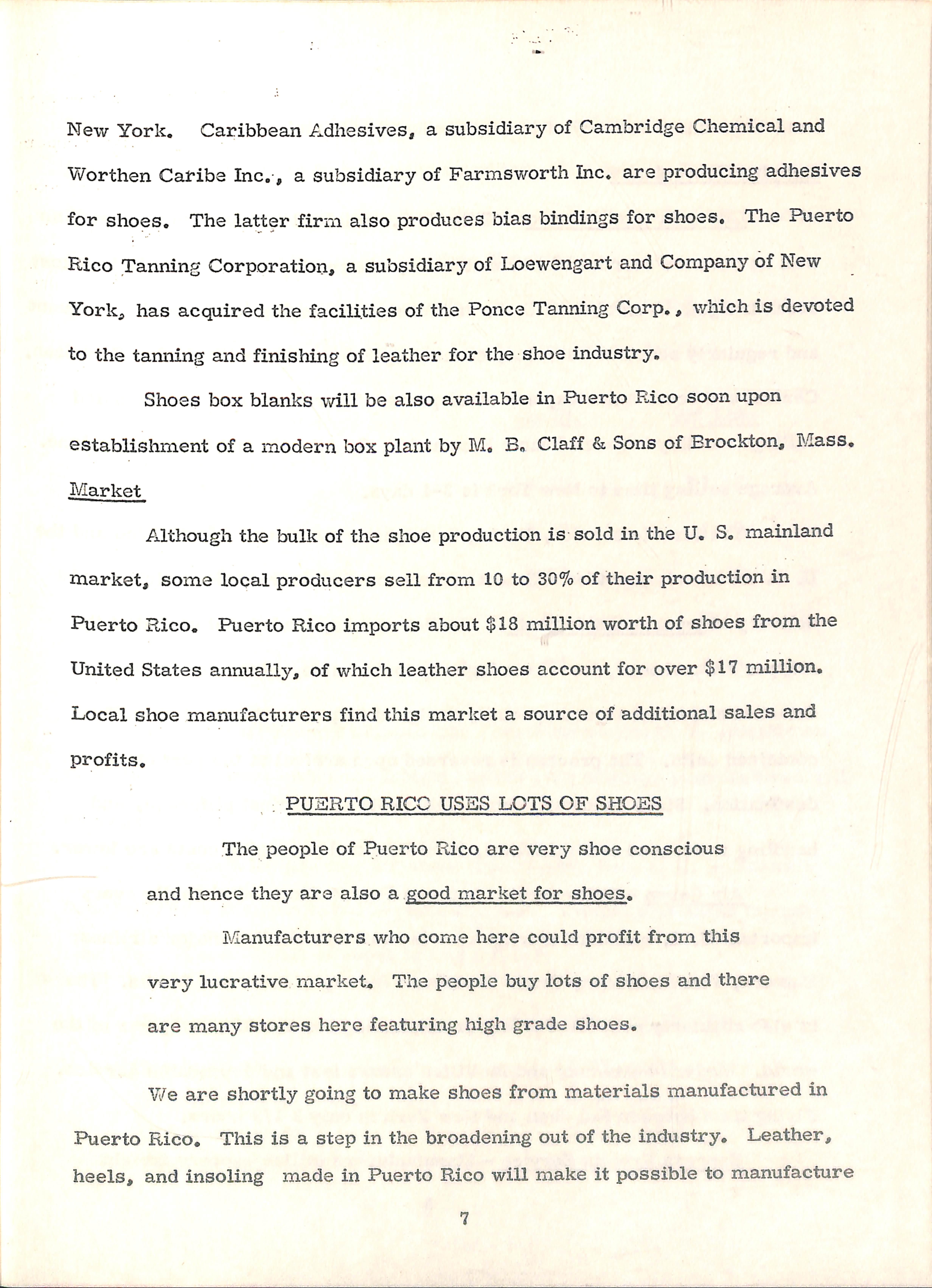 New York. Caribbean Adliesives, a subsidiary of Cambridge Chemical and Worthen Caribe Inc,-, a subsidiary of Farmsworth Inc. are producing adhesives for shoes, The latter firm also produces bias bindings for shoes, The Puerto Rico Tanning Corporation, a subsidiary of Loewengart and Company of New York-, has acquired the facilities of the Ponce Tanning Corp,, wMch is devoted to the tamiing and finishing of leather for the shoe industry,