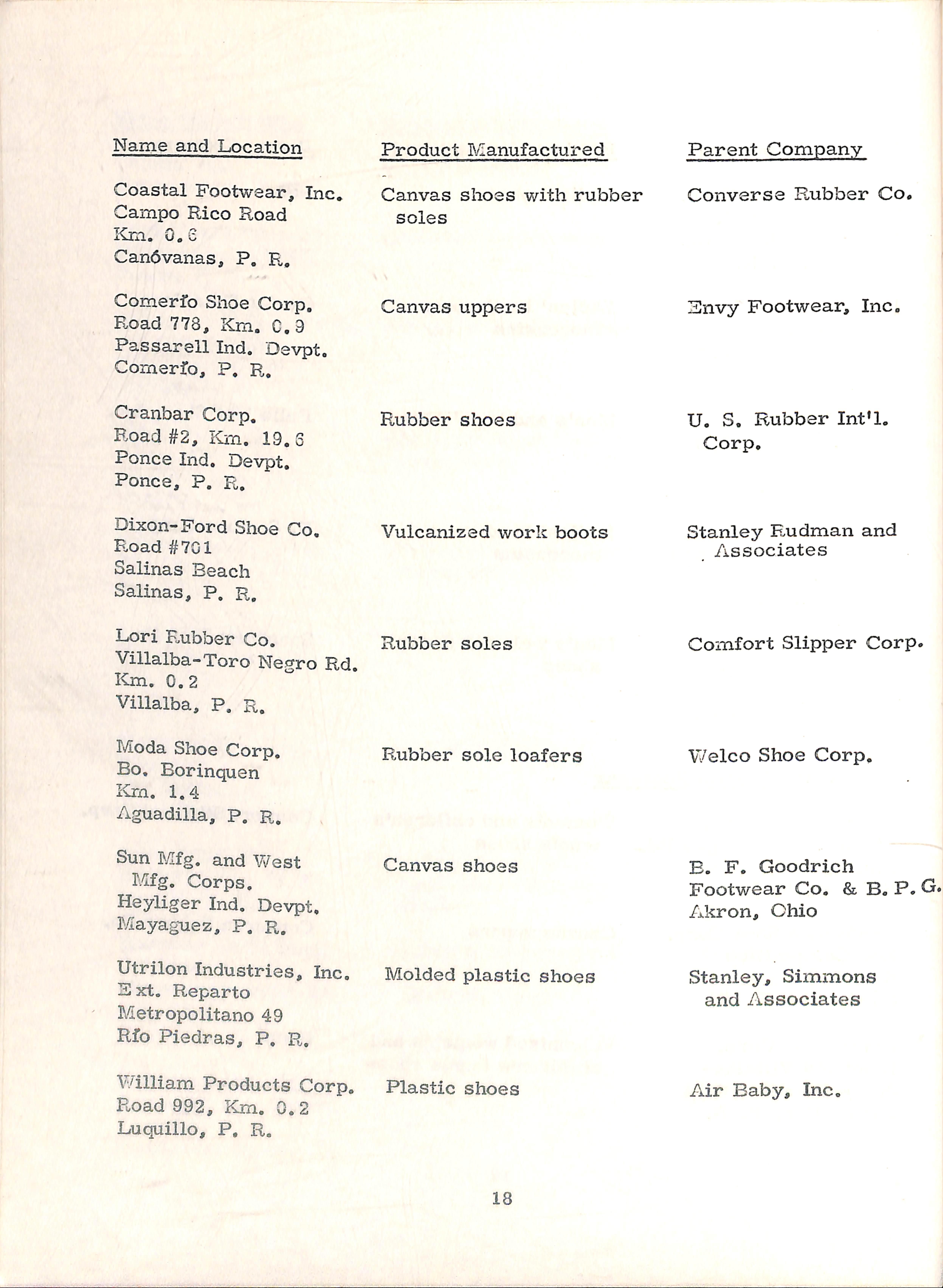 1, Seventeen mainland firms, including such leading firms as the International Shoe Corporation, U, S. Shoe Corp., and A, G. Spalding and Brothers, opérate 23 plants in Puerto Rico producing leather shoes,