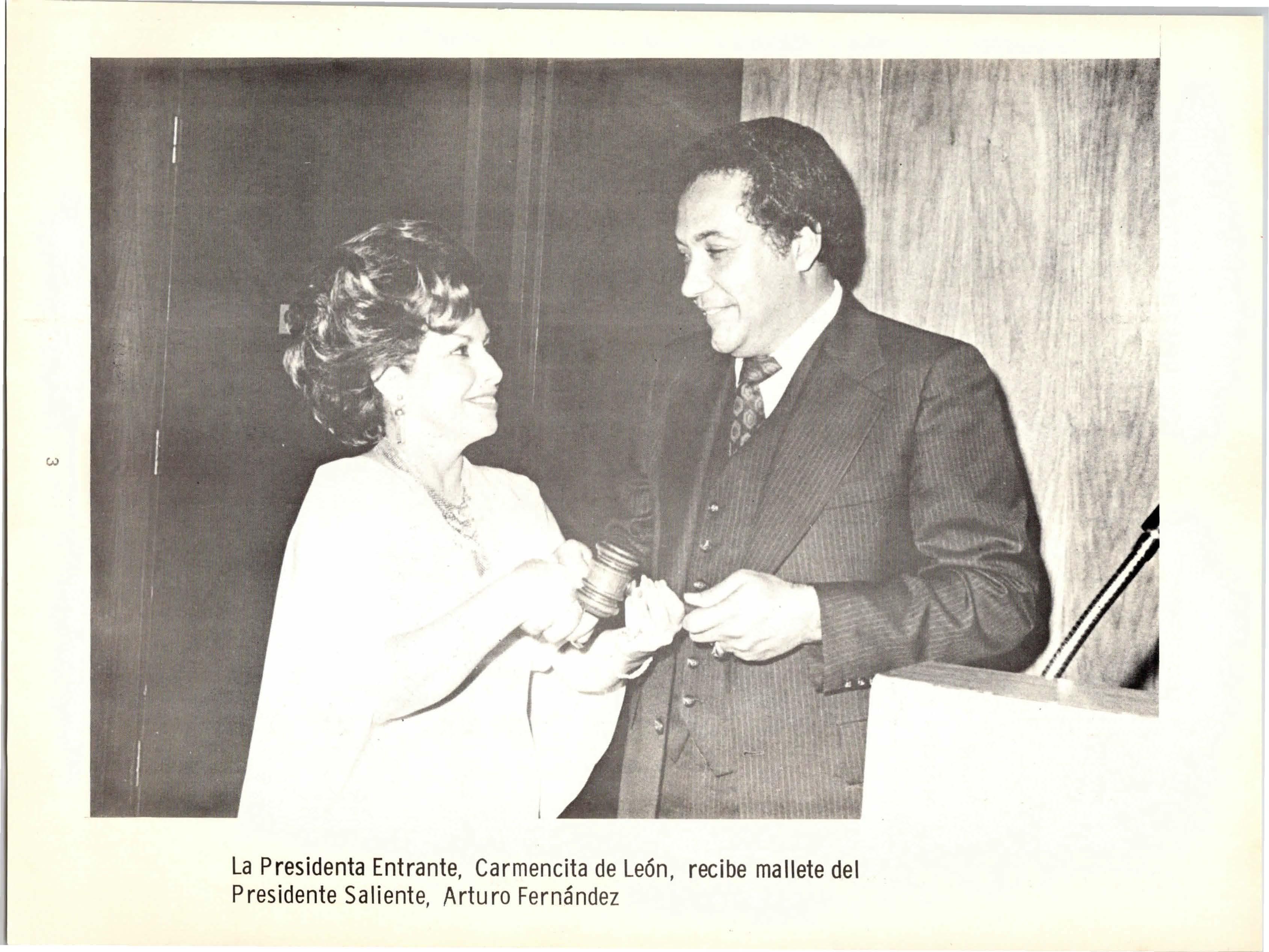 La Presidenta Entrante, Carmencita de Leon, recibe mallete del Presidente Saliente, Arturo Fernandez