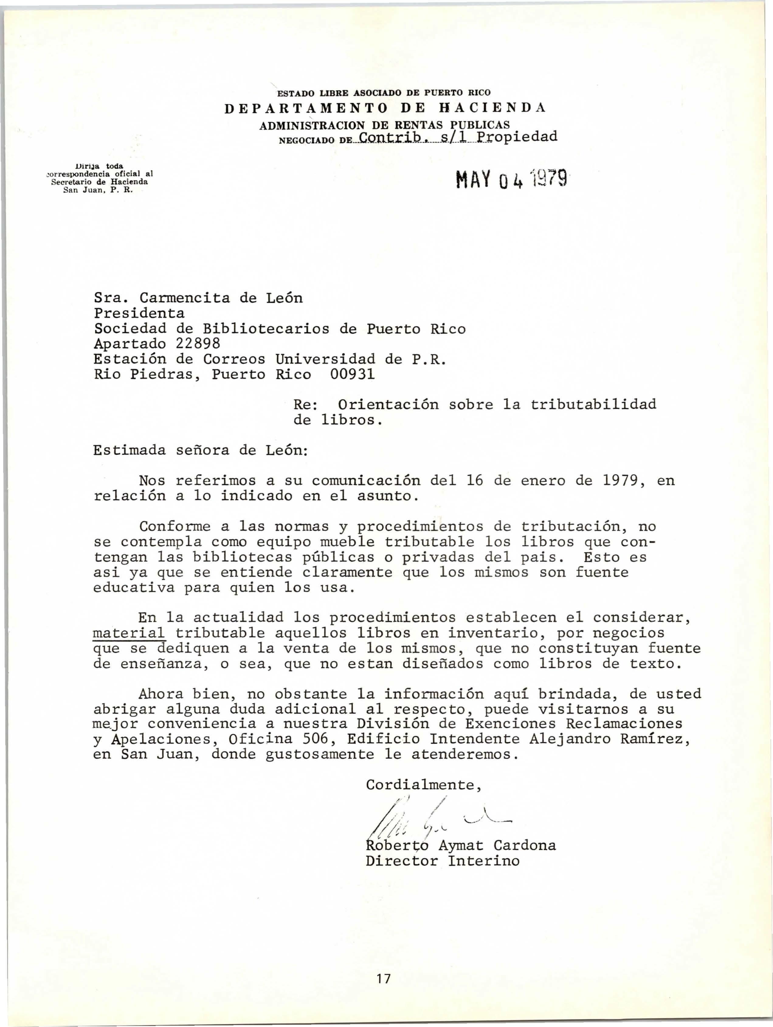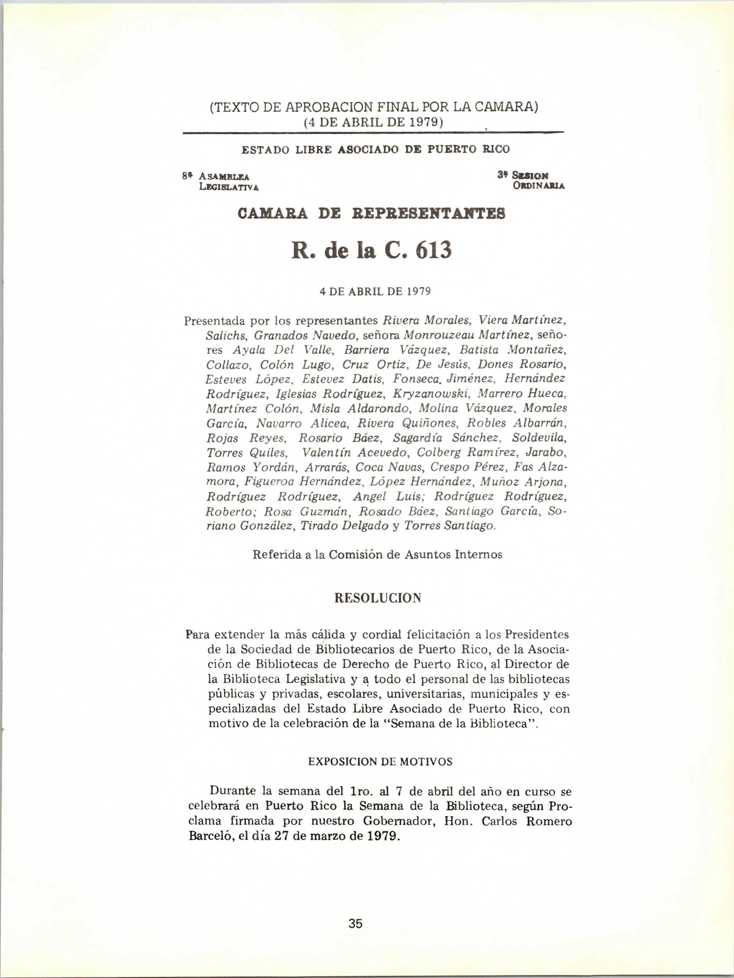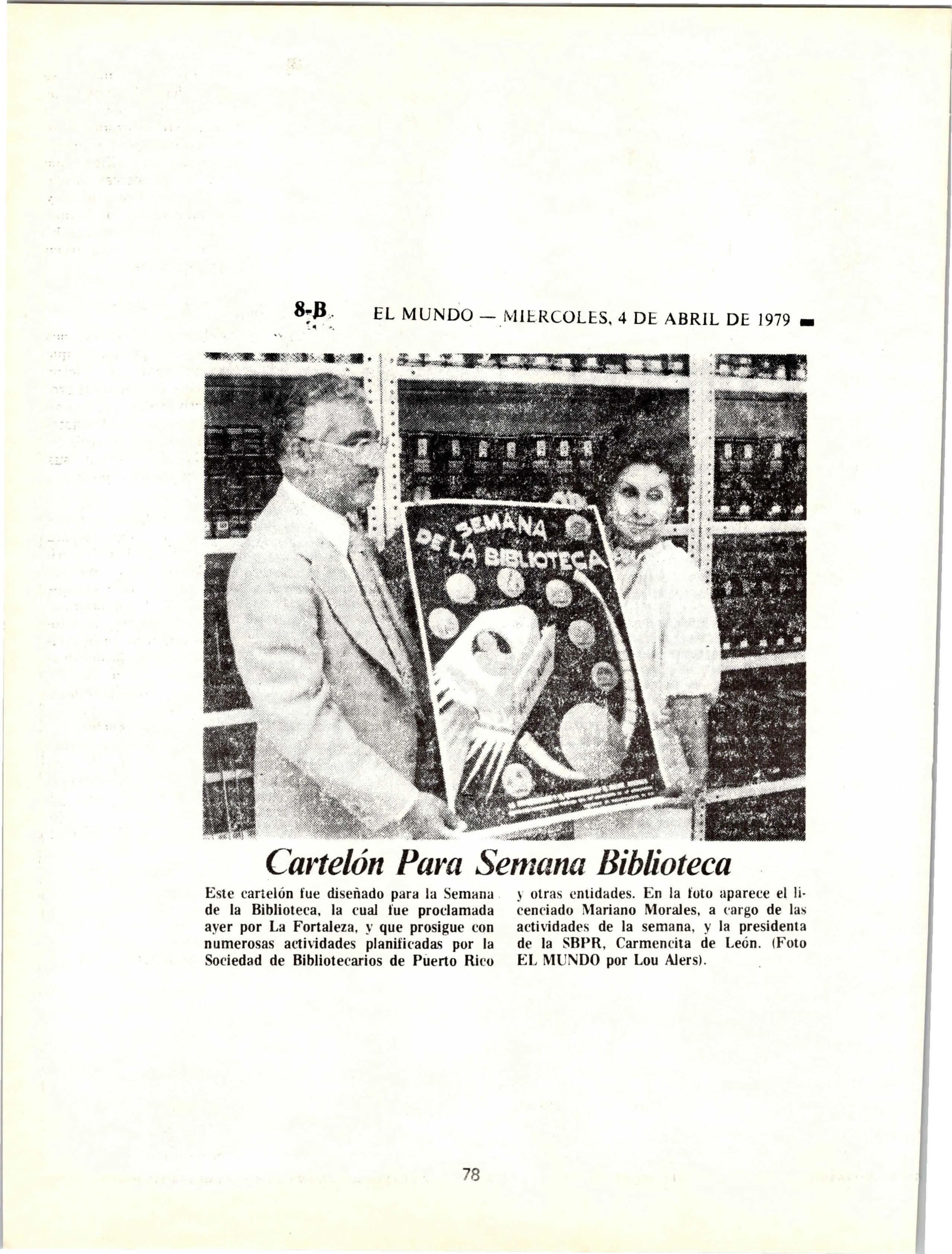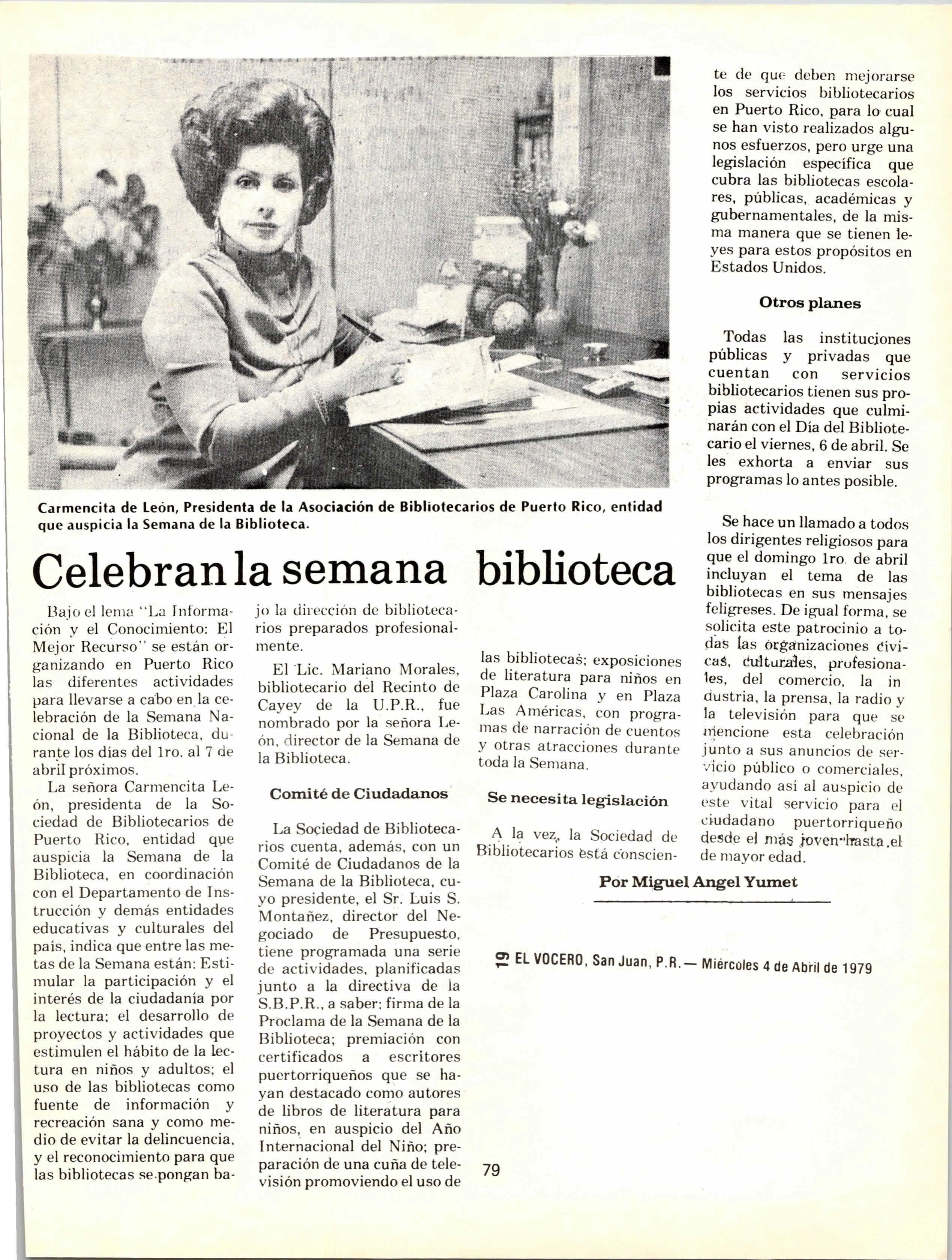 YO, CARLOS ROMERO BARCELO, Gobe/1.nadolL de Pue/Lto R-i.c.o, p11.oc.la.mo la. liemana del 1 al 7 de a.b-'1.-i.l de 19 79 c.omo la. Se.ma.na de la. 8-i.b.U o.te co., lj al ILUpalda/l la6 a.c..tlvhlo.du .tind.len.tu a 1Lec.onoc.eJ1. la. ,impo-'l..tanc..la. IJ el va.loll del 6 eJLv-i.c..lo b-i.b.Uo.teco.Ji.-i.o, exholL.to a. .toda la. c.omu.n-i.dad a. pM.t-i.c..lpall en u.ta c.eleb11.ac..l6n.