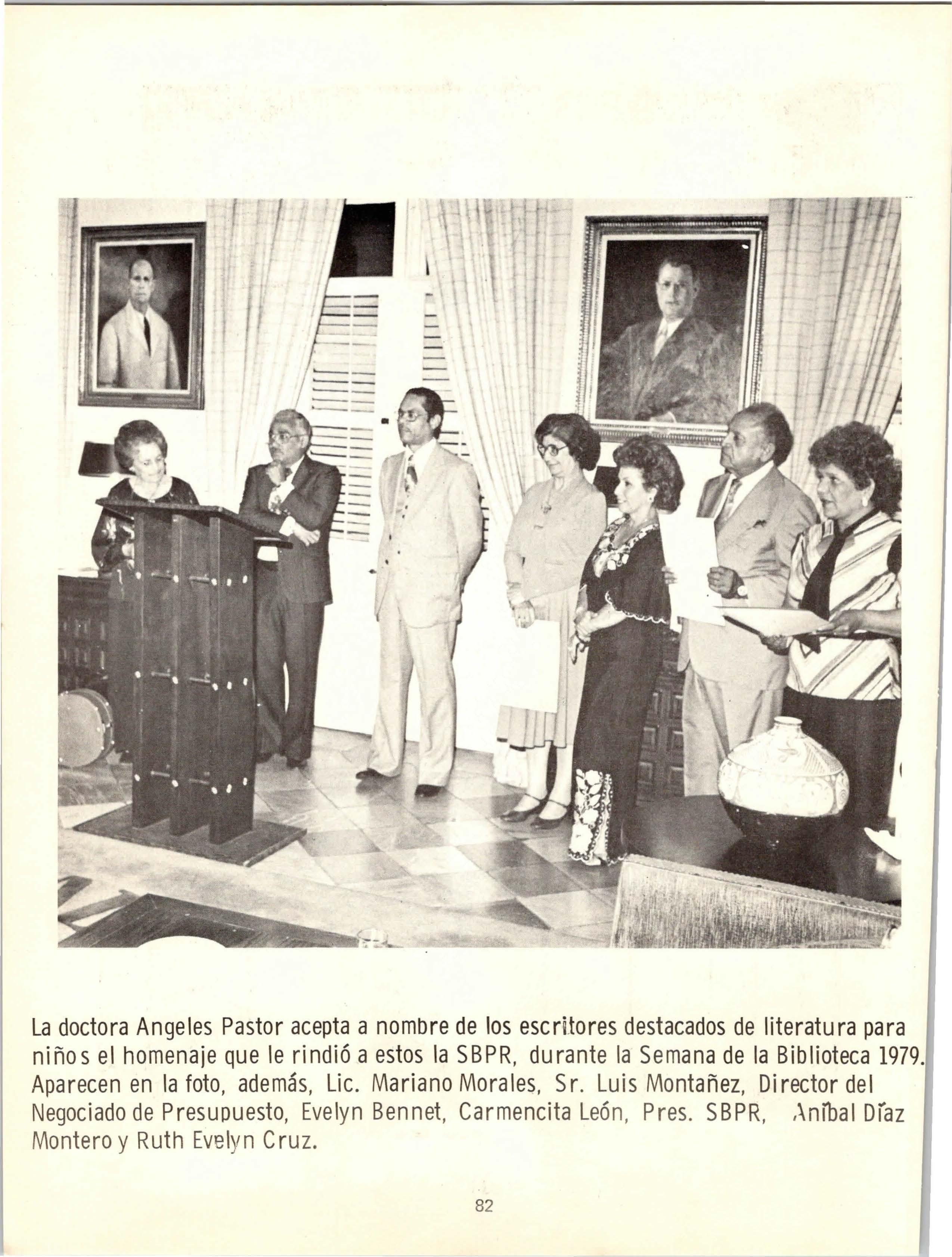 La doctora Angeles Pastor acepta a nombre de los escrUores destacados de literatura para niiios el homenaje que le rindi6 a estos la SBPR, durante la Sem ana de la Biblioteca 1979. Aparecen en la foto, ademas , Lie. Mariano Morales, Sr. Luis Mont anez , Di rec t or del Negocia do de Presup uesto , Evelyn Bennet, Carmencita Le6n , Pres. SBPR, ,\nibal Diaz Montero y Ruth Evelyn Cruz.