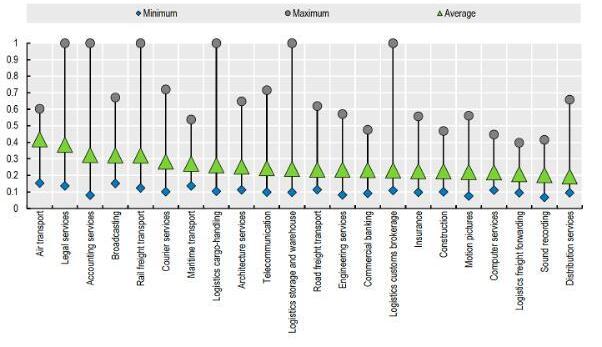 Puede haber barreras no tarifarias que afectan el comercio en los servicios digitales y generales. Se evaluaron el Índice de Restricciones al Comercio de Servicios (STRI por sus siglas en inglés) y el STRI para los servicios digitales. Estos índices catalogan y cuantifican las barreras no tarifarias que afectan el comercio de servicios y los digitales en 80 economías para 19 sectores principales (por ejemplo, servicios de computadoras, servicios profesionales, telecomunicaciones, servicios audiovisuales, financieros, y de logística). Su valor fluctúa entre 0 y 1, con 0 denotando completa apertura y 1 la ausencia de apertura (completamente cerrada) a proveedores extranjeros de servicios.