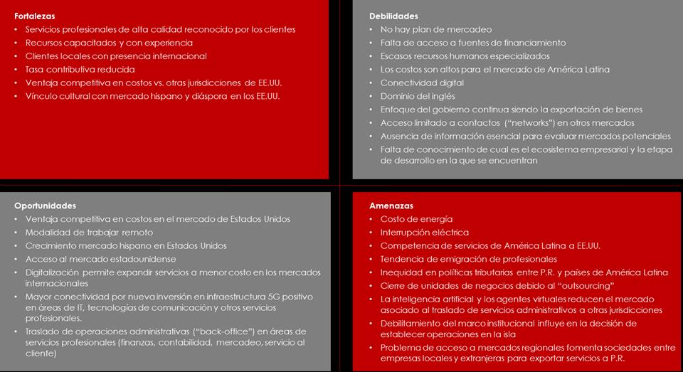 Como parte importante del estudio para establecer las bases para expandir las exportaciones de servicios se realizó un análisis de FODA. El insumo de información para la preparación del análisis fueron los hallazgos de los primeros dos informes (Etapa I y II), incluyendo, por ejemplo, la evaluación de mejores prácticas en otras jurisdicciones, la legislación de incentivos aplicable a la exportación de servicios, las entrevistas realizadas a ejecutivos experimentados de varias empresas que exportan servicios, y los acuerdos comerciales que inciden sobre la exportación de servicios.