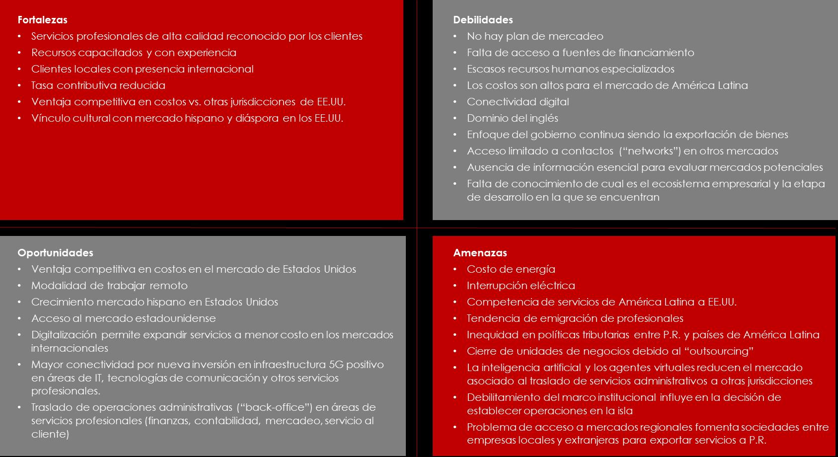 A continuación, se presentan los resultados del análisis para cada uno de los componentes del FODA. El análisis de FODA se presenta en una tabla o matriz con 4 cuadros lo cual permite entender los resultados de una forma sencilla y práctica. Las fortalezas identificadas incluyen la disponibilidad de mano de obra capacitada, con experiencia y caracterizada por proveer buena calidad de servicios. Además, se identificó como una fortaleza importante el acceso en el mercado local a clientes con presencia internacional. Esto permite a las empresas locales apalancarse en la relación comercial existente con estos clientes para ganar acceso otros mercados Si bien la Ley #60 ha permitido reducir costos contributivos que han sido reinvertidos en la operación de las empresas, la ventaja en costos relativo a empresas estadounidenses que operan