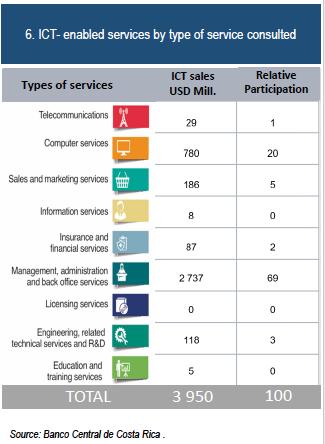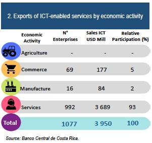 • Los servicios TIC exportados se han concentrado en el desarrollo de programados (softwares) para los procesos de administración de negocios, en particular a mercados de Europa Oriental y Asia. La exportación de estos servicios desde Costa Rica ha estado facilitada por la red extensa de telecomunicaciones interna y externa, y por la comunidad de desarrolladores de programados, en donde ocupa la posición número dos en la región