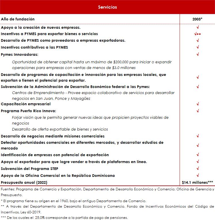 • Las jurisdicciones no tienen un programa dirigido específicamente a la exportación de servicios (exceptuando hasta cierto punto California, Florida y Texas que incluyen bienes), aunque también las promueven, haciendo a Puerto Rico algo particular. Al igual que los estados, el PCE de Puerto Rico hace uso también de los programas federales (menos el EXIM Bank).