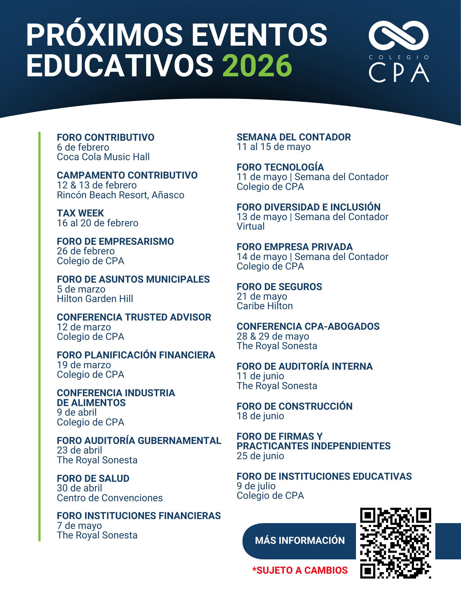 En el área de Educación Continuada, hemos dado continuidad a nuestro amplio y diverso calendario de eventos. Actualmente, estamos organizando el XXXVII Foro Contributivo, que este año tendrá como sede el Coca-Cola Music Hall. Este importante evento servirá de espacio para discutir la propuesta de Reforma Contributiva presentada por la gobernadora, Hon. Jenniffer González, el pasado 12 de enero y que actualmente se encuentra en el proceso de vistas públicas en la Legislatura. Cabe destacar que el 21 de enero presentamos nuestra ponencia oficial en el Senado y el 26 de enero en la Cámara, en la cual expusimos nuestra posición ante cada una de las enmiendas propuestas. Desde que se presentó la propuesta, el Colegio ha mantenido una presencia activa en los medios de comunicación, orientando a la comunidad y aportando al análisis de esta importante medida.