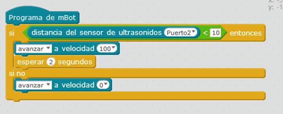 Con estos bloques de programación realizados en el software Lego Wedo 2.0, los estudiantes controlan el carro de tal manera que cuando el sensor de proximidad detecta un obstáculo el carro retrocede, cuando no detecta obstáculos el carro avanza.