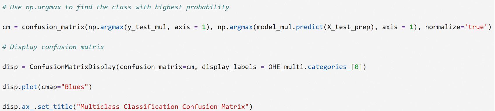 The process for generating the confusion matrix in the multiclass task closely mirrors that of the binary case. We use the same “confusion_matrix” function with normalized output and pass the resulting object to ConfusionMatrixDisplay. The key difference lies in the inclusion of all four category names, retrieved from the OneHotEncoder used in preprocessing, instead of just two. The plot method is then called to visualize the matrix, providing a comprehensive view of the model’s performance across all four classes (Figure 26).