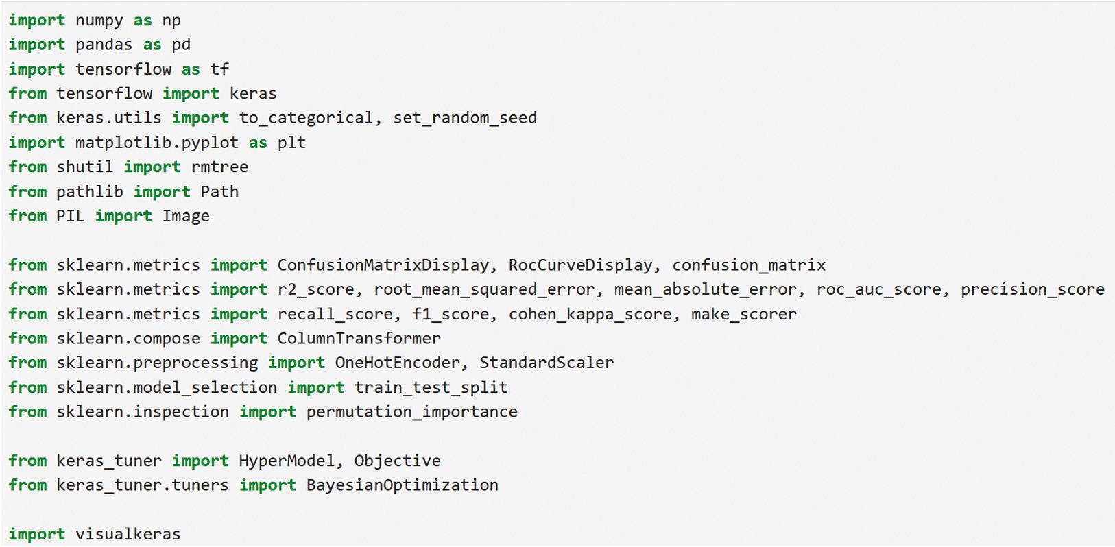 The script begins by importing essential libraries. We will use “numpy” for numerical operations and array handling, and “pandas” for managing DataFrames; “tensorflow” and “Keras” will be employed to build and train the neural network models. “Matplotlib” will then be used to generate plots and visualizations. The script also imports “shutil” for file operations and “pathlib” for working with files and directories. For evaluating model performance, different functions and options of “scikit-learn” library provides various metrics and model selection tools. Finally, “keras_tuner”, including HyperModel and BayesianOptimization, is included for hyperparameter tuning (Figure 1).